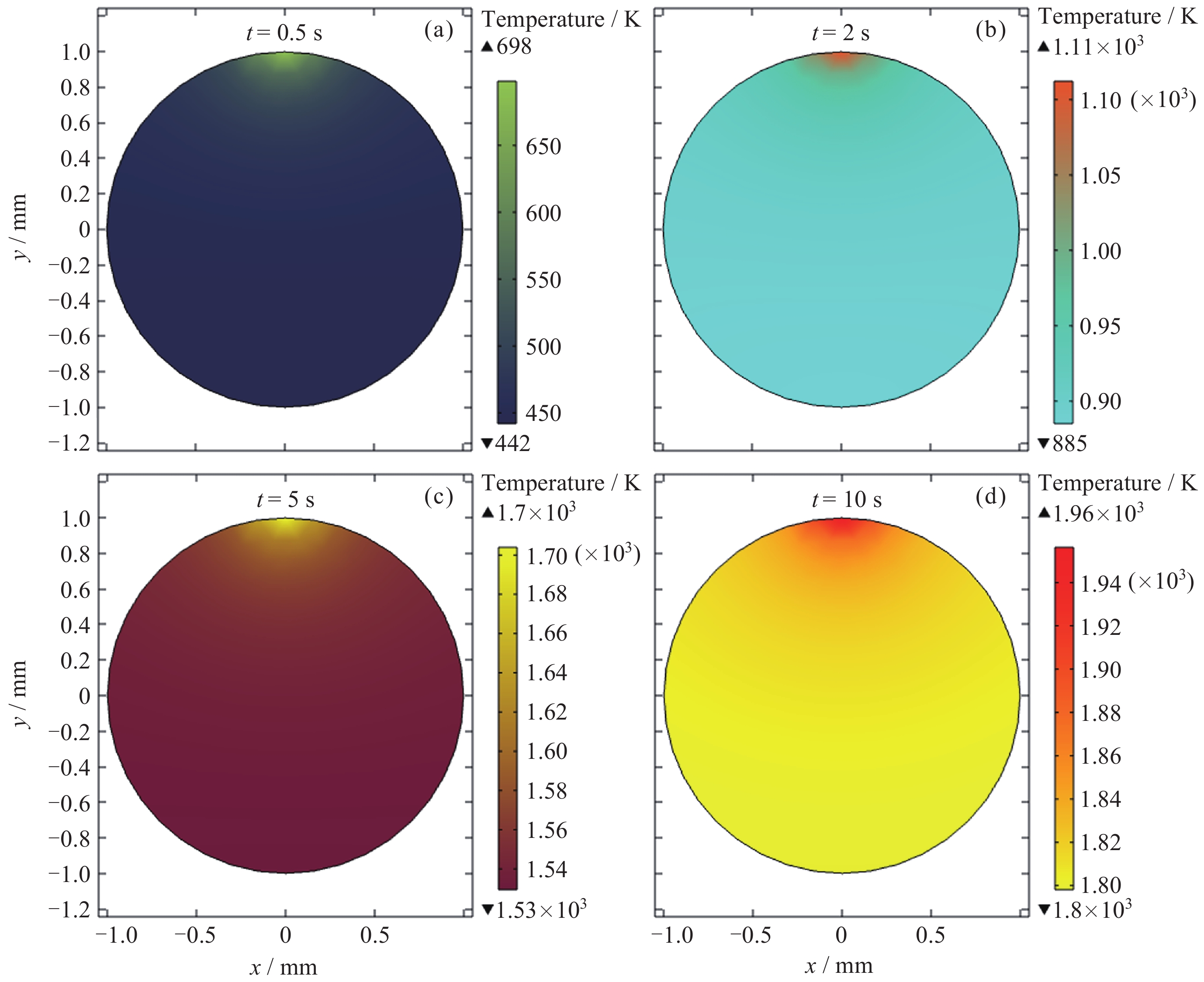 通过激光脉冲在样品表面局部区域形成温度梯度, 引起实验样品内部结构起伏和能量起伏概率加大, 程度加深, 使晶体从熔融的液相亚稳态相变为固相, 实现静电悬浮下高质量可控深过冷激光脉冲触发形核. 通过有限元模拟仿真方法研究不同加热激光束斑直径, 功率为9 W, 功率密度为$ 2.86\times {10}^{8}\;\mathrm{W} \cdot {\mathrm{m}}^{-2} $和$ 1.146\times {10}^{7}\;\mathrm{W} \cdot {\mathrm{m}}^{-2} $的激光对温度梯度场的影响, 得到不同激光束斑直径下熔融样品局部温度梯度场分布结果. 采用直径为2 mm锆材料样品, 研究在较小激光束斑直径下, 不同的激光脉冲宽度与过冷度熔融材料样品触发形核时间尺度变化. 基于经典形核理论, 通过16组不同过冷度, 每组20次自发形核的数据统计分析, 得到锆材料样品在不同过冷度下从母相熔体的亚稳态向固相移动所需时间的变化关系. 在此基础上, 开展激光脉冲束斑直径为0.2 mm的波长为936 nm, 样品为锆材料激光脉冲触发形核实验研究. 实验结果表明, 锆材料在过冷度为195 K ± 3 K, 样品形核凝固过程中所需的时间比自发形核所需时间降低3/4, 高质量可控地使熔融样品在不同过冷度下触发形核.