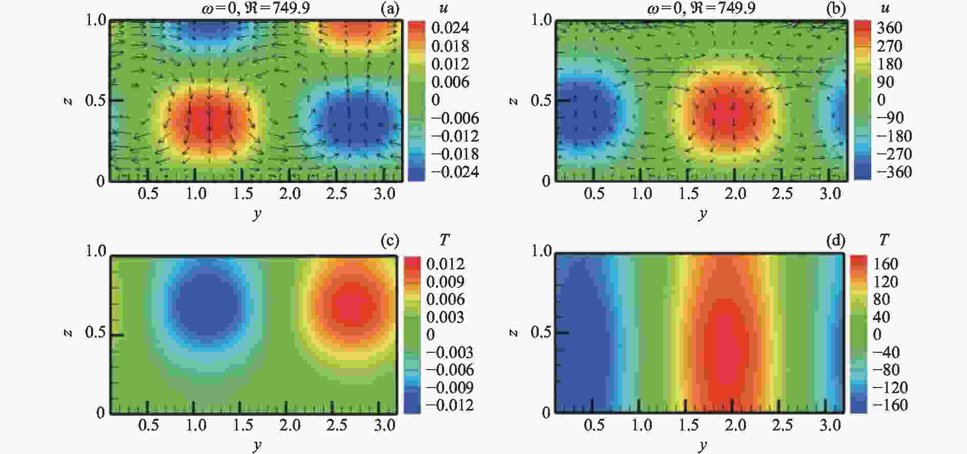 $ \phi = {90^ \circ } $ 扰动放大对应的扰动场。(a) 输入速度场,(b) 输出速度场,(c) 输入温度场,(d) 输出温度场Figure 8. Perturbation fields corresponding to the response for the linear flow at Pr=0.002, Ma=3, k=2,