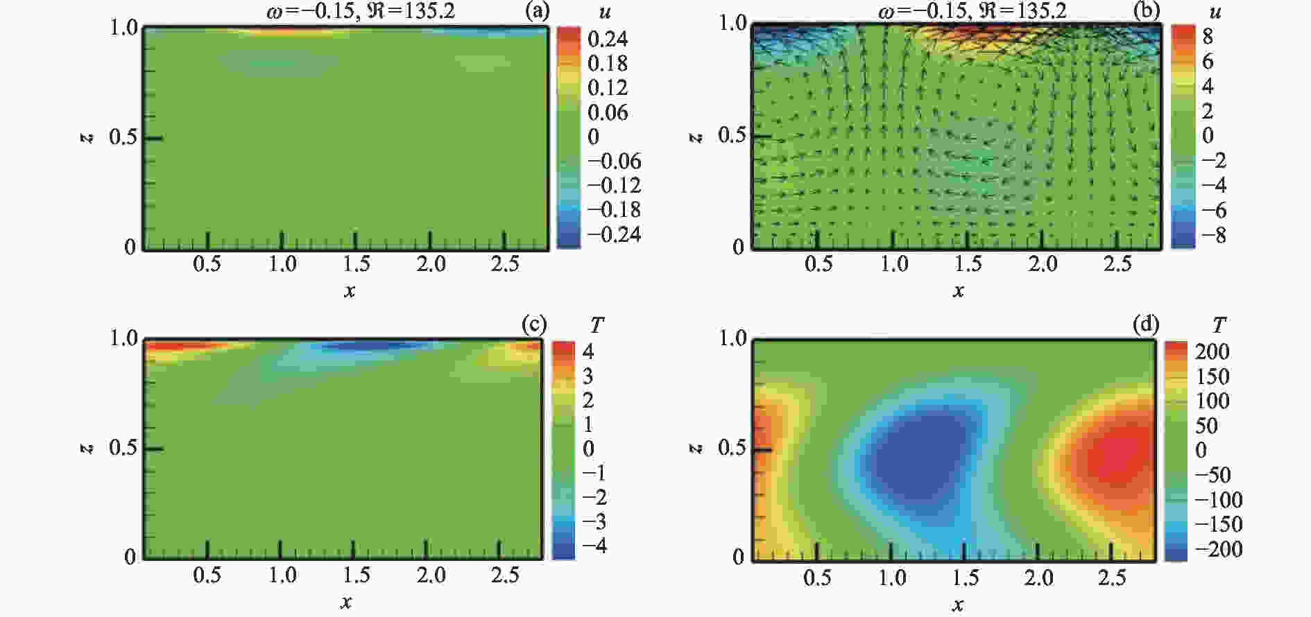 $ \phi = {0^ \circ } $ 扰动放大对应的扰动场。(a) 输入速度场,(b) 输出速度场,(c) 输入温度场,(d) 输出温度场Figure 9. Perturbation fields corresponding to the response for the return flow at Pr=150, Ma=300, k=2.3,