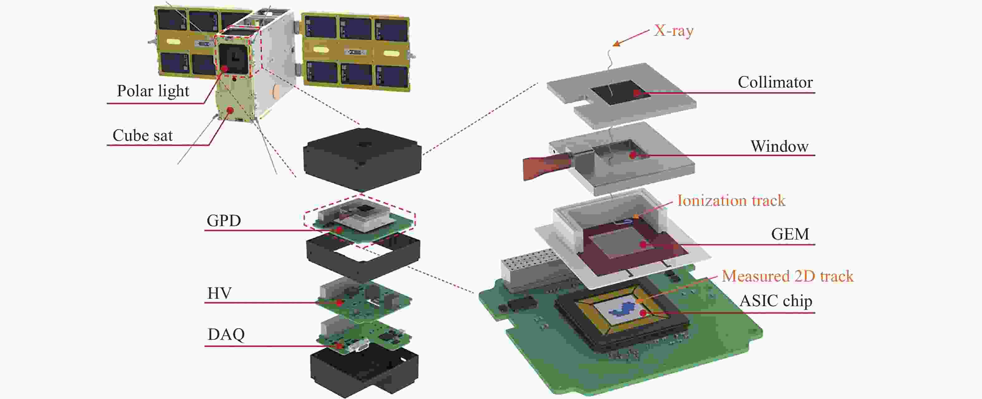 Energy range 2–8 keV Energy resolution 19% @ 6 keV Field of view 2.3° FWHM or 5.7° FWZR Gas mixture pure DME at 0.8 atm, 1 cm thick Window 100 μm beryllium GEM 100 μm pitch and 100 μm thick ASIC 50 μm pitch Modulation factor 0.42 @ 3.74 keV Weight 580 g Power 2.2 W Size 1 U (about 10 cm × 10 cm × 10 cm) Table 5. Specifications of GRID