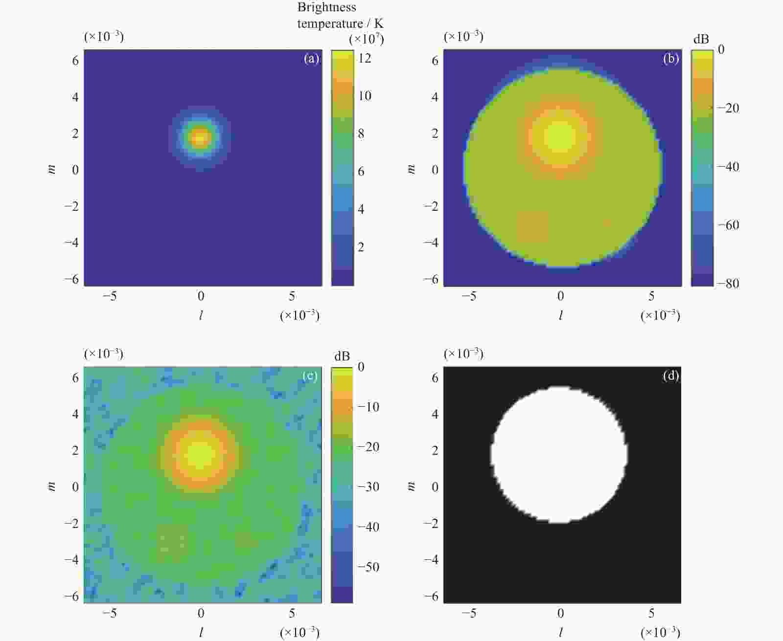 图 2 基于数值模拟源的干涉成像实验。(a)基于数值模拟的模型图像,(b)模型图像(a)的dB形式,(c)可见度函数添加不相关噪声之后的反演脏图,(d)感兴趣区域