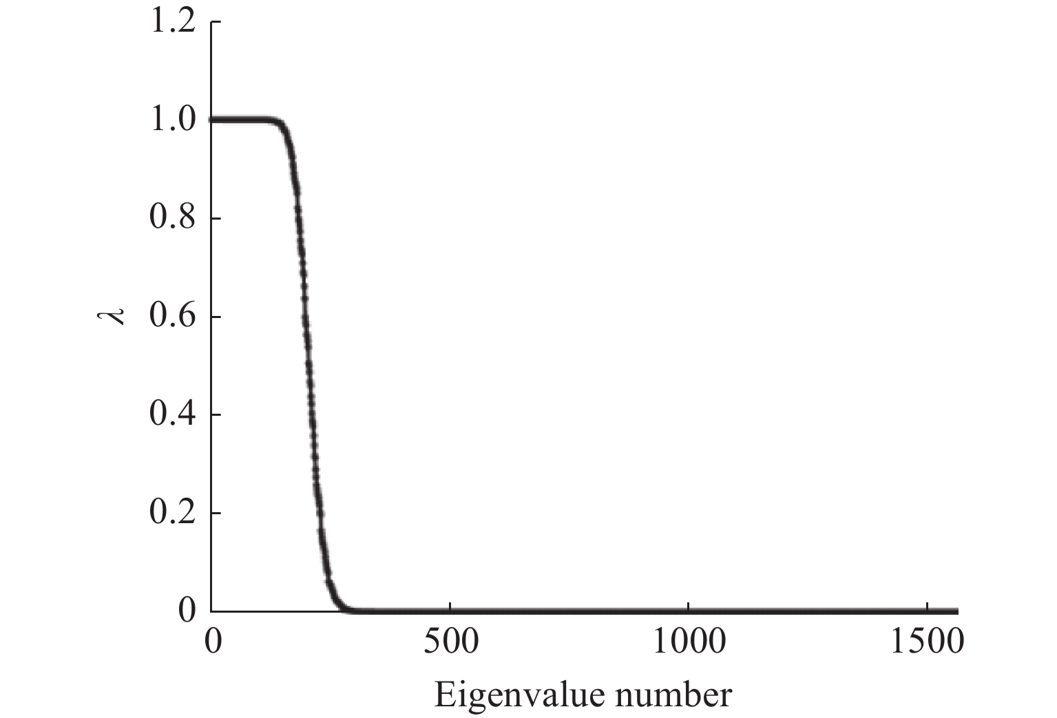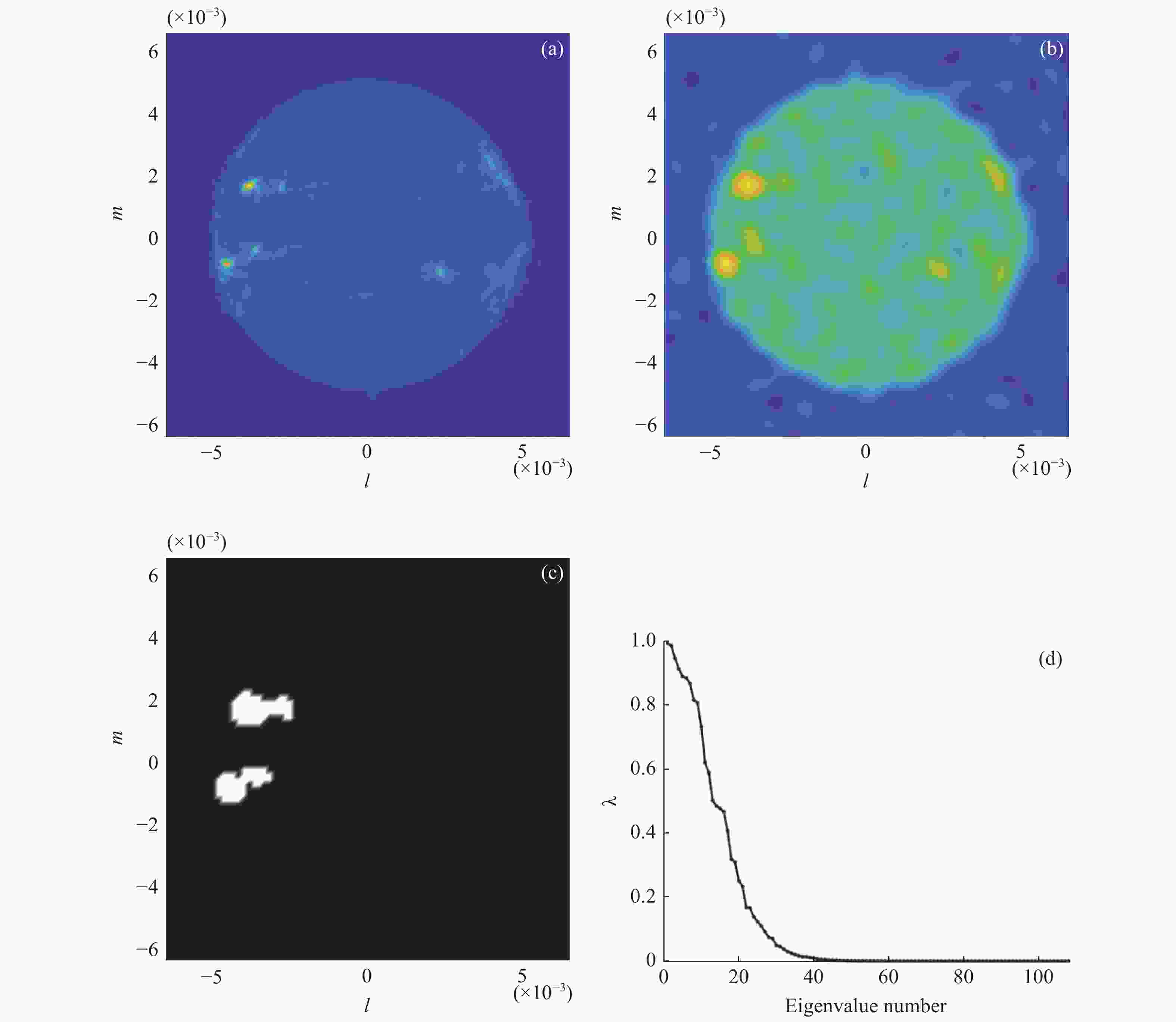 图 8 基于NoRH观测数据的干涉成像实验。(a)基于NoRH观测数据的模型图像,(b)可见度数据添加不相关噪声之后所反演的脏图,(c)ROI,(d)特征值分布情况