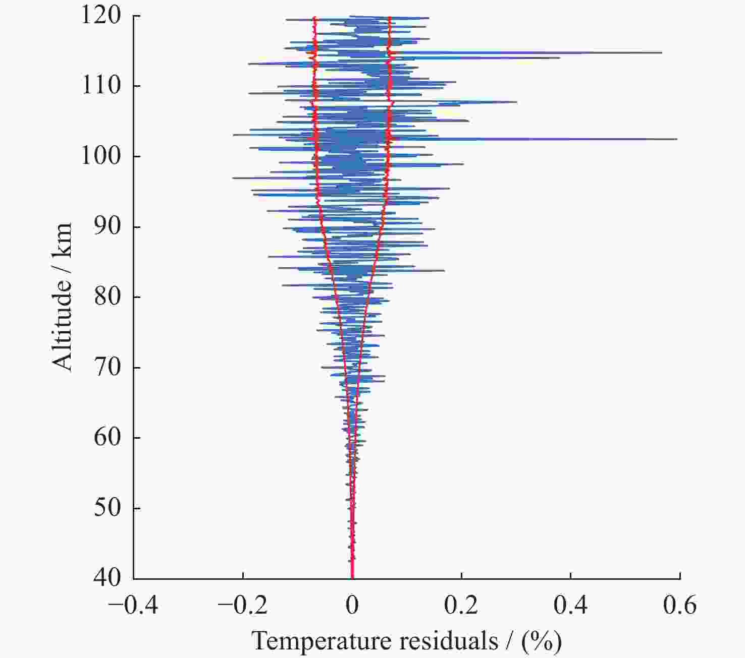 图  13  正向模型与测量值的残差(蓝色曲线是反演状态的正向模型测量值与实际测量值的百分比偏差,红色曲线是测量不确定度占测量值得百分比重)