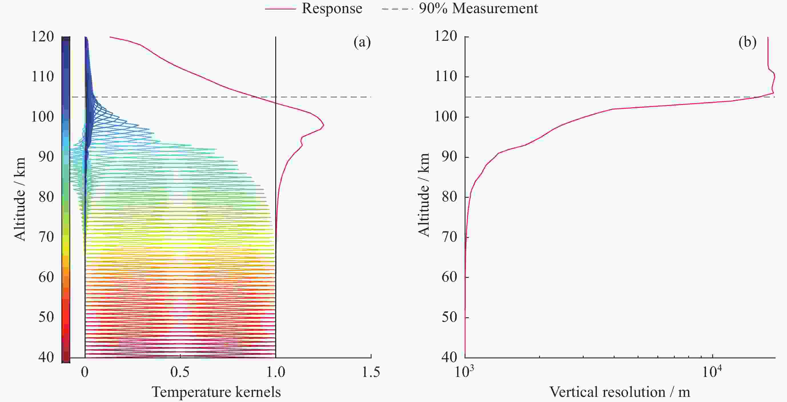 图  14  实测数据反演温度廓线的平均核矩阵(a)和垂直分辨率(b)