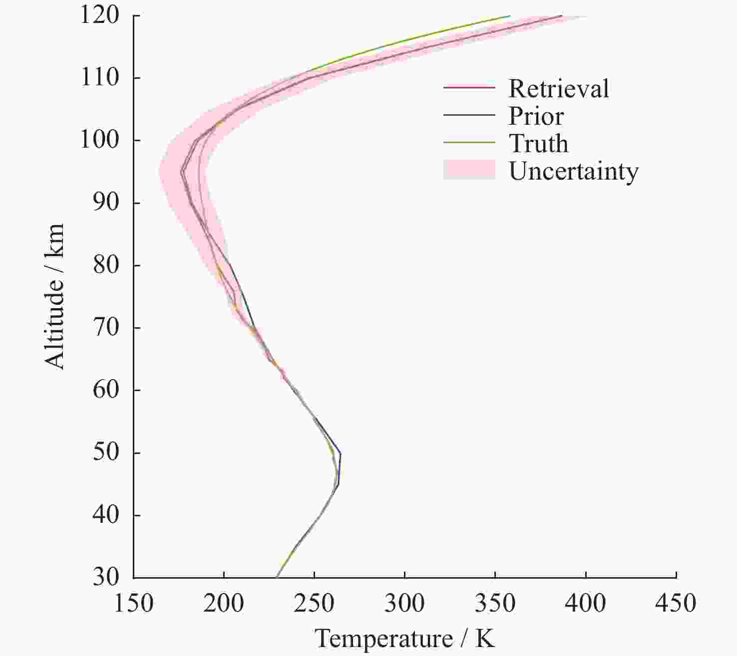 • 摘要: 基于瑞利激光雷达的回波光子信号对中层大气进行探测,结合最优估计法,对大气温度进行反演。本文基于瑞利散射激光雷达方程建立正向模型,选择大气模型的温度廓线作为先验状态信息,构建用于最优化处理的成本函数,利用Levenberg-Marquardt最优化算法对成本函数执行最优化处理,得到大气温度的反演结果,对反演结果的不确定度分析的同时利用平均核矩阵对反演结果中真实信息的贡献进行评估。利用瑞利激光雷达方程产生的模拟回波信号进行了大气温度的反演处理与分析,对中国科学院国家空间中心提供的瑞利激光雷达实测数据进行大气温度的最优估计反演。结果表明,90 km以下的反演不确定度在10 K以内,且相较于CH方法,最优估计法具有反演有效范围高的优势;在回波光子信噪比较高的区域,反演不确定度较小,且真实信息对反演结果的贡献占主导地位。