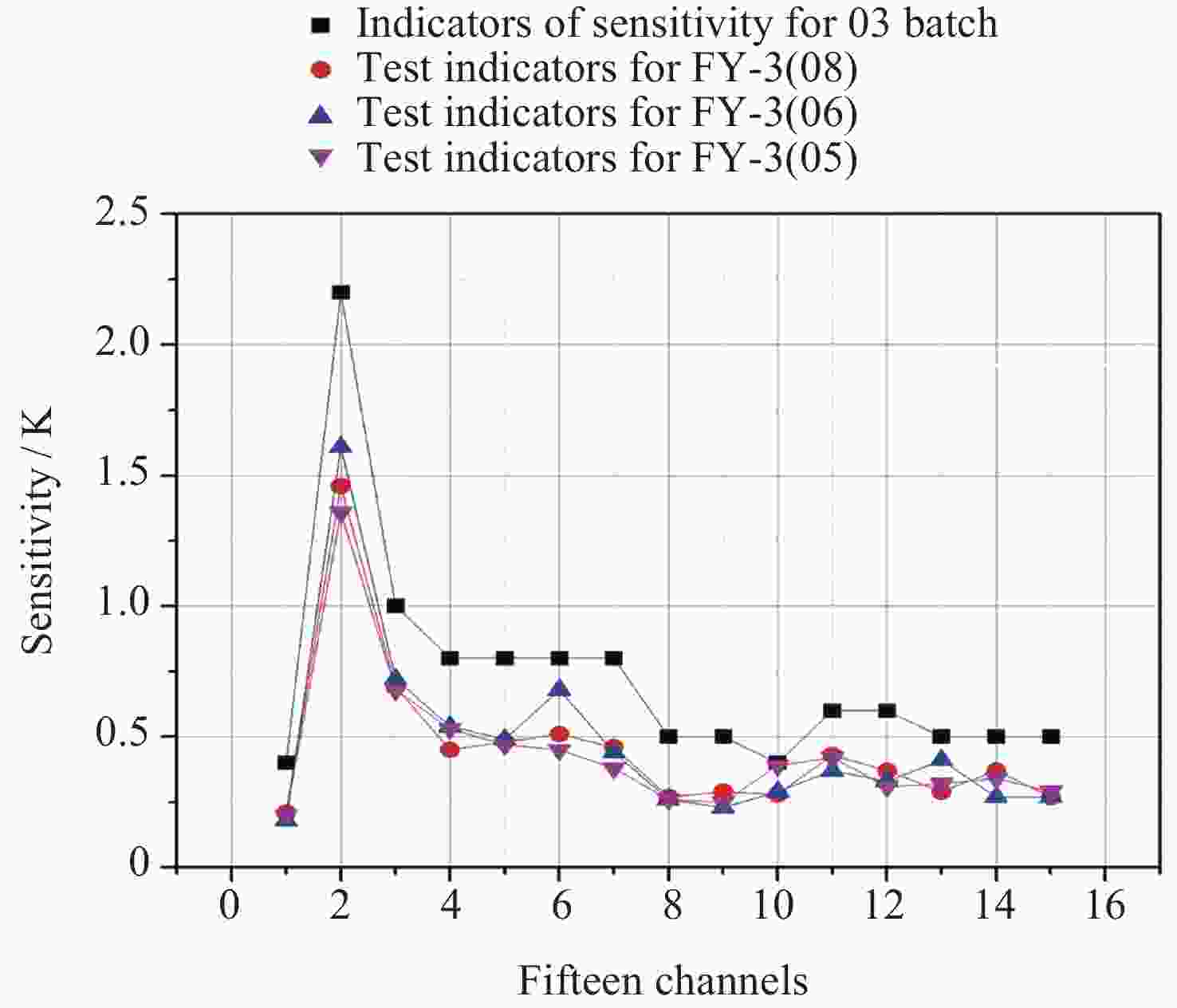 指标/K实测值/K 02批 03批 灵敏度 定标精度 灵敏度 定标精度 灵敏度 定标精度 1 89.0 V 1500 2.0±0.2 ≤0.4 ≤1.0/0.8 0.23 0.51 0.14 0.23 2 118.75±0.08 H 20 2.0±0.2 ≤2.2 ≤2.4/2.2 1.60 1.65 0.92 1.24 3 118.75±0.2 H 100 2.0±0.2 ≤1.0 ≤1.2/1.0 0.64 0.71 0.46 0.65 4 118.75±0.3 H 165 2.0±0.2 ≤0.8 ≤1.2/1.0 0.51 0.74 0.35 0.51 5 118.75±0.8 H 200 2.0±0.2 ≤0.8 ≤1.2/1.0 0.50 0.59 0.32 0.48 6 118.75±1.1 H 200 2.0±0.2 ≤0.8 ≤1.0/0.8 0.50 0.59 0.30 0.46 7 118.75±2.5 H 200 2.0±0.2 ≤0.8 ≤1.0/0.8 0.46 0.53 0.28 0.44 8 118.75±3.0 H 1000 2.0±0.2 ≤0.5 ≤1.0/0.8 0.23 0.38 0.16 0.31 9 118.75±5.0 H 2000 2.0±0.2 ≤0.5 ≤1.0/0.8 0.18 0.32 0.14 0.30 10 166.0 V 1500 1.1±0.11 ≤0.4 ≤1.0/0.8 0.30 0.43 0.22 0.33 11 183.31±1 H 500 1.1±0.11 ≤0.6 ≤1.0/0.8 0.46 0.51 0.26 0.42 12 183.31±1.8 H 700 1.1±0.11 ≤0.6 ≤1.0/0.8 0.35 0.41 0.21 0.36 13 183.31±3 H 1000 1.1±0.11 ≤0.5 ≤1.0/0.8 0.28 0.35 0.19 0.35 14 183.31±4.5 H 2000 1.1±0.11 ≤0.5 ≤1.0/0.8 0.27 0.57 0.18 0.34 15 183.31±7 H 2000 1.1±0.11 ≤0.5 ≤1.0/0.8 0.21 0.46 0.18 0.34 -