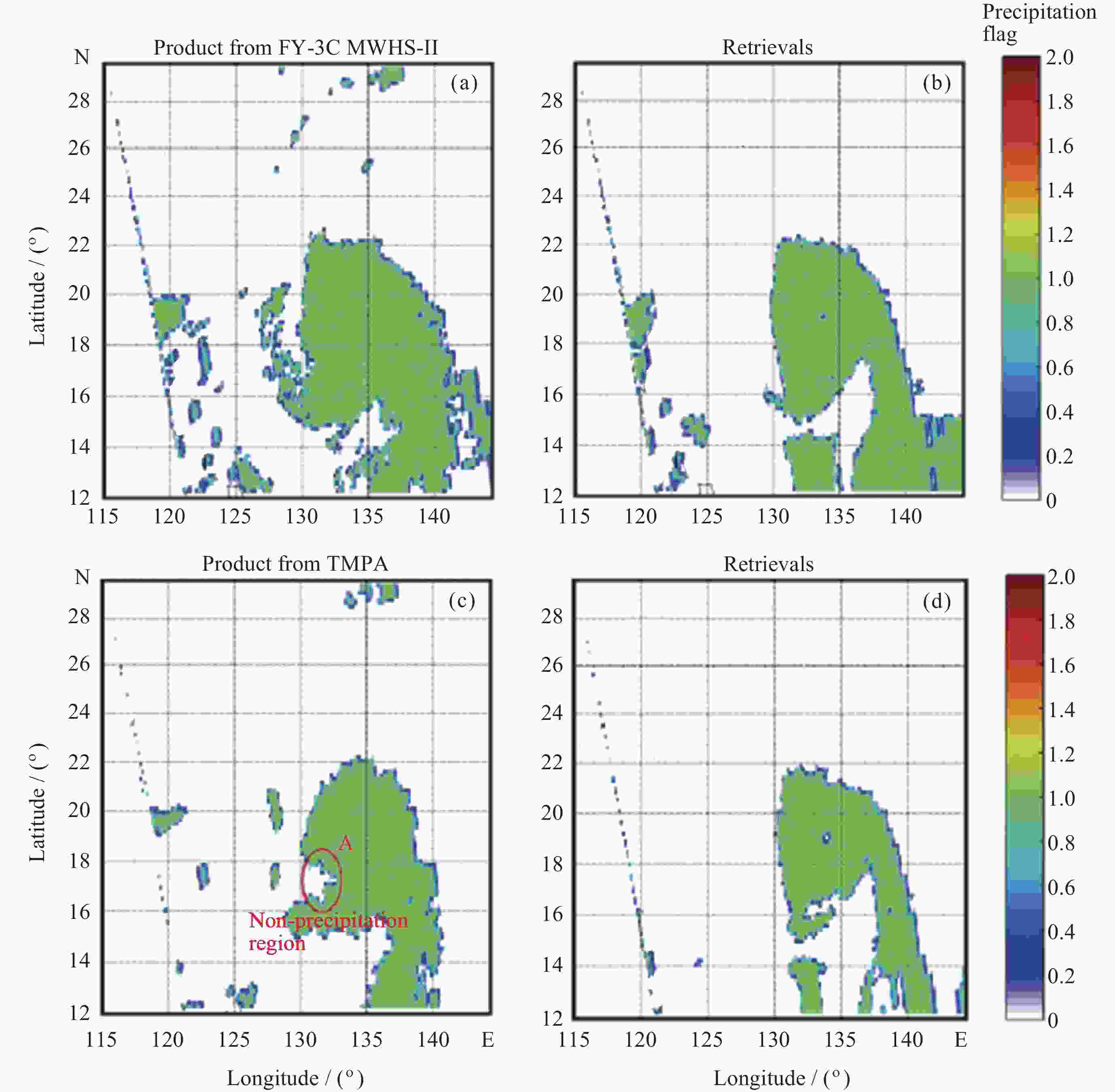 图 5 2016年9月24日 12:18 UTC-14:10 UTC FY-3C微波湿度计观测到台风时的降水检测数据(a),TMPA/3 B42降水数据(c)和FY-3C/MWHS-II降水反演数据(b)(d)