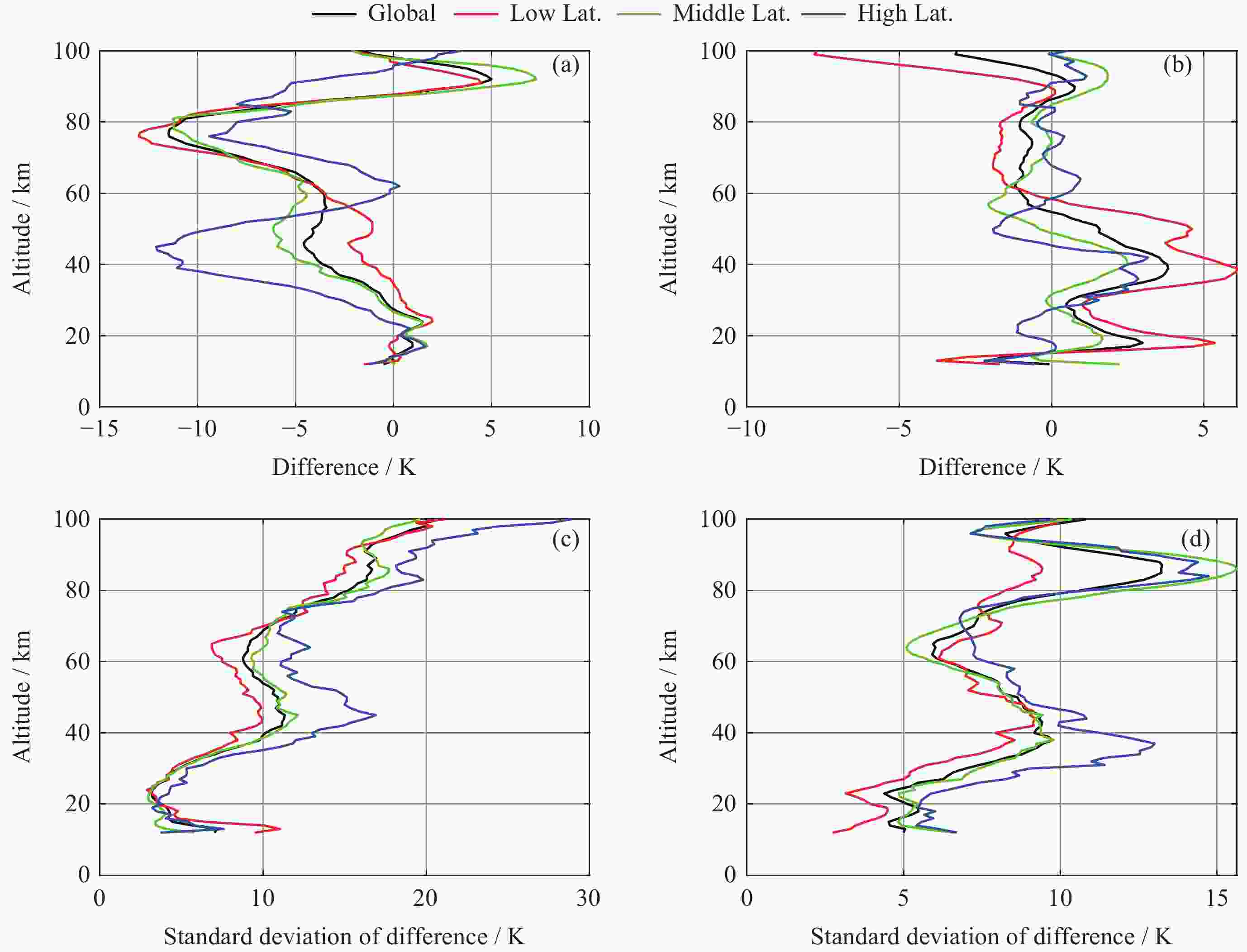 Abstract: The accurate detection of atmospheric temperature is of great significance for studying the structural characteristics and dynamic processes of the middle and upper atmosphere. The GNOS (Global Navigation Satellite System Occultation Sounder) mounted on the FY3D has been carrying out atmospheric sounding since 15 November 2017. The purpose of this study is to evaluate the atmospheric temperature data products of the FY3D satellite. This study was conducted to comparatively analyze the atmospheric temperature data within the range of 12~100 km based on FY3D occultation observation data for 3 years from January 2019 to December 2021, with the aid of TIMED/SABER detection data and NRLMSISE00 atmospheric model data. The SABER-FY3D temperature deviation (TSABER–TFY3D) and NRLMSISE00-FY3D temperature deviation (TNRLMSISE00–TFY3D) and their distribution with latitude, season, and the difference between the northern and southern hemispheres were analyzed. The results show that the three sets of temperature data have generally consistent trend with change in height. SABER-FY3D temperature deviation is positive (0~1.8 K) in the altitude range of 12~30 km, and as the altitude increases, the temperature deviation increases from 0 K at 30 km to $ - $11.6 K at 77 km. NRLMSISE00-FY3D temperature deviation is positive (0~4.4 K) in the stratosphere, and negative ($ - $2~0 K) in the mesosphere and low thermosphere. Both temperature deviations show significant variations with latitude and season. Below 60 km, SABER-FY3D temperature deviation is smaller in the low-latitude region ($ - $3.8~1.8 K) and larger in the high-latitude region ($ - $12~1.6 K), smaller in summer ($ - $0.5~2.2 K) and larger in winter ($ - $6.2~1 K); NRLMSISE00-FY3D temperature deviation is just the opposite, smaller in the high-latitude region ($ - $1.6~2.4 K) and larger in the low-latitude ($ - $3.9~6.1 K), smaller in winter ($ - $2~2.2 K),, and larger in summer($ - $1.3~7.1 K). The zero deviation lines of the two types of monthly average temperature deviations show characteristics of being higher in spring and summer and lower autumn and winter in both hemispheres. In the winter, in the altitude region of 40~60 km, the negative deviation of the SABER-FY3D average temperature in the northern hemisphere is more obvious than that in the southern hemisphere. -