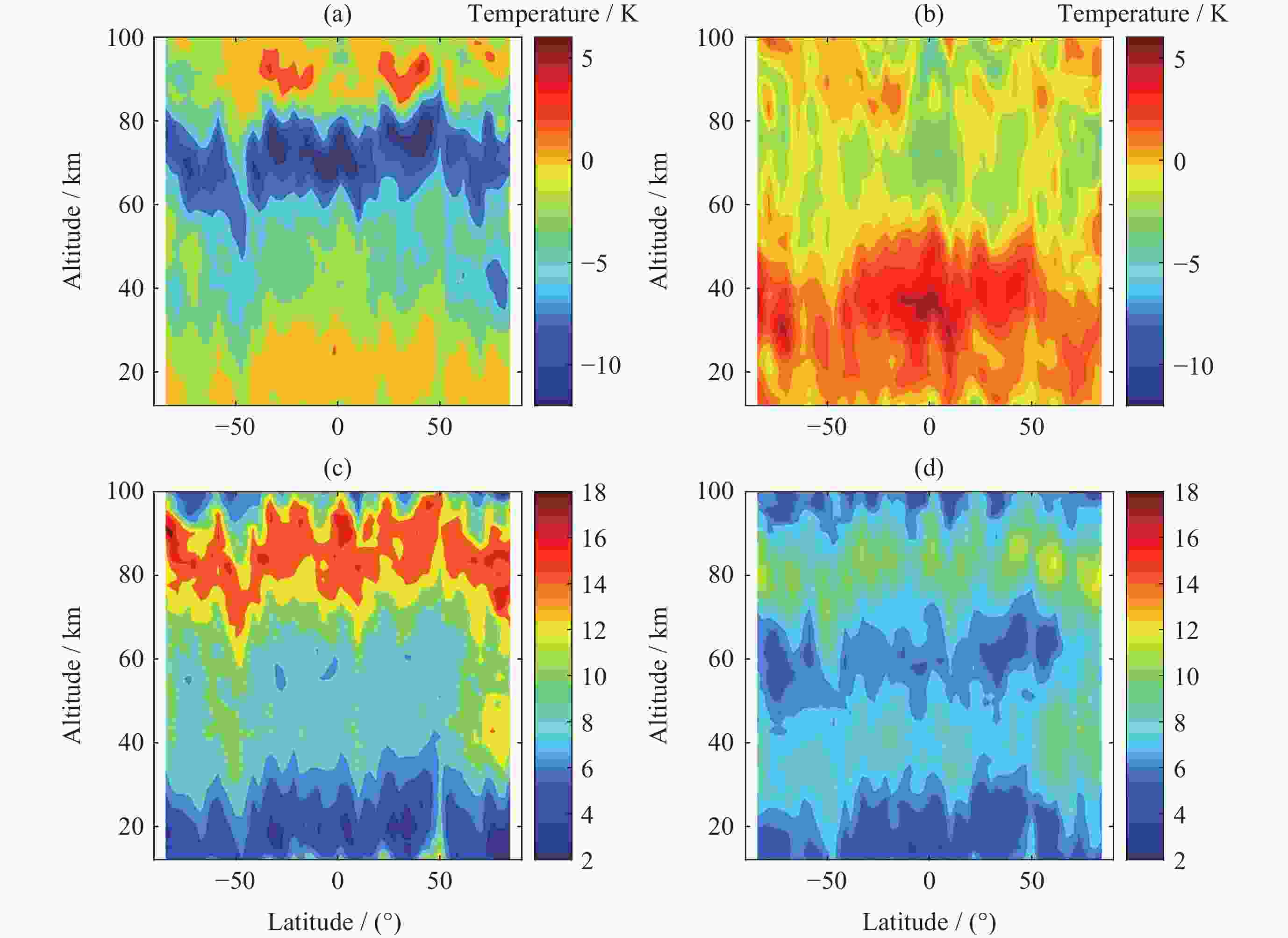 摘要: 大气温度数据的精确探测对于研究中高层大气的结构特征和动力学过程具有重要意义. 利用2019年1月至2021年12月共3年的FY3D掩星观测数据, 借助TIMED/SABER探测数据和NRLMSISE00大气模式数据, 对12~100 km范围内的大气温度数据进行比较. 统计分析SABER-FY3D温度偏差(TSABER–TFY3D)和NRLMSISE00-FY3D温度偏差(TNRLMSISE00–TFY3D)及其随纬度、季节的分布和南北半球的差异. 结果显示, 三种温度数据随高度变化趋势是大体一致的, SABER-FY3D温度偏差在12~30 km高度范围内为正偏差(0~1.8 K), 随高度升高, 温度偏差从30 km处的0 K增加到77 km处的$ - $11.6 K. NRLMSISE00-FY3D温度偏差在平流层为正偏差(0~4.4 K), 在中间层和低热层为负偏差($ - $2~0 K). 两种温度偏差随纬度和季节都存在明显的变化特征. 60 km以下, SABER-FY3D温度偏差在低纬地区较小($ - $3.8~1.8 K), 高纬地区较大($ - $12~1.6 K), 夏季较小($ - $0.5~2.2 K), 冬季较大($ - $6.2~1 K); NRLMSISE00-FY3D温度偏差正好相反, 在高纬地区较小($ - $1.6~2.4 K), 低纬地区较大($ - $3.9~6.1 K), 冬季较小($ - $2~2.2 K), 夏季较大($ - $1.3~7.1 K). 两类月平均温度偏差的零偏差线所在高度在南北半球均存在春夏季节较高, 秋冬季节较低的特征. 冬季40~60 km高度区域内, 北半球的SABER-FY3D平均温度负偏差比南半球的明显.