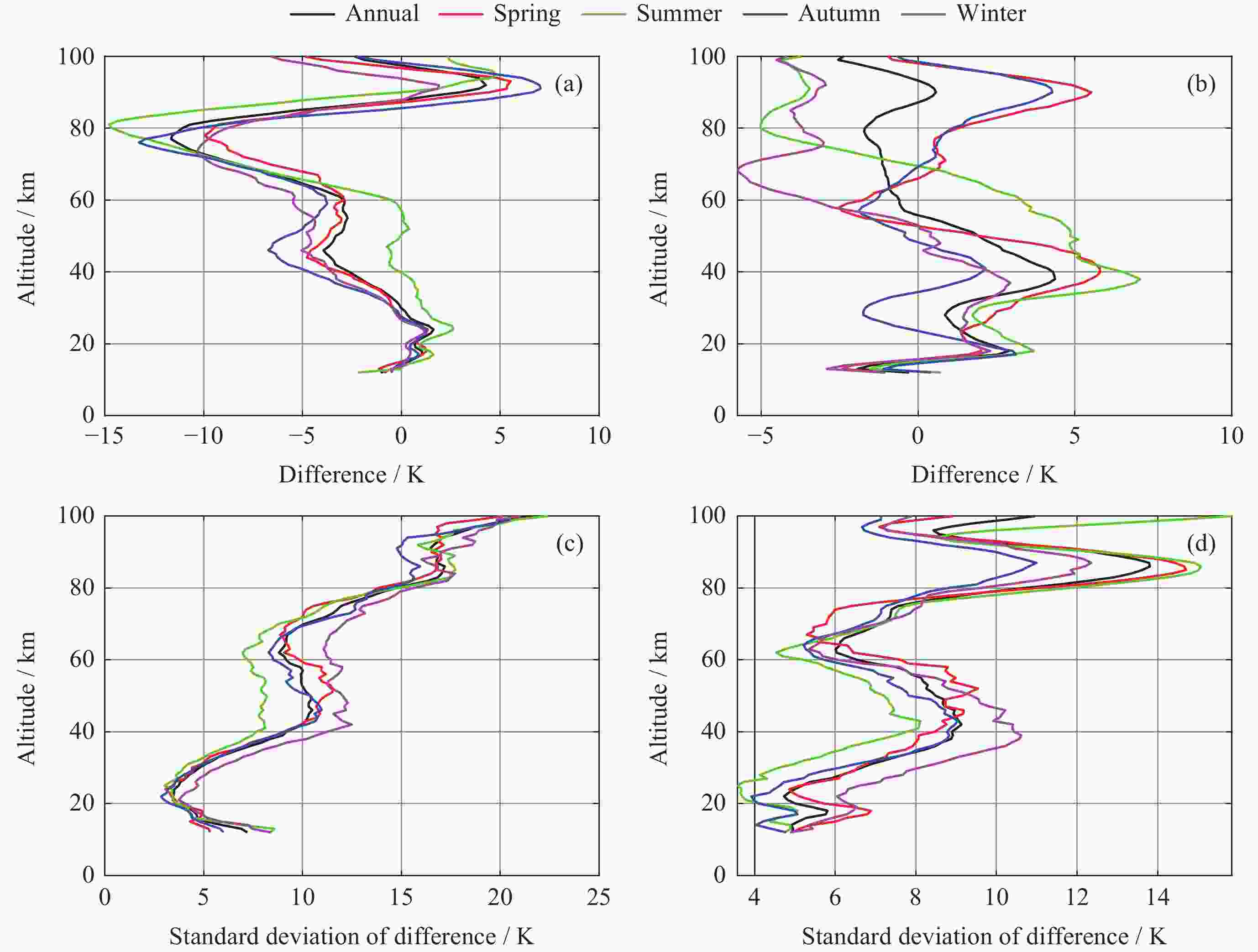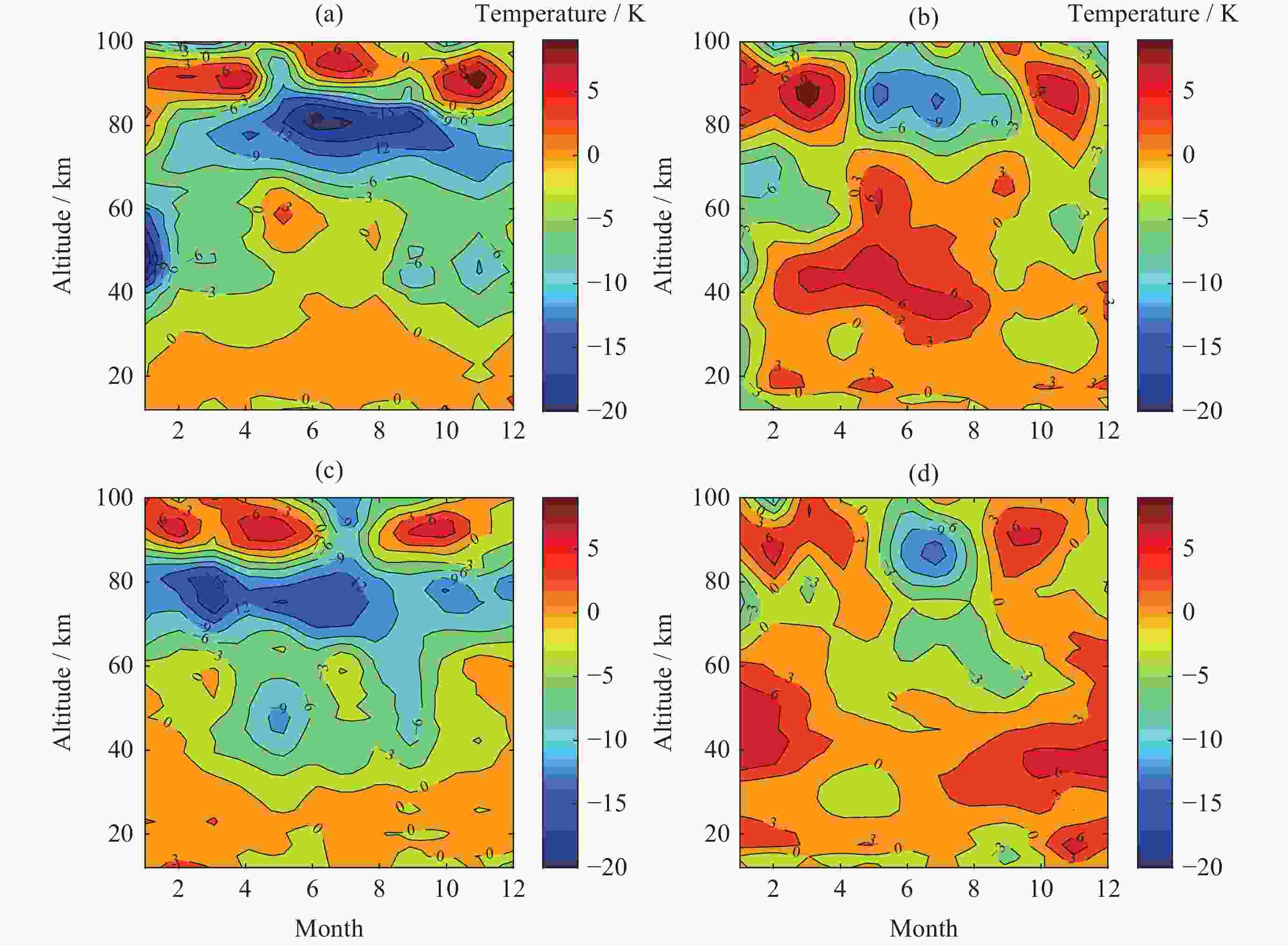 Figure 7. Monthly mean temperature difference in the northern hemisphere of SABER-FY3D (a) and NRLMSISE00-FY3D (b) with month and altitude. Monthly mean temperature difference in the southern hemisphere of SABER-FY3D (c) and NRLMSISE00-FY3D (d) with month and altitude