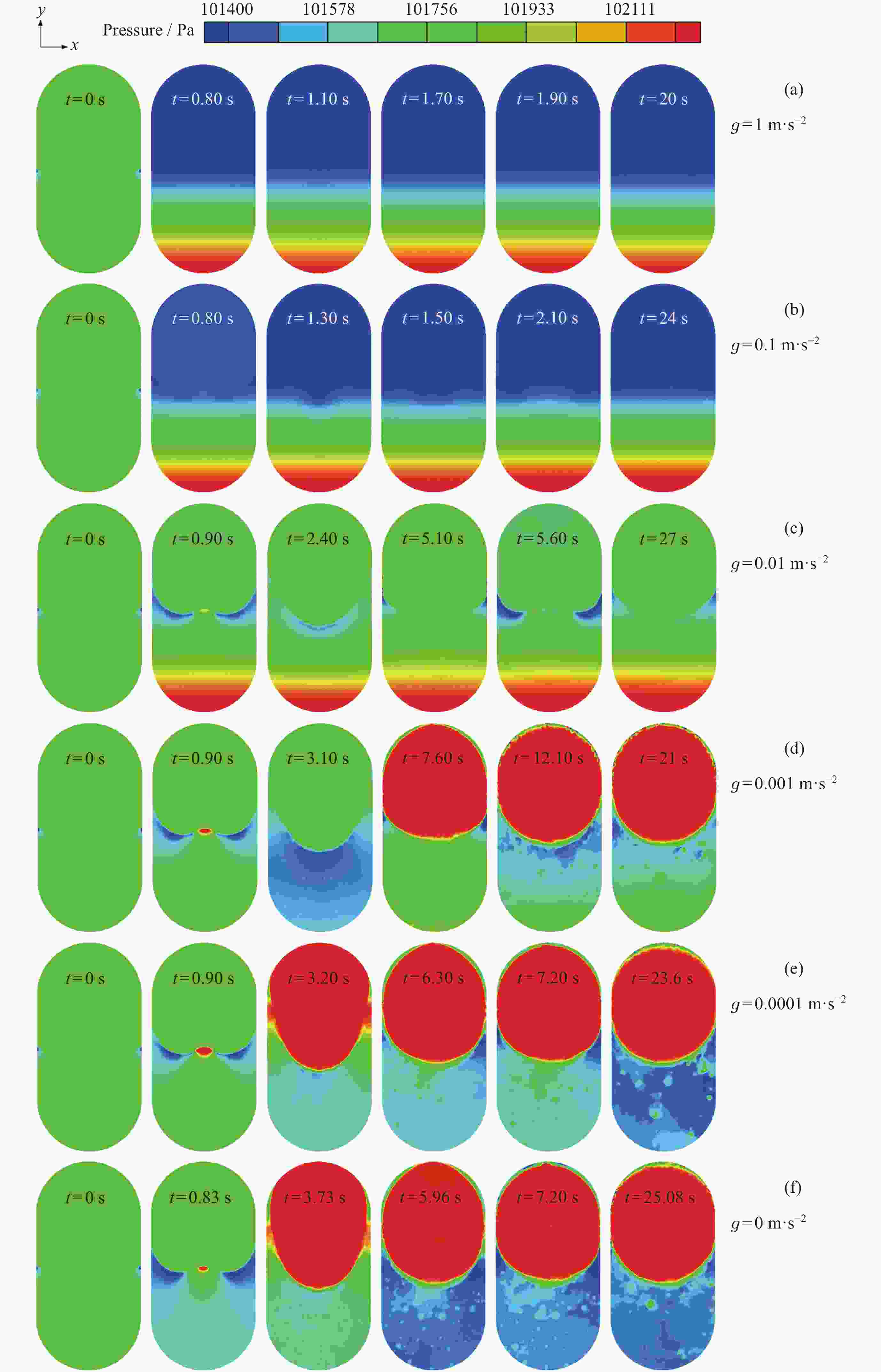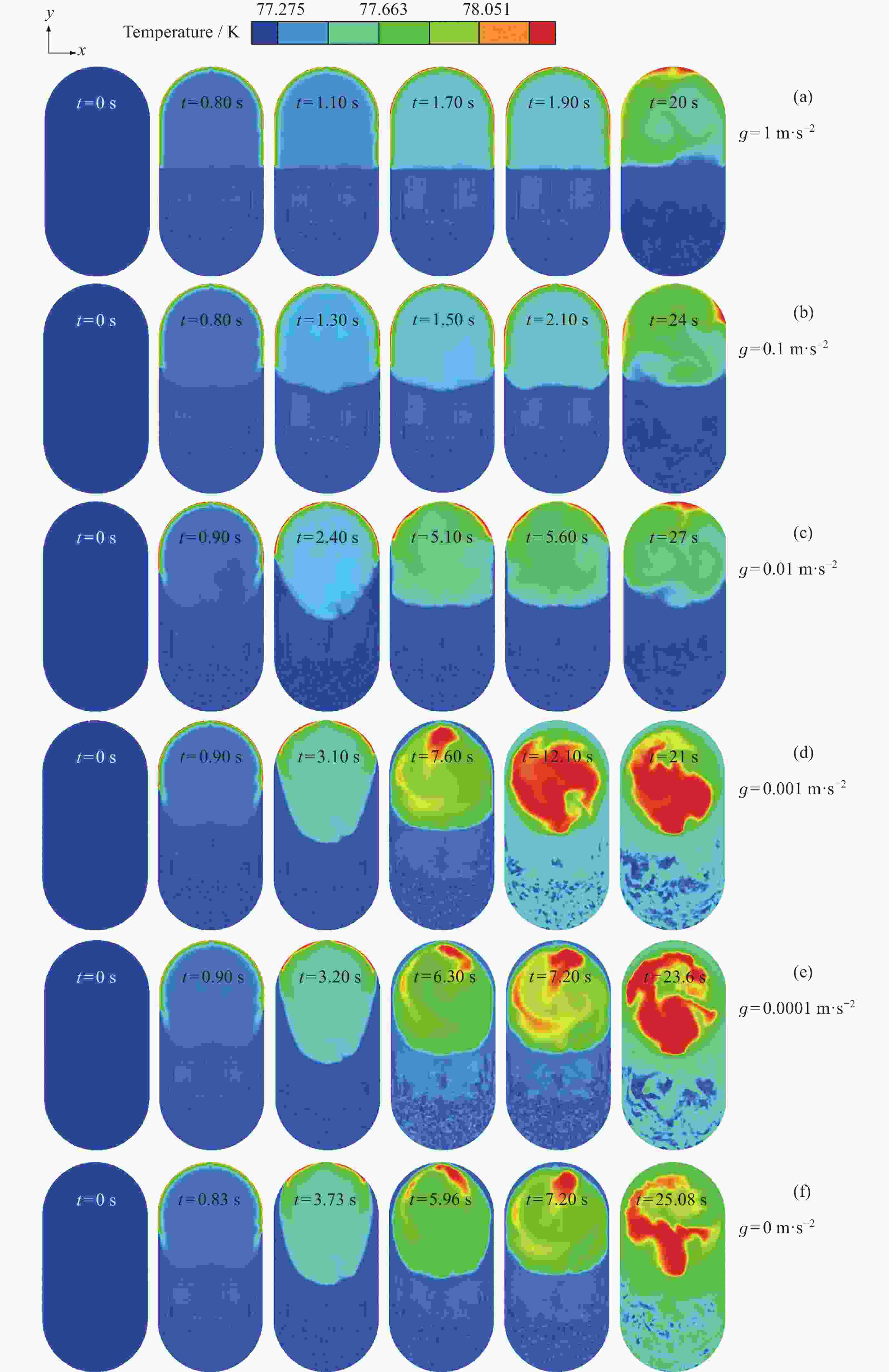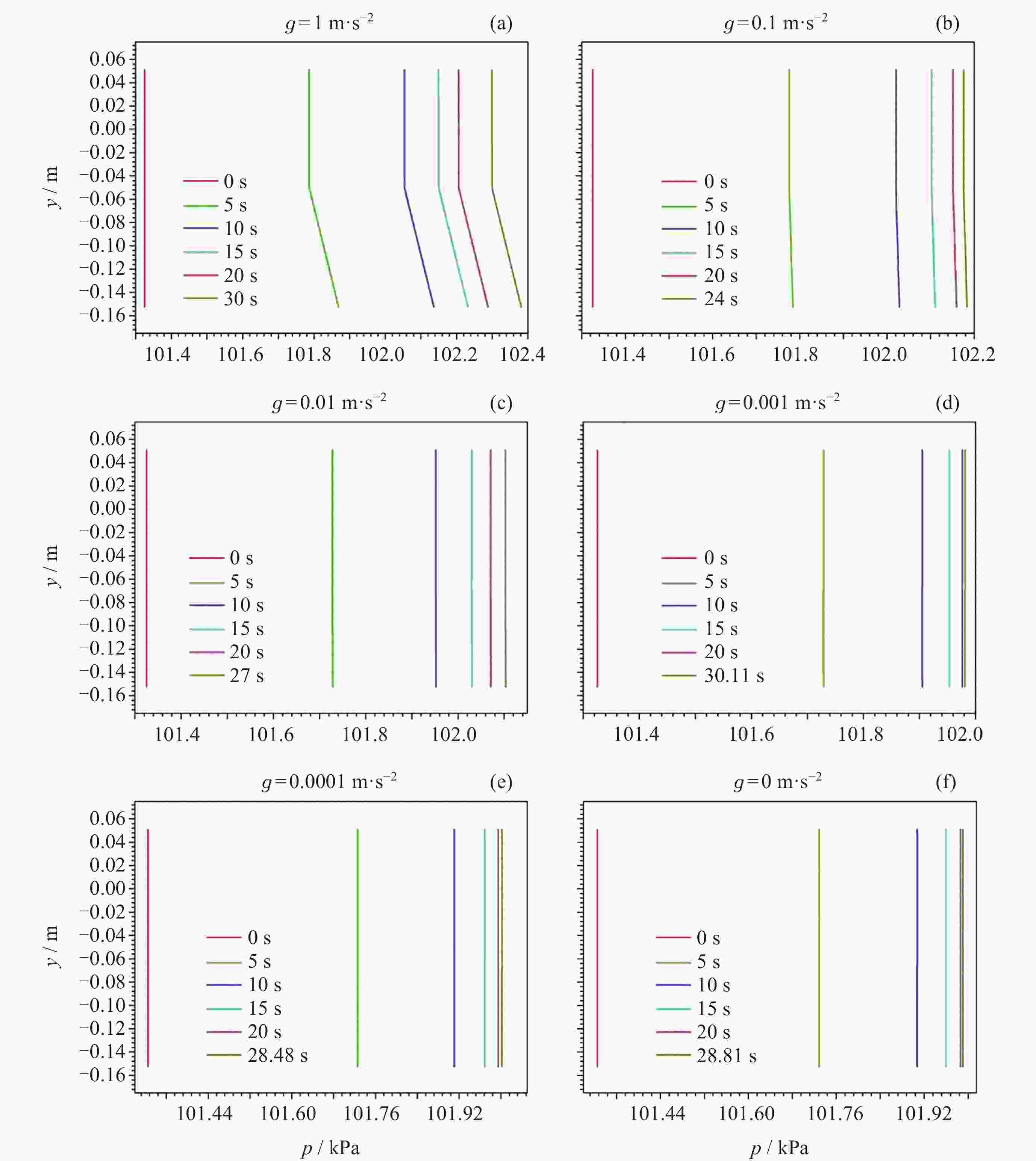 Variable Physical significance Experimental value p0 / Pa Initial pressure of normal-temperature fluid PnP 120859 Tg,0 / K Initial temperature of the ullage 307 Tl,0 / K Initial temperature of normal-temperature fluid PnP 307 f0 /(%) Initial volume filling ratio of normal-temperature fluid PnP 80.82 g0 /(m⋅s–2) Residual gravitational acceleration 5×10–6 qh /(W⋅m–2) Average heat leakage density of tank wall in the heating zone 0.5 qw /(W⋅m–2) Average heat leakage density of tank wall out of the heating zone 0 表 3 不同g条件下低温流体液氮贮箱自加压仿真的边值条件