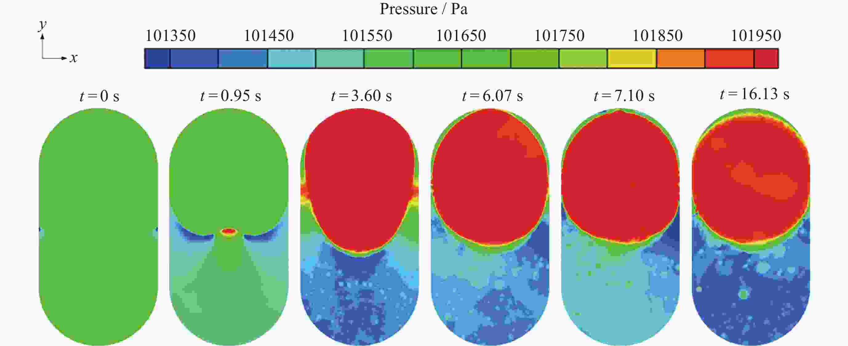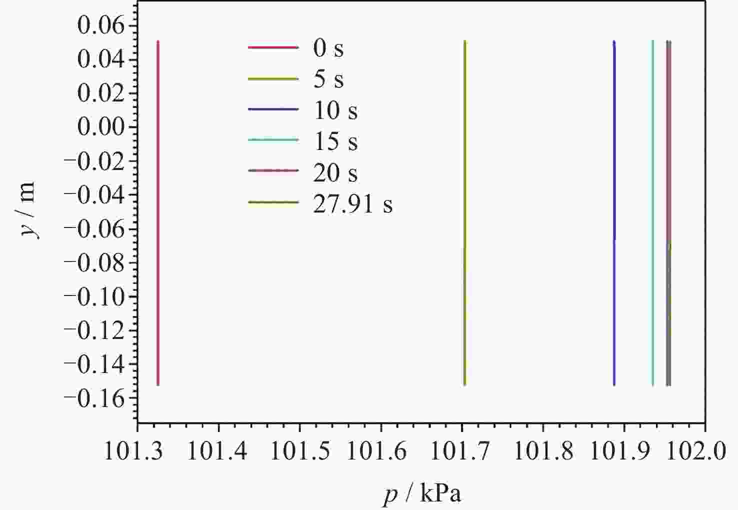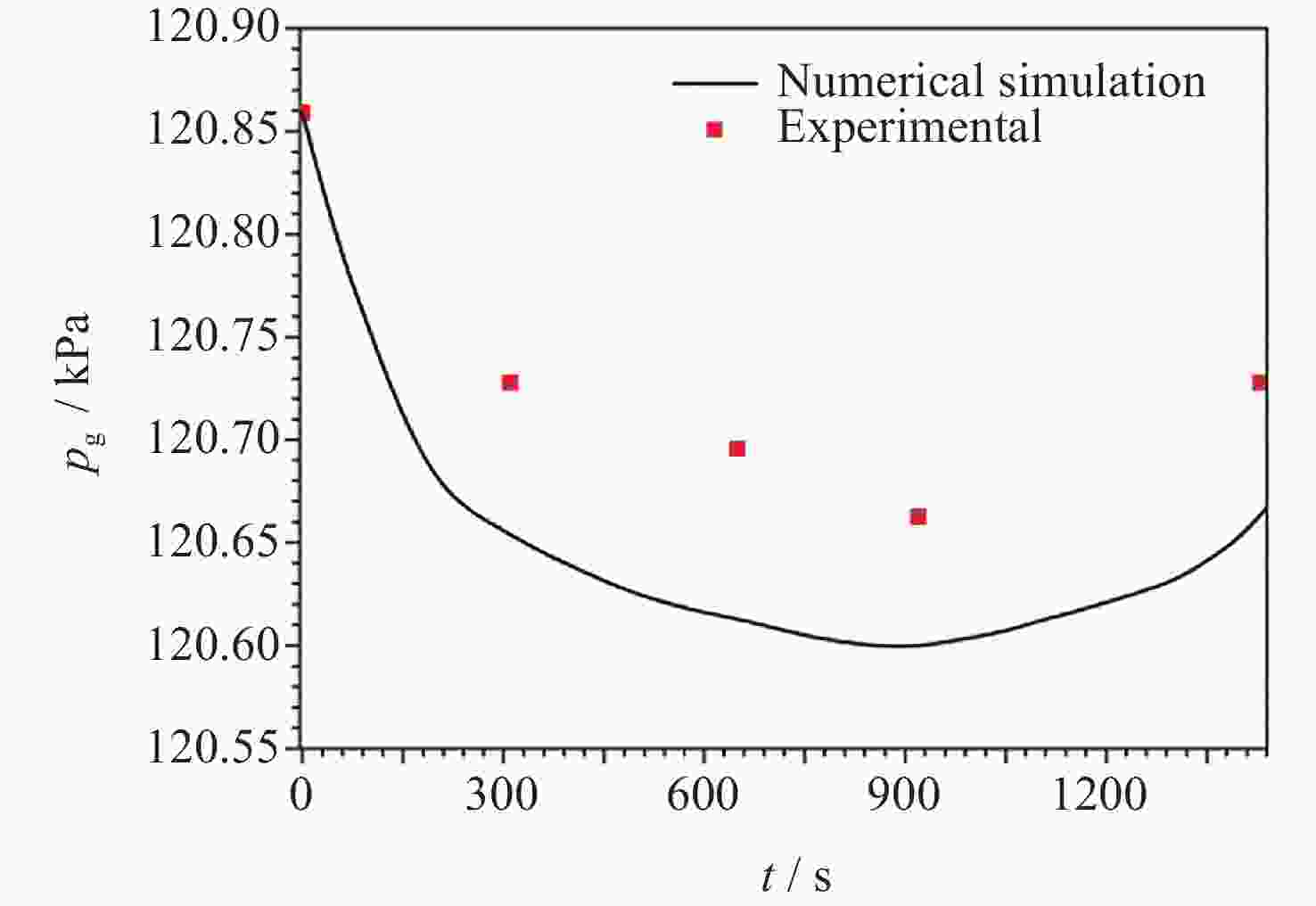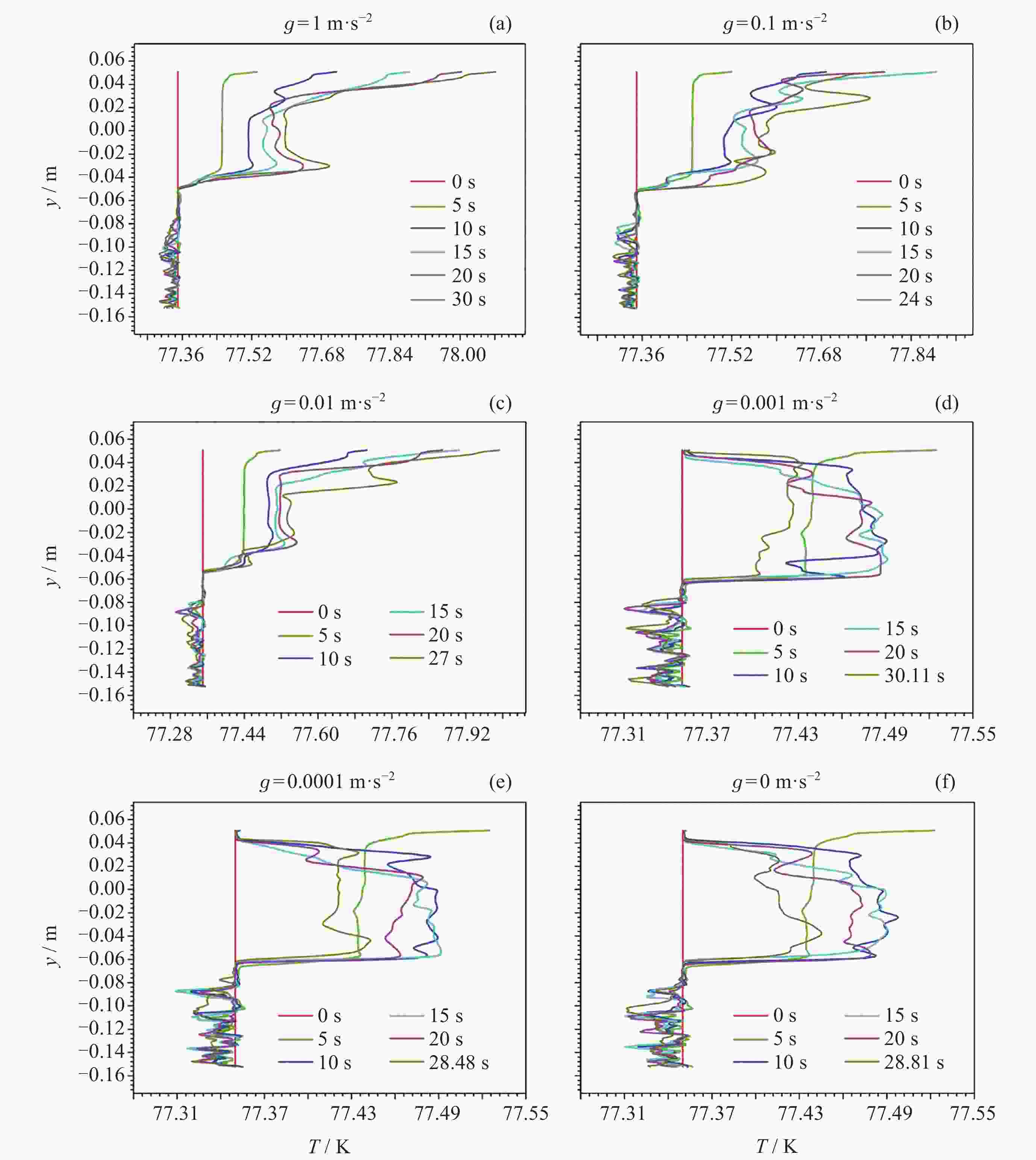 Variable Physical significance Experimental value p0 / Pa Initial pressure of normal-temperature fluid PnP 120859 Tg,0 / K Initial temperature of the ullage 307 Tl,0 / K Initial temperature of normal-temperature fluid PnP 307 f0 /(%) Initial volume filling ratio of normal-temperature fluid PnP 80.82 g0 /(m⋅s–2) Residual gravitational acceleration 5×10–6 qh /(W⋅m–2) Average heat leakage density of tank wall in the heating zone 0.5 qw /(W⋅m–2) Average heat leakage density of tank wall out of the heating zone 0 表 3 不同g条件下低温流体液氮贮箱自加压仿真的边值条件