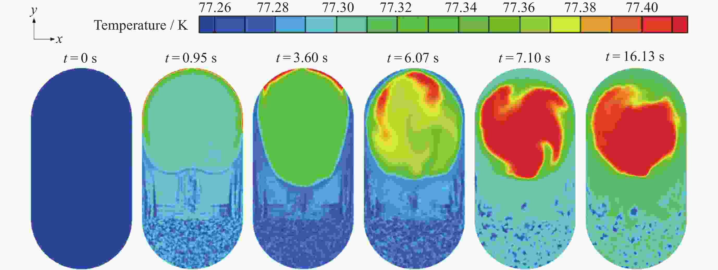 摘要: 为了研究残余重力加速度g对液氮贮箱自加压期间贮箱内流体的流动、相分布、温度分布以及压强分布的影响, 针对液氮贮箱, 采用流体体积(Volume-of-Fluid, VOF)方法数值模拟了不同g条件下液氮贮箱的自加压过程. 研究结果表明: 在大g情况下, 贮箱内压强沿g的方向逐渐增大, 贮箱内气枕的温度随贮箱壁面的持续漏热而不断升高, 且靠近壁面区域气体的温度最高, 靠近液体区域气体的温度最低; 随着g的减小, 贮箱内的液体更容易沿贮箱壁面爬升, 贮箱内流体温度差异性逐渐减小; 在小g情况下, 贮箱内流体流动稳定后会将气枕包裹于贮箱中部, 形成球形气泡, 贮箱内流体温度的差异性随时间先逐渐增大然后逐渐减小. 在零重力环境下, 贮箱壁面漏热(qw = 0.5 W·m–2)存在与否对贮箱内流体运动和相分布的影响均不显著, 并且在起始一段时间间隔$\Delta t_{\mathrm{f}} $ (0 ≤ $\Delta t_{\mathrm{f}} $ ≤ 40 s)内, 除贮箱壁面附近之外, qw存在与否对贮箱内流体温度分布的影响也不显著.Abstract: In order to study the effects of residual gravitational acceleration g on the flow, phase distribution, temperature distribution, and pressure distribution of liquid nitrogen tank during self-pressurization, the self-pressurization process of liquid nitrogen tank under different g was numerically simulated by the Volume-of-Fluid (VOF) method. The results show that under the condition of large g, the fluid pressure in the tank increases gradually along the direction of residual gravity, and the temperature of the ullage in the tank increases with the continuous heat leakage of the tank wall, and the gas temperature near the wall is the highest, and the gas temperature near the liquid is the lowest, while the temperature in the liquid bulk zone of the tank changes little with time. With the decrease of g, the liquid in the tank is more likely to climb along the wall of the tank with better infiltration, and the temperature difference of the fluid in the tank is gradually reduced. In the case of small g, after the fluid flow in the tank is stable, the ullage will be wrapped in the middle of the tank, forming a spherical bubble. The difference of the fluid temperature in the tank gradually increases and then decreases with time. In zero gravity environment, the presence or absence of heat leakage (qw = 0.5 W⋅m–2) on the tank wall has no significant influence on the fluid movement and phase distribution in the tank, and within the initial time interval $\Delta t_{\mathrm{f}} $ (0 ≤ $\Delta t_{\mathrm{f}} $ ≤ 40 s), the influence of the presence or absence of qw on the temperature distribution of the fluid in the tank also is not significant except near the wall of the tank. Numerical simulation results are expected to provide references to further study the on-orbit pressure control technique of cryogenic liquid tanks and space cryogenic fluid management.