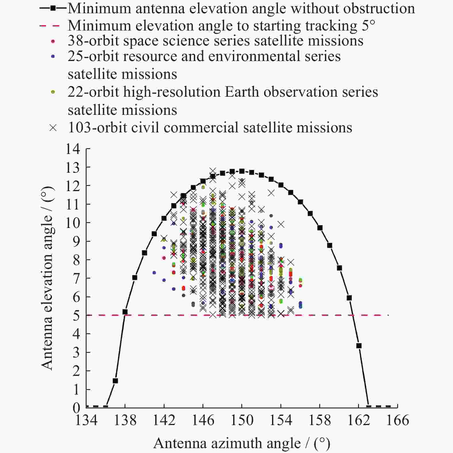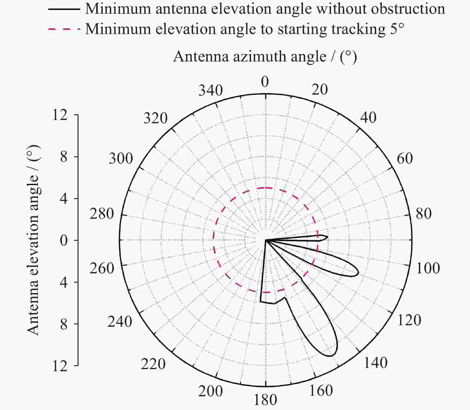 小仰角$ {E}_{\mathrm{m}\mathrm{i}\mathrm{n}} $/(º)137 149.68 12.68 1.464 138 149.68 11.68 5.181 139 149.68 10.68 7.029 140 149.68 9.68 8.358 141 149.68 8.68 9.393 142 149.68 7.68 10.224 143 149.68 6.68 10.900 144 149.68 5.68 11.448 145 149.68 4.68 11.887 146 149.68 3.68 12.229 147 149.68 2.68 12.483 148 149.68 1.68 12.654 149 149.68 0.68 12.745 149.68 149.68 0 12.763 150 149.68 –0.32 12.759 151 149.68 –1.32 12.696 152 149.68 –2.32 12.554 153 149.68 –3.32 12.330 154 149.68 –4.32 12.021 155 149.68 –5.32 11.618 156 149.68 –6.32 11.111 157 149.68 –7.32 10.484 158 149.68 –8.32 9.713 159 149.68 –9.32 8.758 160 149.68 –10.32 7.550 161 149.68 –11.32 5.934 162 149.68 –12.32 3.359 表 2 某地面站S天线A周边地理环境参数