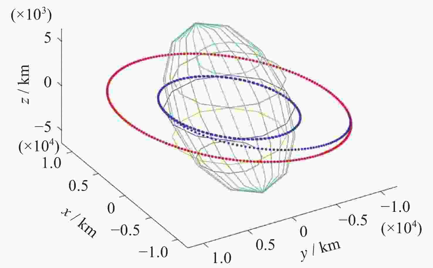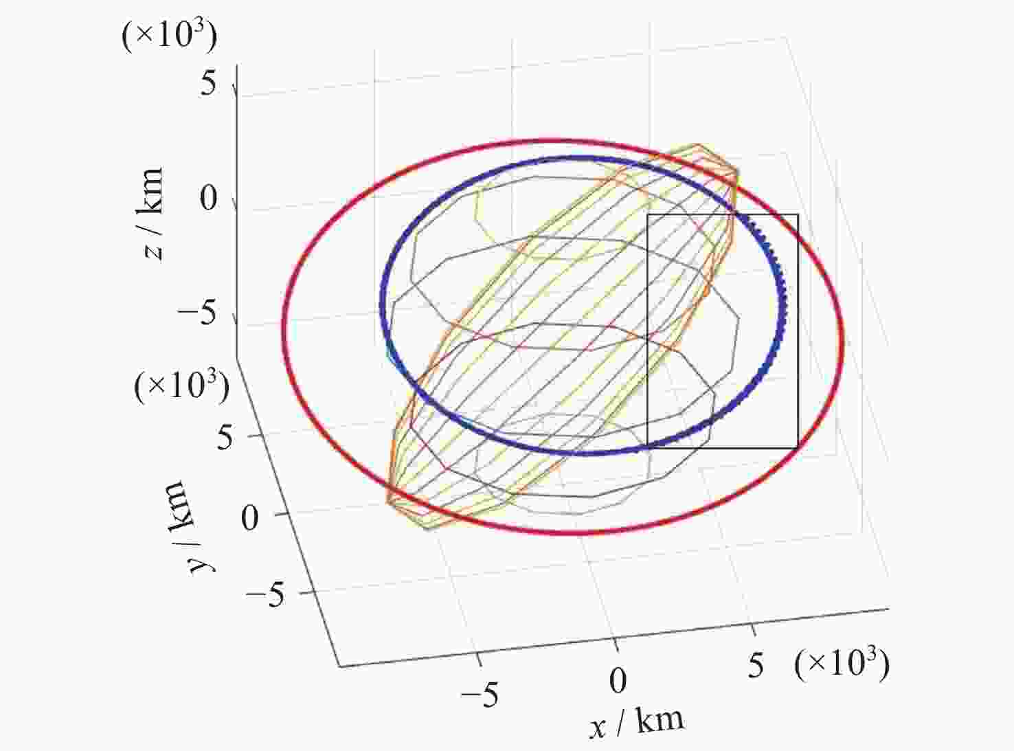 轨道根数 目标卫星 非合作目标卫星 Lambert转移轨道 半长轴a/km 12000 7000 9490.01 偏心率e 0 0 0.2646 轨道倾角i/(°) 10 10 10 升交点赤经Ω/(°) 0 0 2.94093 近地点幅角ω/(°) 235 235 65.2729 平近点角M/(°) 0 0 2.3429 表 2 探测意图目标卫星以及非合作目标卫星轨道根数