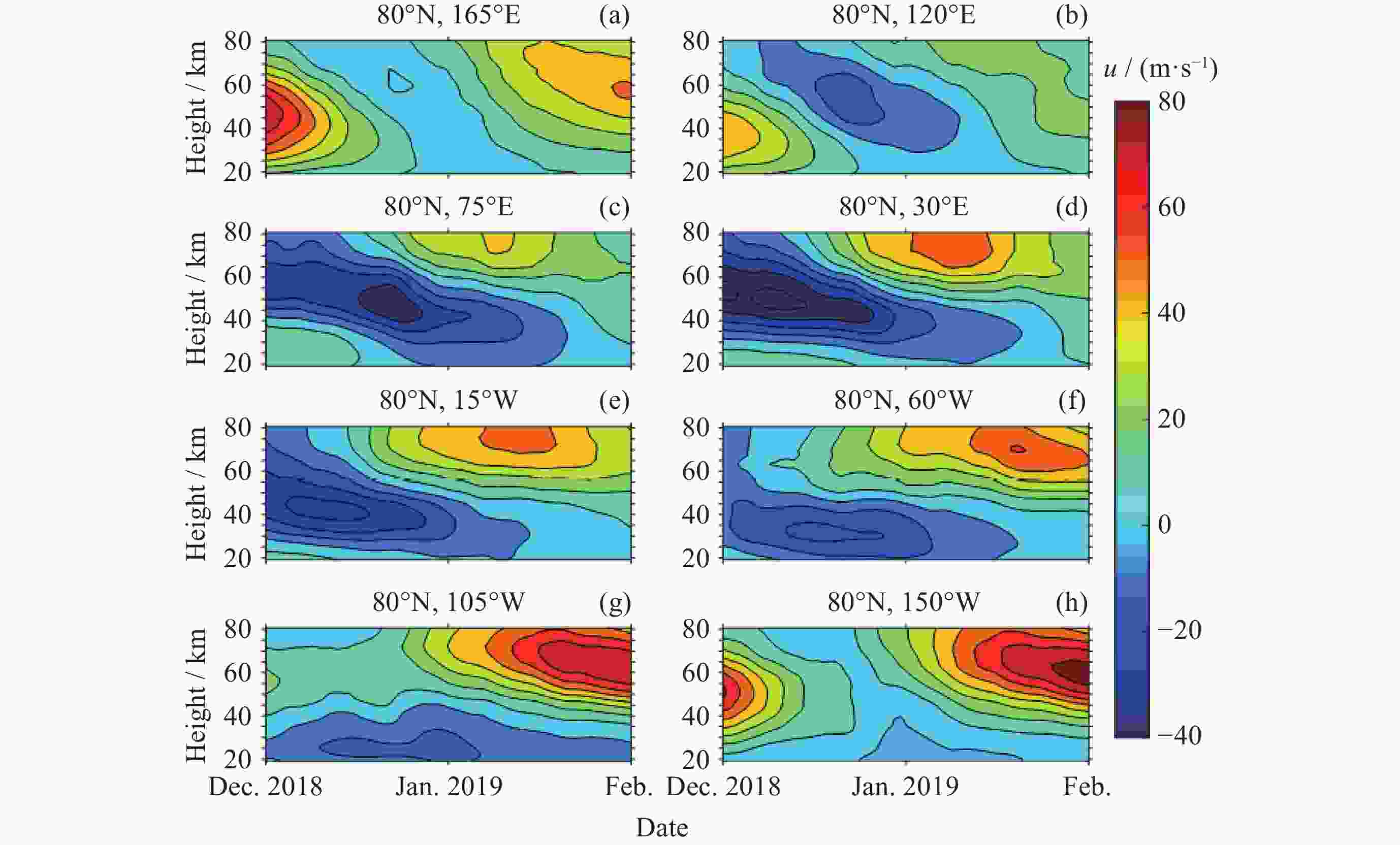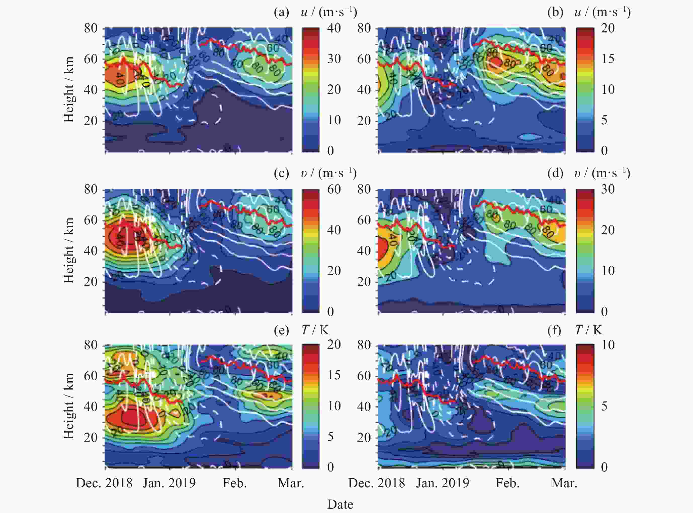 图 2 从MERRA-2数据中提取的波数为1(左列)和波数为2(右列)的准定常行星波纬向风速、经向风速和温度分量在70°N处的高度–时间分布(红色实线代表平流层顶, 白色实线代表东向的纬向平均纬向风速, 而白色虚线则代表西向的纬向平均纬向风速)