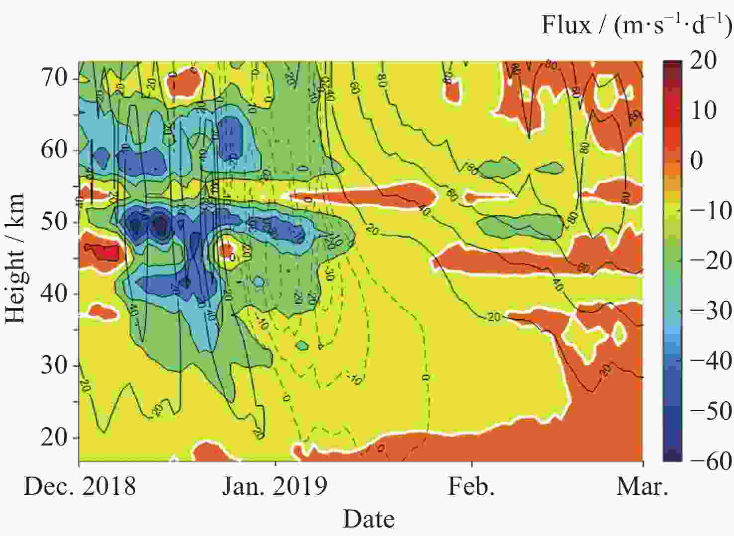 Figure 4. EP flux divergence for SPW1 at 70°N from 1 December 2018 to 28 February 2019 extracted from MERRA-2 data (Solid white line in the graph represents the zero line, the solid white line represents the eastward zonal-mean zonal winds, and the dashed white line represents the westward zonal-mean zonal winds)