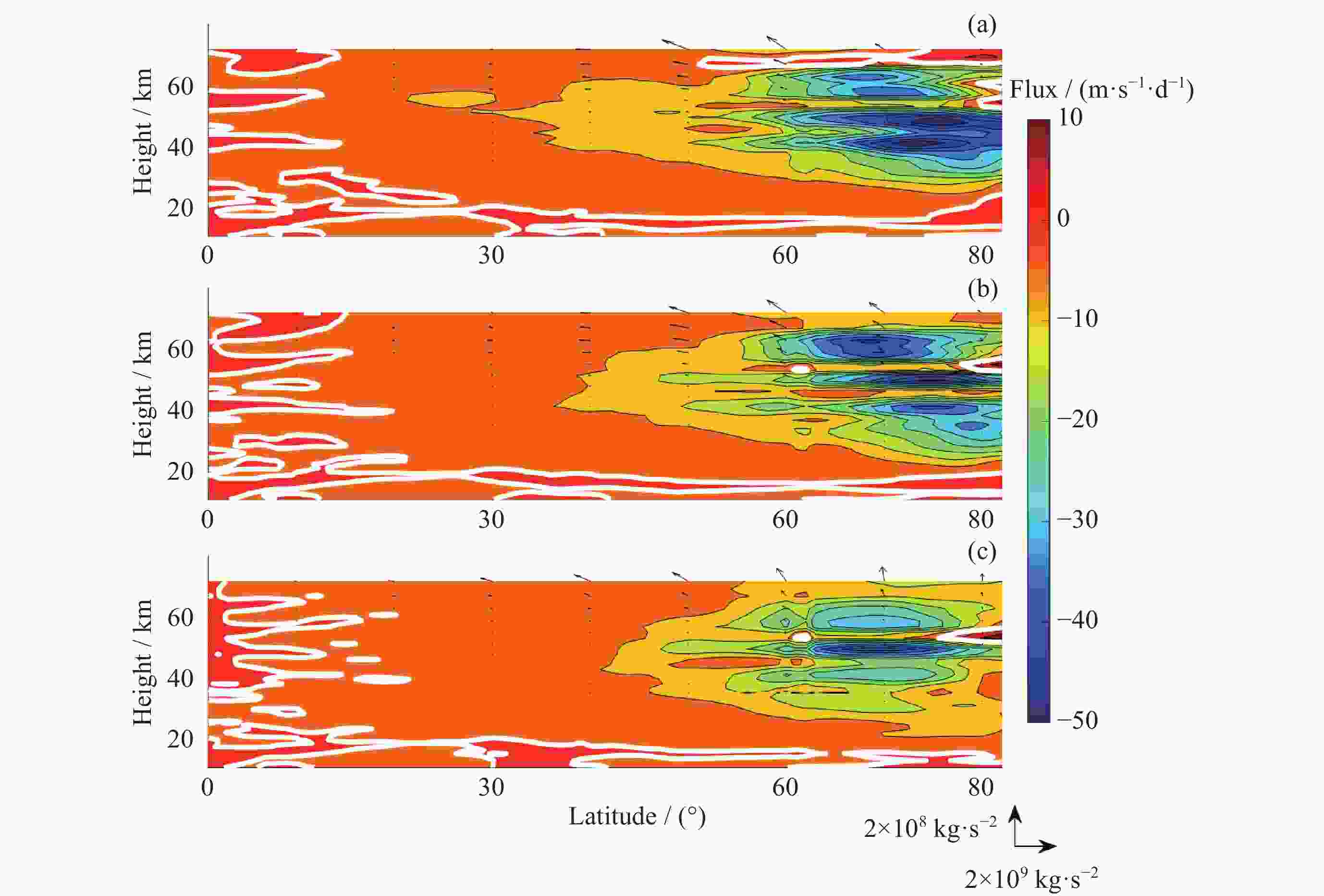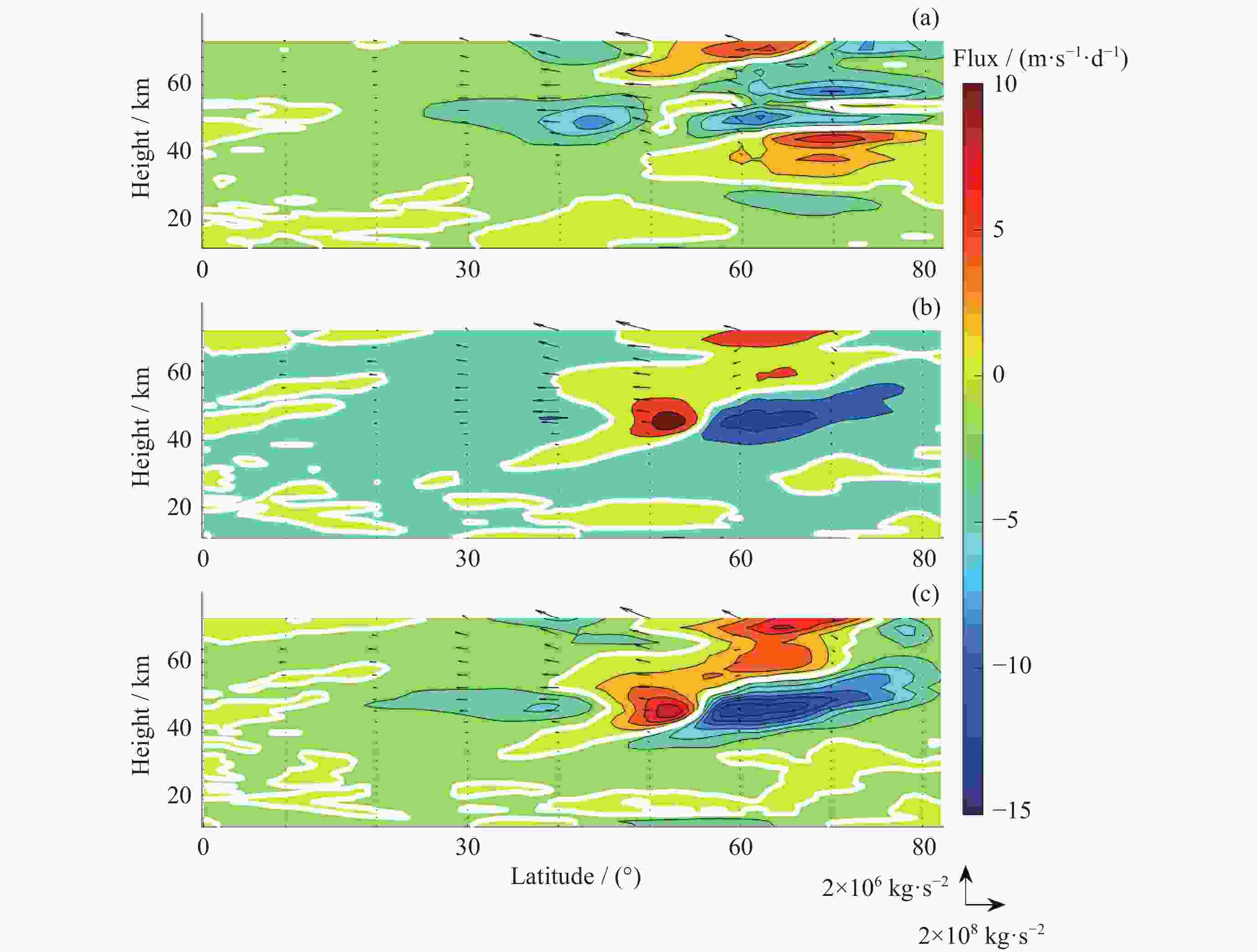 图 5 从MERRA-2数据中提取的2018年12月15-20日(a)、21-26日(b)和2018年12月27日至2019年1月1日(c)准定常行星1波的EP通量(矢量)和EP通量散度(彩色阴影)的纬度–高度剖面