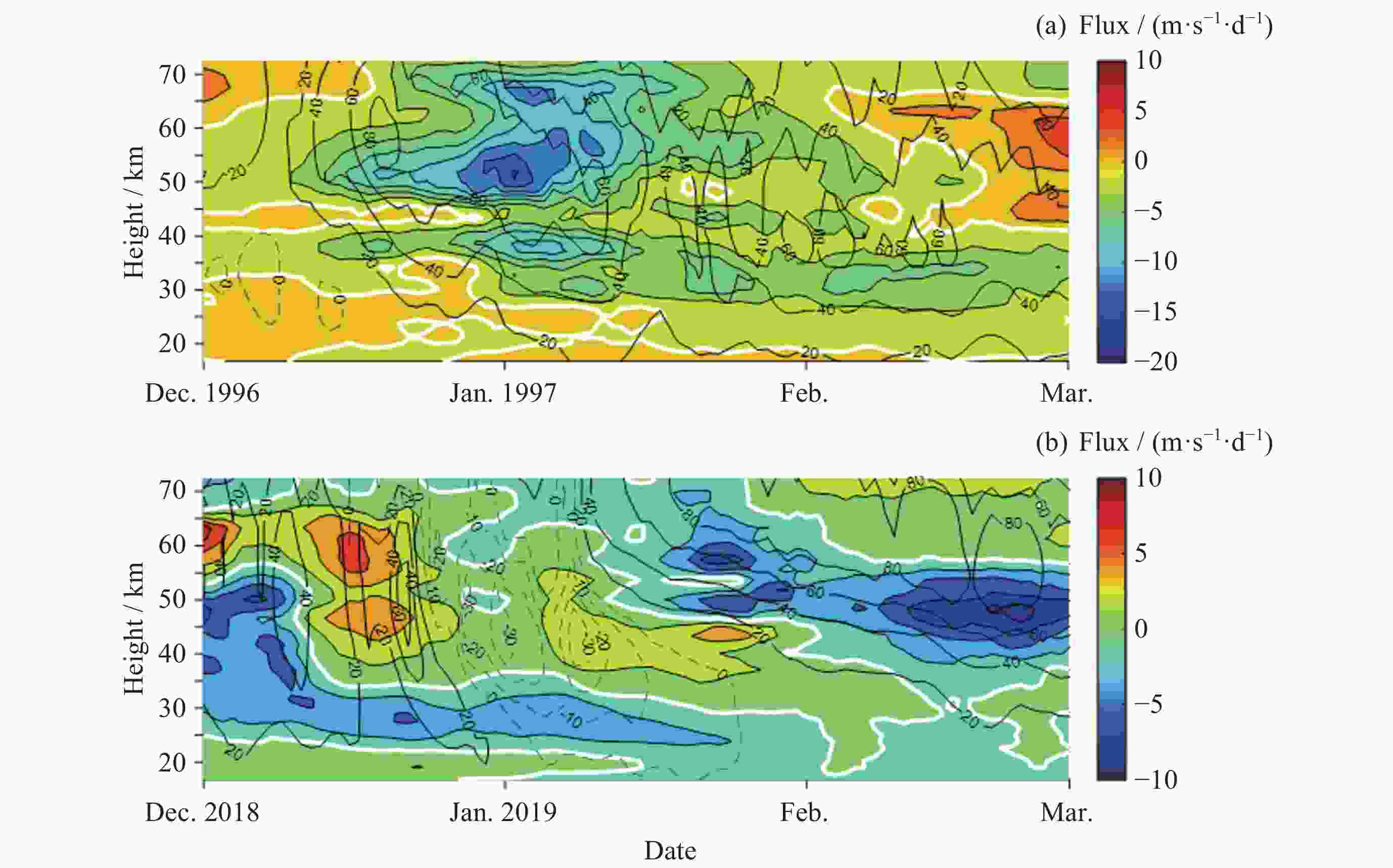 Figure 6. Daily variations of the EP flux divergence of the SPW2 at 70°N at various altitudes for the years 1996-1997 (a) and 2018-2019 (b) ,extracted from MERRA-2 data (The solid white line in the graph represents the zero line, the solid white line represents the eastward zonal-mean zonal winds, and the dashed white line represents the westward zonal-mean zonal winds)