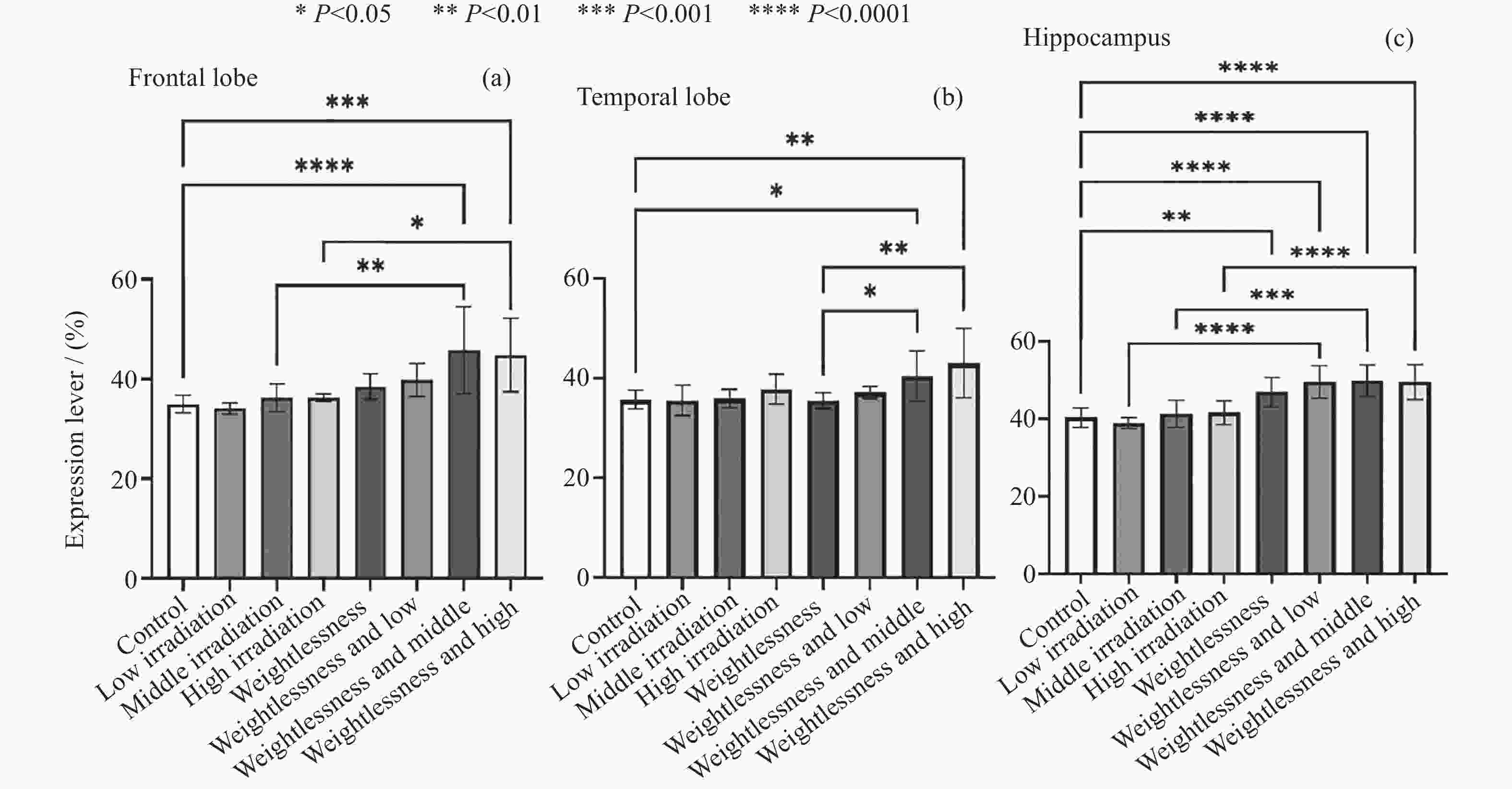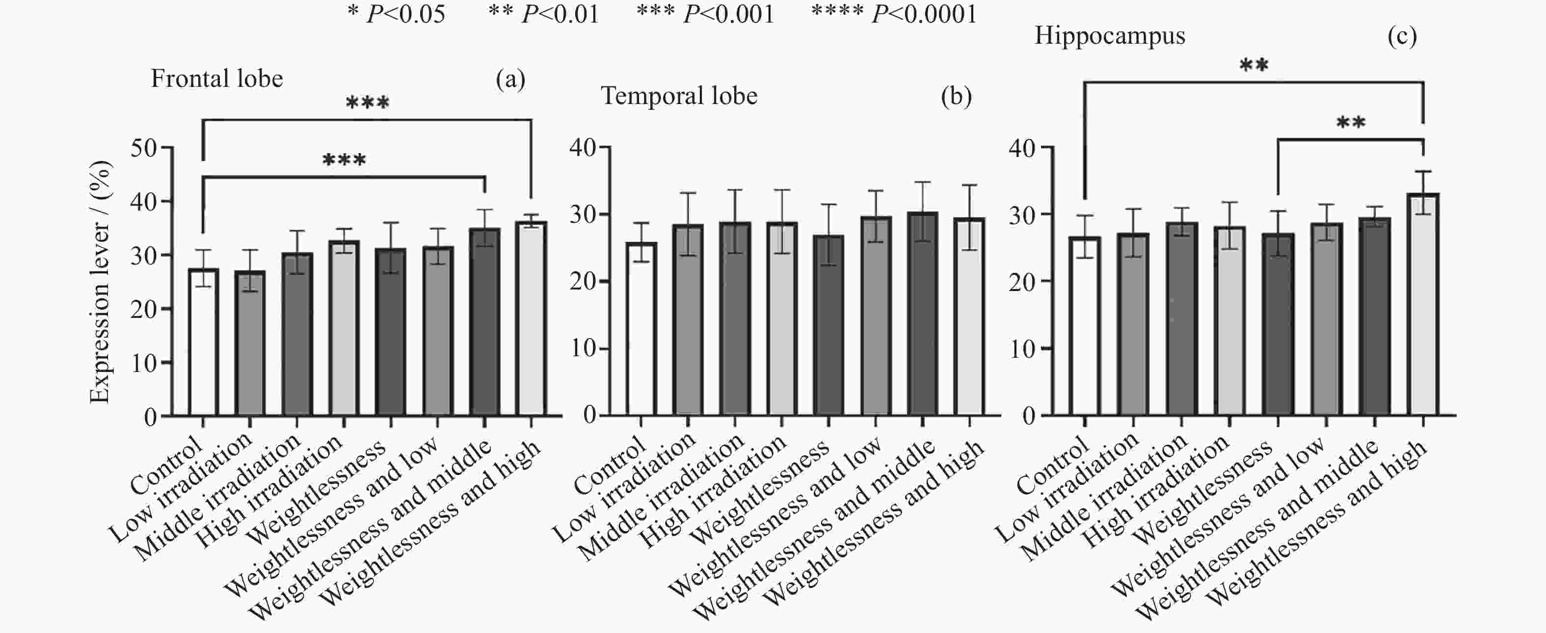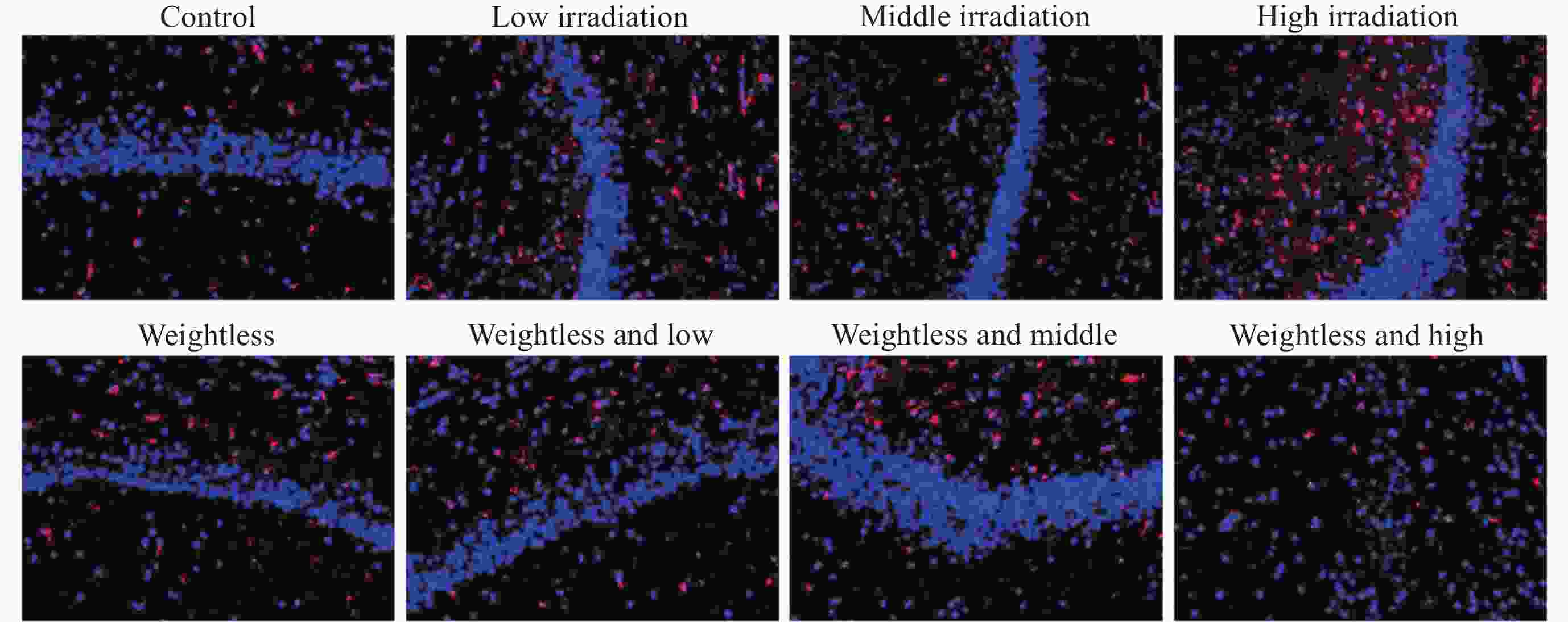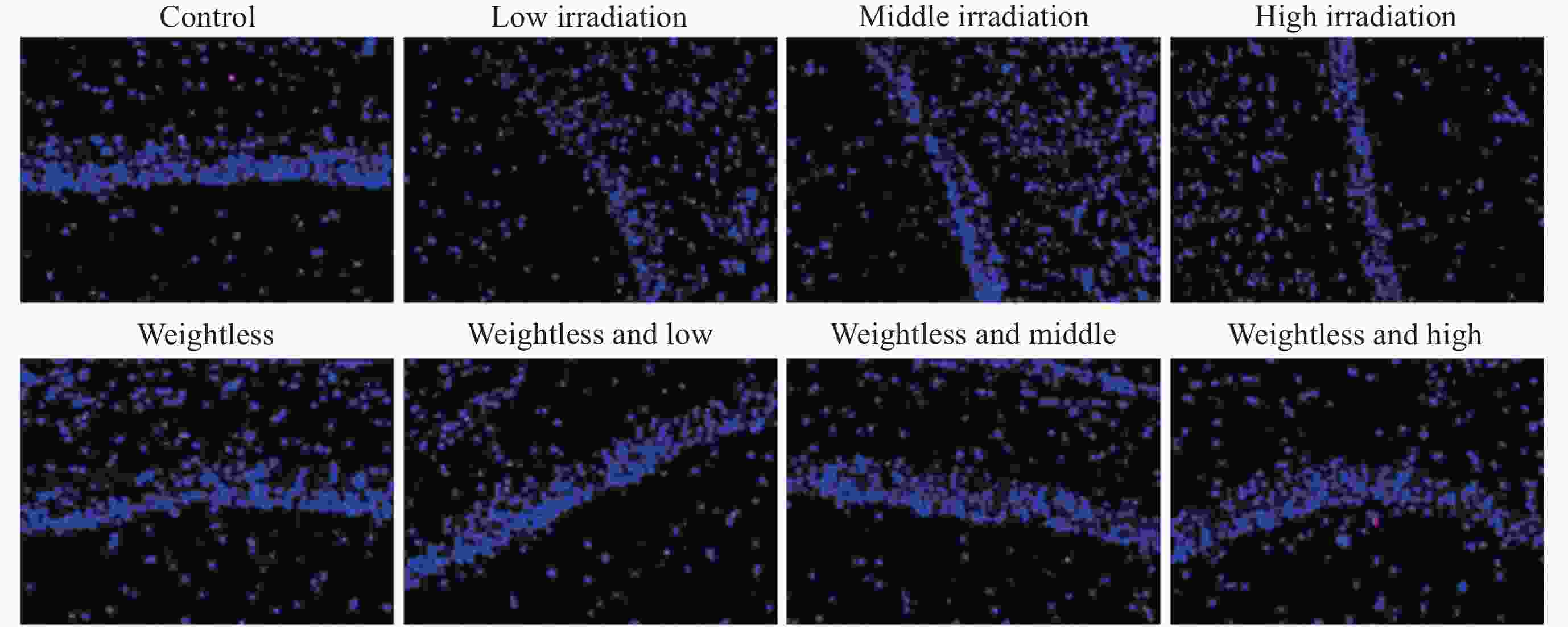 摘要: 通过生物电信号评估辐射与失重对脑的影响, 并揭示其影响规律与损伤机制, 为空间环境风险评估与防护技术研究提供参考. 以SD大鼠为对象, 设立不同实验组. 采集并分析大鼠脑电信号频谱变化, 利用神经网络模型识别脑电信号异常. 同时检测大鼠脑部特定区域的蛋白质表达量变化, 以探讨损伤机制. 辐射组与失重辐射复合组大鼠脑电信号出现慢波化, 复合作用影响显著, 神经网络模型能有效识别异常信号. 辐射与失重导致大鼠脑部髓鞘受损, 相关蛋白表达量出现变化, 提示胶质细胞激活. 辐射与失重对大鼠脑电信号有明显影响, 复合作用效果更为显著, 这可能与髓鞘受损及胶质细胞激活有关. 本研究为空间环境下的风险评估与防护技术提供了重要参考.Abstract: This article aims to assess the impact of radiation and weightlessness on the brain, specifically through the analysis of bioelectrical signals. Our goal is to elucidate the patterns and mechanisms underlying the effects of radiation, weightlessness, and their combined influence on Electroencephalogram (EEG) signals. This understanding will serve as a crucial reference for risk assessment and protective technology research in space environments. A comprehensive study was conducted utilizing SD rats as the experimental subjects. The eight different experimental groups were established to analyze EEG signals and automatically detect abnormal brain signals caused by radiation or weightlessness exposure.To delve deeper into the underlying biological mechanisms, the expression levels of Myelin Basic Protein (MBP), Glial Fibrillary Acidic Protein (GFAP), and ionized calcium-binding adapter molecule 1 (IBA1) were examined in specific brain regions, such as the frontal lobe, temporal lobe, and hippocampus. The study found that rats exposed to radiation alone or in combination with weightlessness showed a marked slow-wave EEG pattern, with the combined effect being more significant, indicating an enhanced effect. The neural network model accurately distinguished normal from abnormal EEG signals. The decrease of MBP and increase of GFAP and IBA1 were observed in the combined radiation-weightlessness groups, suggesting myelin damage and activation of astrocytes and microglias. The study reveals the effects of radiation and weightlessness on brain signals, showing that radiation alone induces slow-wave EEG patterns, and the combination with weightlessness exacerbates these patterns. The mechanism involves myelin sheath damage and glial cell activation. This understanding is crucial for assessing risks and developing protective measures in space, laying the groundwork for future research to improve astronaut safety and well-being.