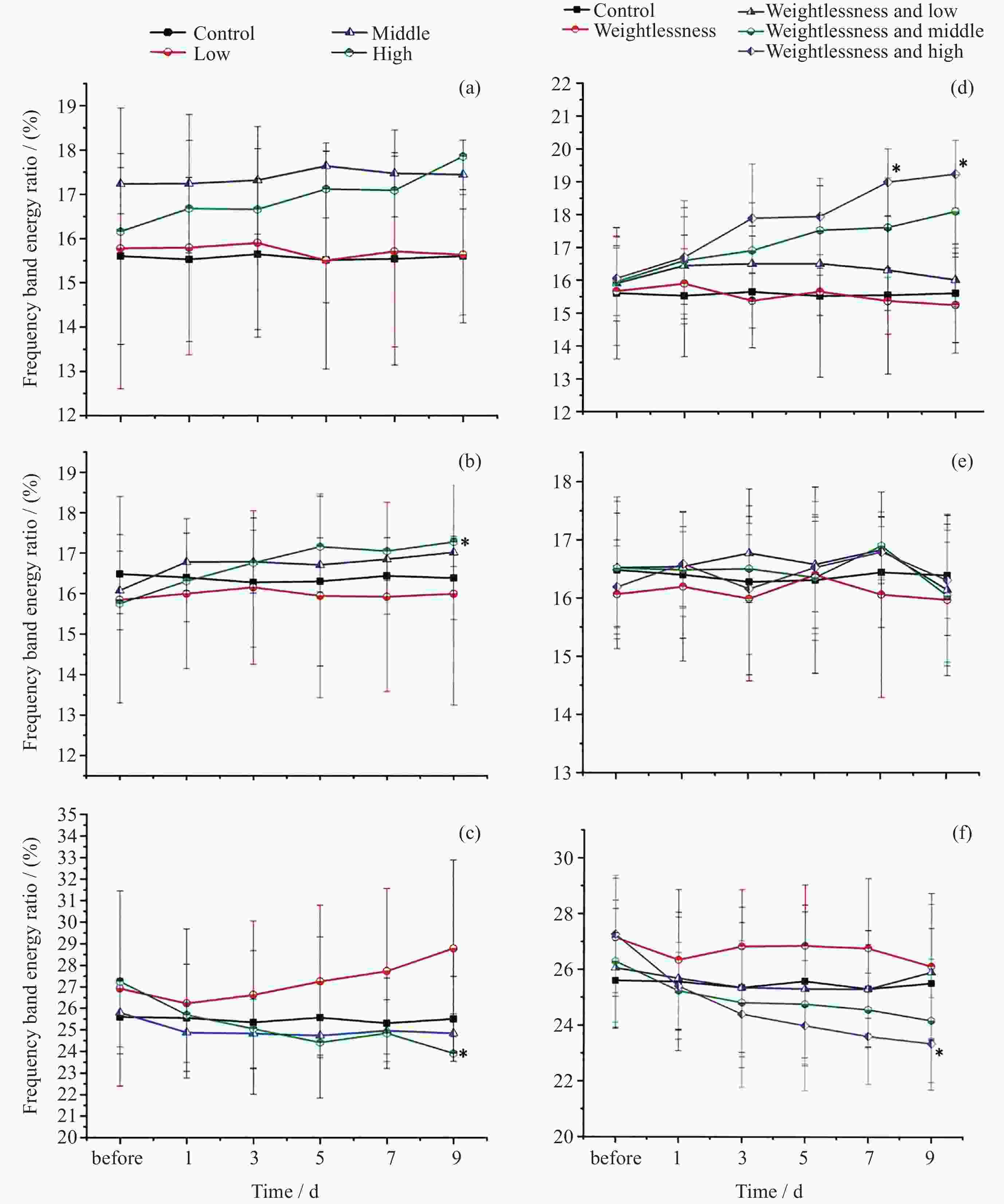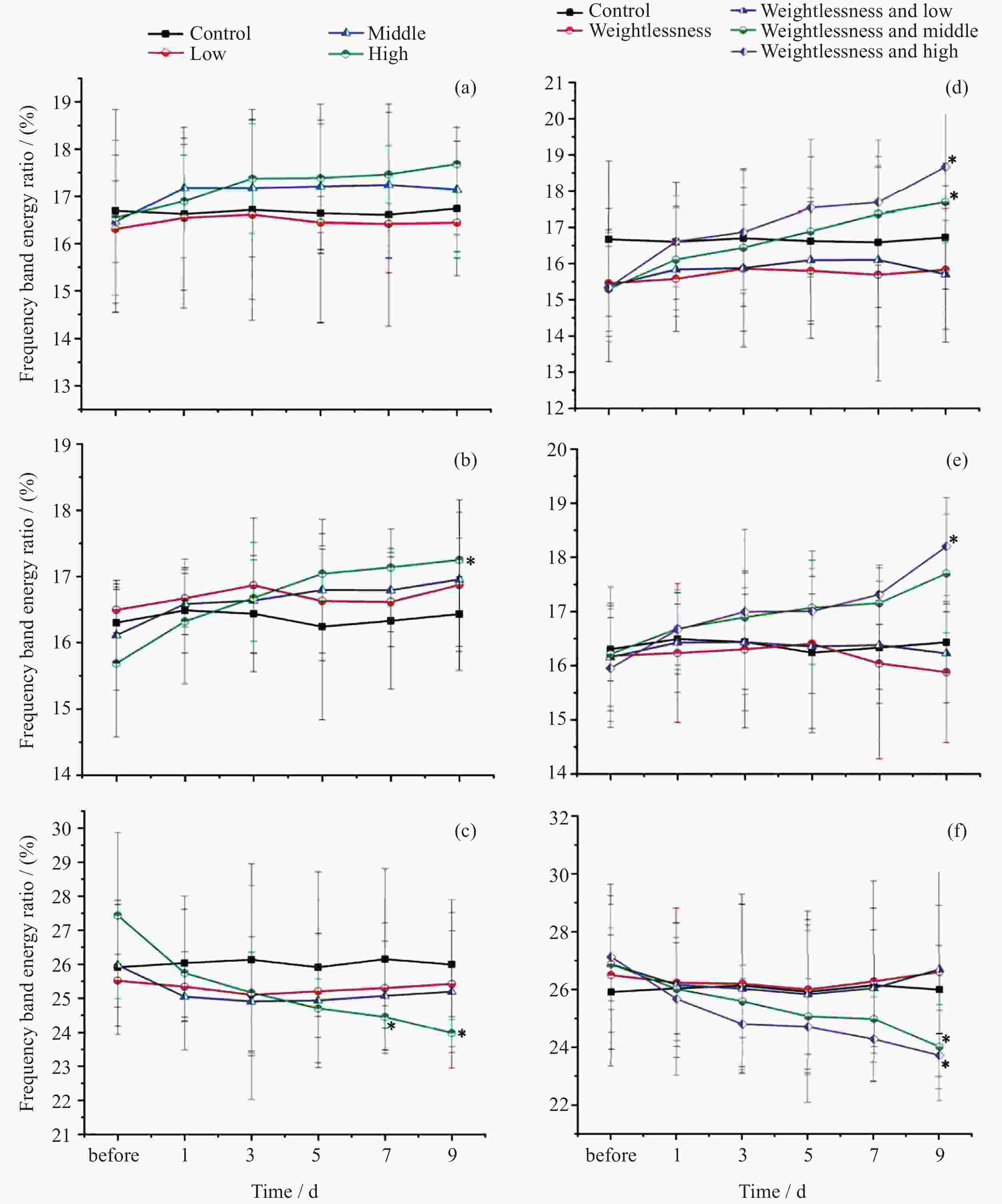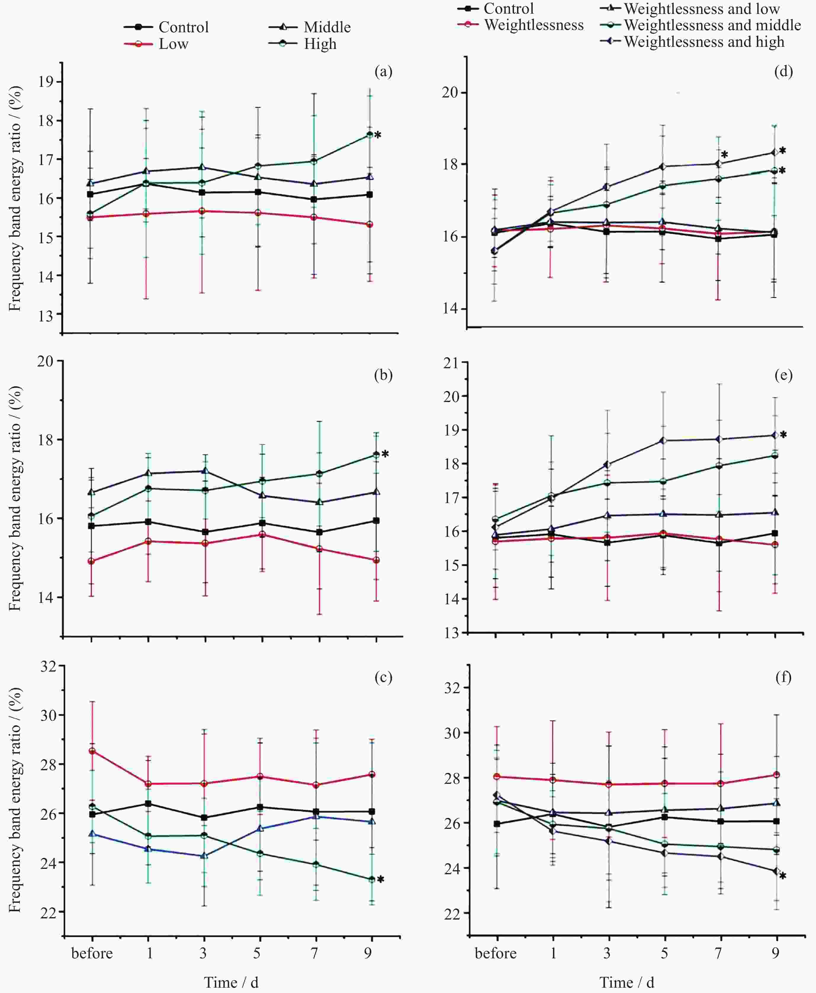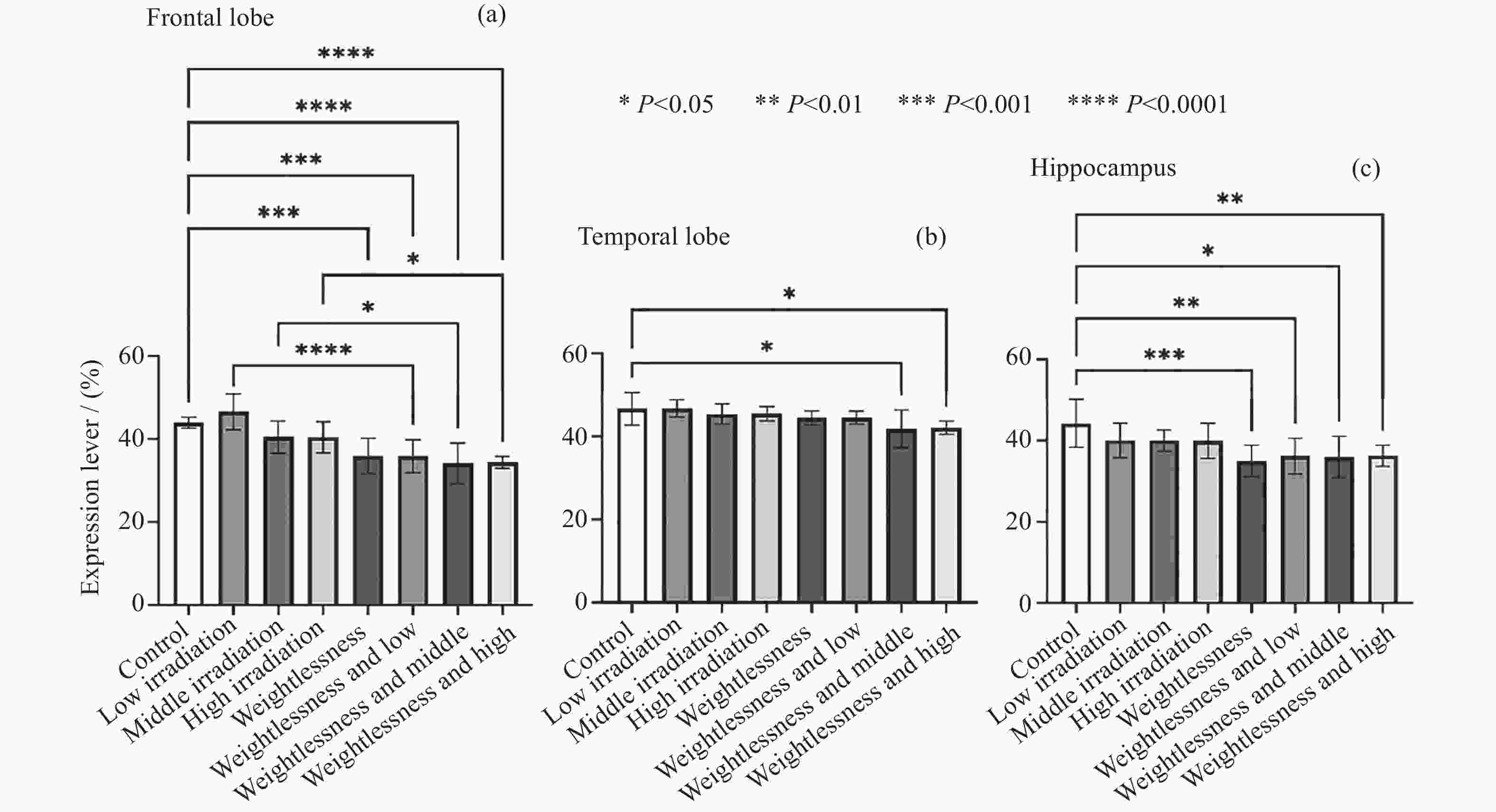 摘要: 通过生物电信号评估辐射与失重对脑的影响, 并揭示其影响规律与损伤机制, 为空间环境风险评估与防护技术研究提供参考. 以SD大鼠为对象, 设立不同实验组. 采集并分析大鼠脑电信号频谱变化, 利用神经网络模型识别脑电信号异常. 同时检测大鼠脑部特定区域的蛋白质表达量变化, 以探讨损伤机制. 辐射组与失重辐射复合组大鼠脑电信号出现慢波化, 复合作用影响显著, 神经网络模型能有效识别异常信号. 辐射与失重导致大鼠脑部髓鞘受损, 相关蛋白表达量出现变化, 提示胶质细胞激活. 辐射与失重对大鼠脑电信号有明显影响, 复合作用效果更为显著, 这可能与髓鞘受损及胶质细胞激活有关. 本研究为空间环境下的风险评估与防护技术提供了重要参考.Abstract: This article aims to assess the impact of radiation and weightlessness on the brain, specifically through the analysis of bioelectrical signals. Our goal is to elucidate the patterns and mechanisms underlying the effects of radiation, weightlessness, and their combined influence on Electroencephalogram (EEG) signals. This understanding will serve as a crucial reference for risk assessment and protective technology research in space environments. A comprehensive study was conducted utilizing SD rats as the experimental subjects. The eight different experimental groups were established to analyze EEG signals and automatically detect abnormal brain signals caused by radiation or weightlessness exposure.To delve deeper into the underlying biological mechanisms, the expression levels of Myelin Basic Protein (MBP), Glial Fibrillary Acidic Protein (GFAP), and ionized calcium-binding adapter molecule 1 (IBA1) were examined in specific brain regions, such as the frontal lobe, temporal lobe, and hippocampus. The study found that rats exposed to radiation alone or in combination with weightlessness showed a marked slow-wave EEG pattern, with the combined effect being more significant, indicating an enhanced effect. The neural network model accurately distinguished normal from abnormal EEG signals. The decrease of MBP and increase of GFAP and IBA1 were observed in the combined radiation-weightlessness groups, suggesting myelin damage and activation of astrocytes and microglias. The study reveals the effects of radiation and weightlessness on brain signals, showing that radiation alone induces slow-wave EEG patterns, and the combination with weightlessness exacerbates these patterns. The mechanism involves myelin sheath damage and glial cell activation. This understanding is crucial for assessing risks and developing protective measures in space, laying the groundwork for future research to improve astronaut safety and well-being.