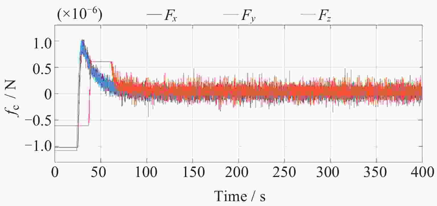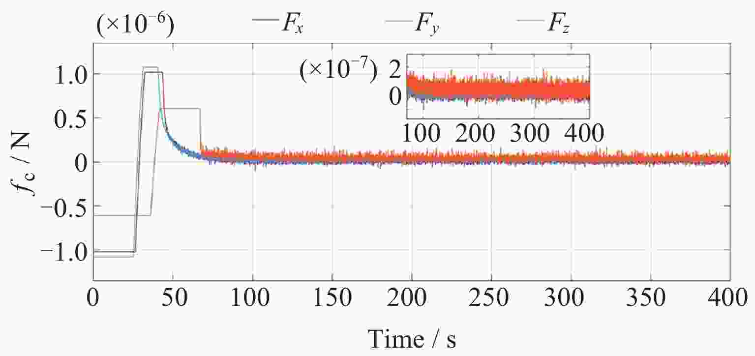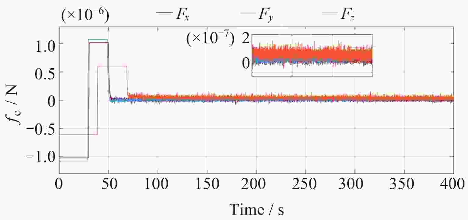 自由度 执行器噪声幅值 量测噪声幅值 x $ < 4.35\times {10}^{-14}\; \mathrm{N} $ $ < 2.24\times {10}^{-7}\; \mathrm{m} $ y $ < 4.41\times {10}^{-13}\; \mathrm{N} $ $ < 2.38\times {10}^{-7}\; \mathrm{m} $ z $ < 4.68\times {10}^{-13}\; \mathrm{N} $ $ < 3.82\times {10}^{-7}\; \mathrm{m} $ $ \varphi $ $ < 4.11\times {10}^{-15}\; \mathrm{N}·\mathrm{m} $ $ < 2.45\times {10}^{-5}\; \mathrm{r}\mathrm{a}\mathrm{d} $ $ \theta $ $ < 4.43\times {10}^{-15}\; \mathrm{N}·\mathrm{m} $ $ < 1.59\times {10}^{-5}\; \mathrm{r}\mathrm{a}\mathrm{d} $ $ \psi $ $ < 4.38\times {10}^{-15}\; \mathrm{N}·\mathrm{m} $ $ < 2.50\times {10}^{-5}\; \mathrm{r}\mathrm{a}\mathrm{d} $ 表 4 执行器饱和