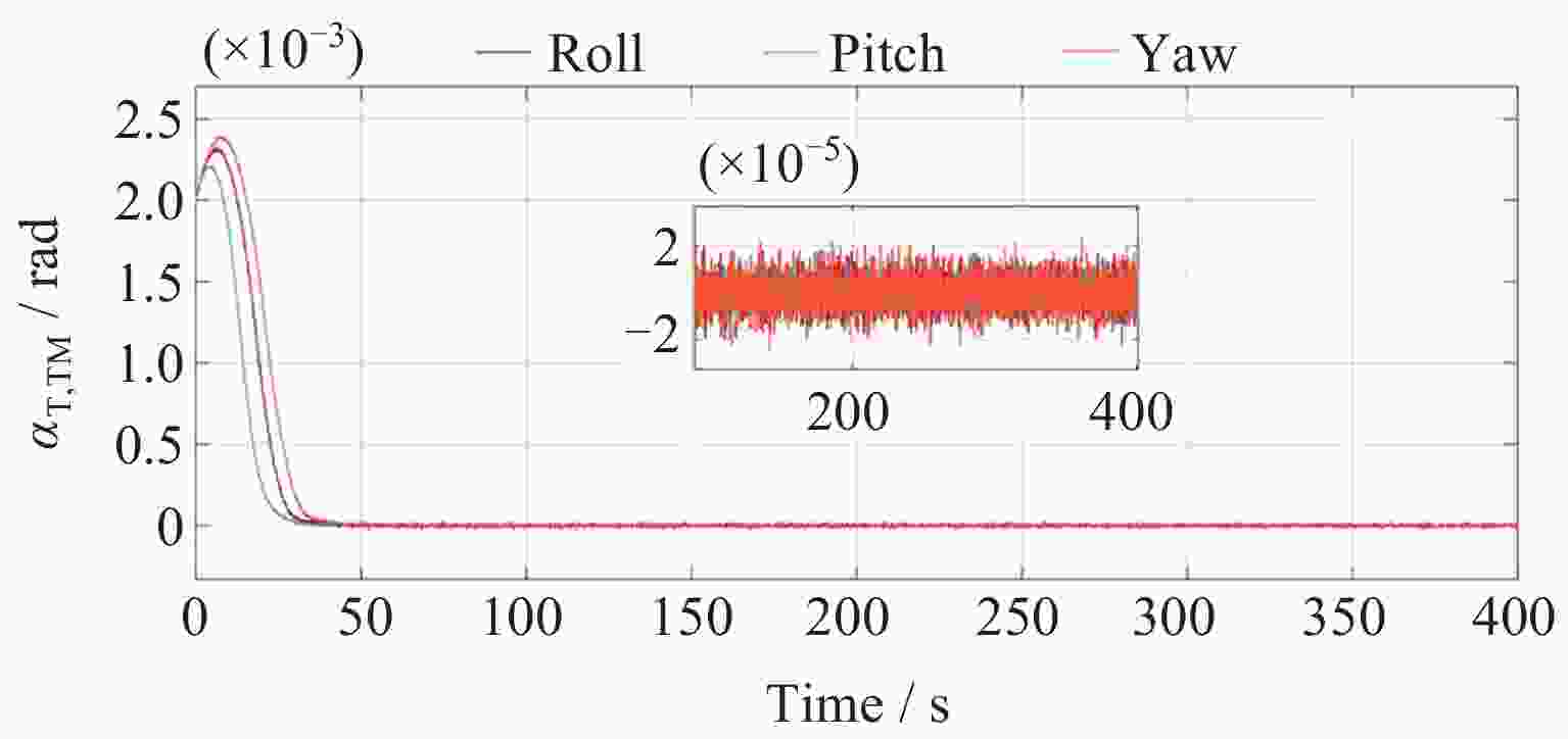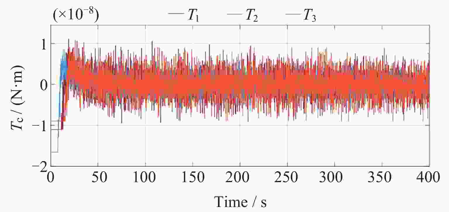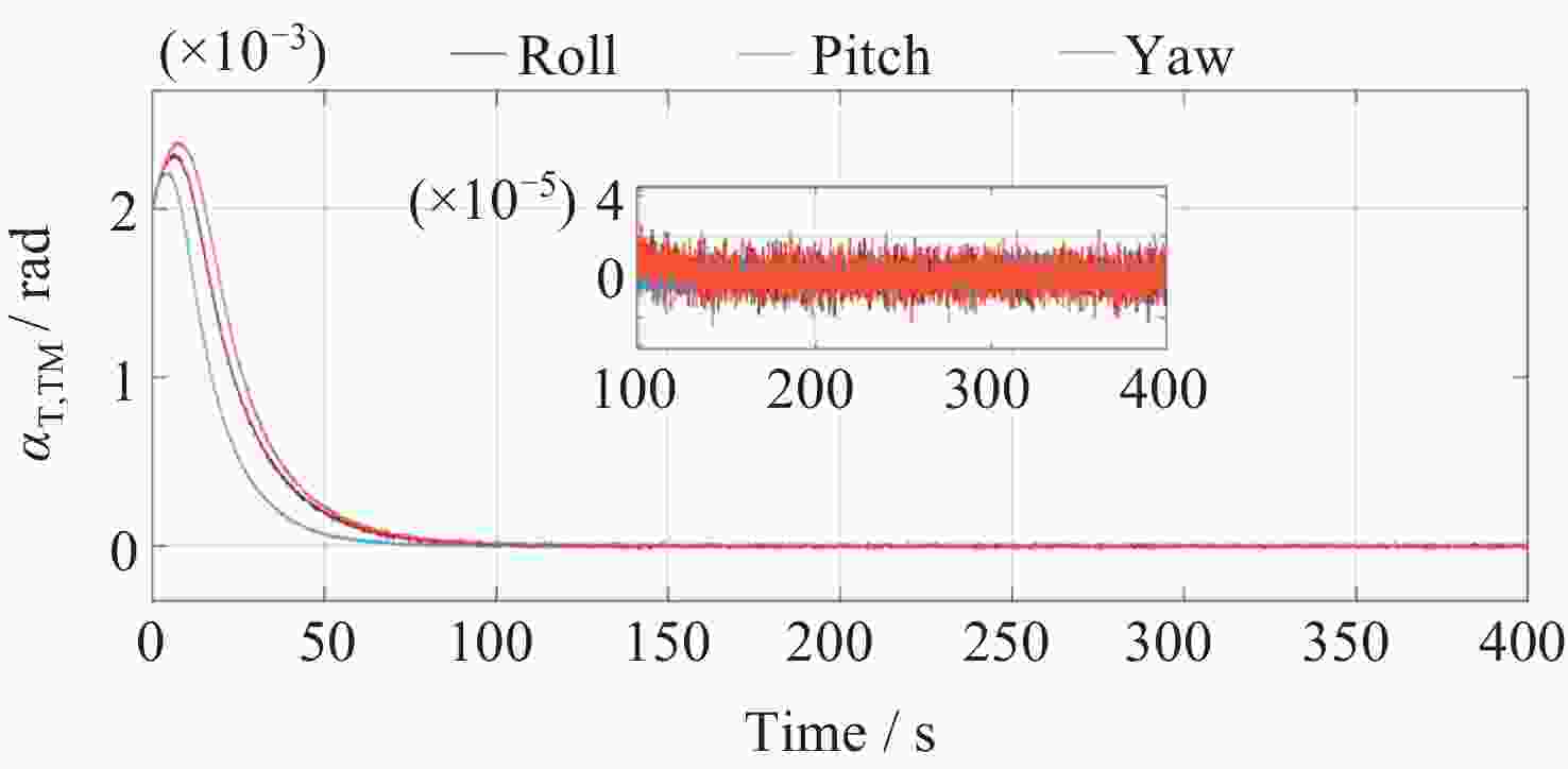 自由度 执行器噪声幅值 量测噪声幅值 x $ < 4.35\times {10}^{-14}\; \mathrm{N} $ $ < 2.24\times {10}^{-7}\; \mathrm{m} $ y $ < 4.41\times {10}^{-13}\; \mathrm{N} $ $ < 2.38\times {10}^{-7}\; \mathrm{m} $ z $ < 4.68\times {10}^{-13}\; \mathrm{N} $ $ < 3.82\times {10}^{-7}\; \mathrm{m} $ $ \varphi $ $ < 4.11\times {10}^{-15}\; \mathrm{N}·\mathrm{m} $ $ < 2.45\times {10}^{-5}\; \mathrm{r}\mathrm{a}\mathrm{d} $ $ \theta $ $ < 4.43\times {10}^{-15}\; \mathrm{N}·\mathrm{m} $ $ < 1.59\times {10}^{-5}\; \mathrm{r}\mathrm{a}\mathrm{d} $ $ \psi $ $ < 4.38\times {10}^{-15}\; \mathrm{N}·\mathrm{m} $ $ < 2.50\times {10}^{-5}\; \mathrm{r}\mathrm{a}\mathrm{d} $ 表 4 执行器饱和