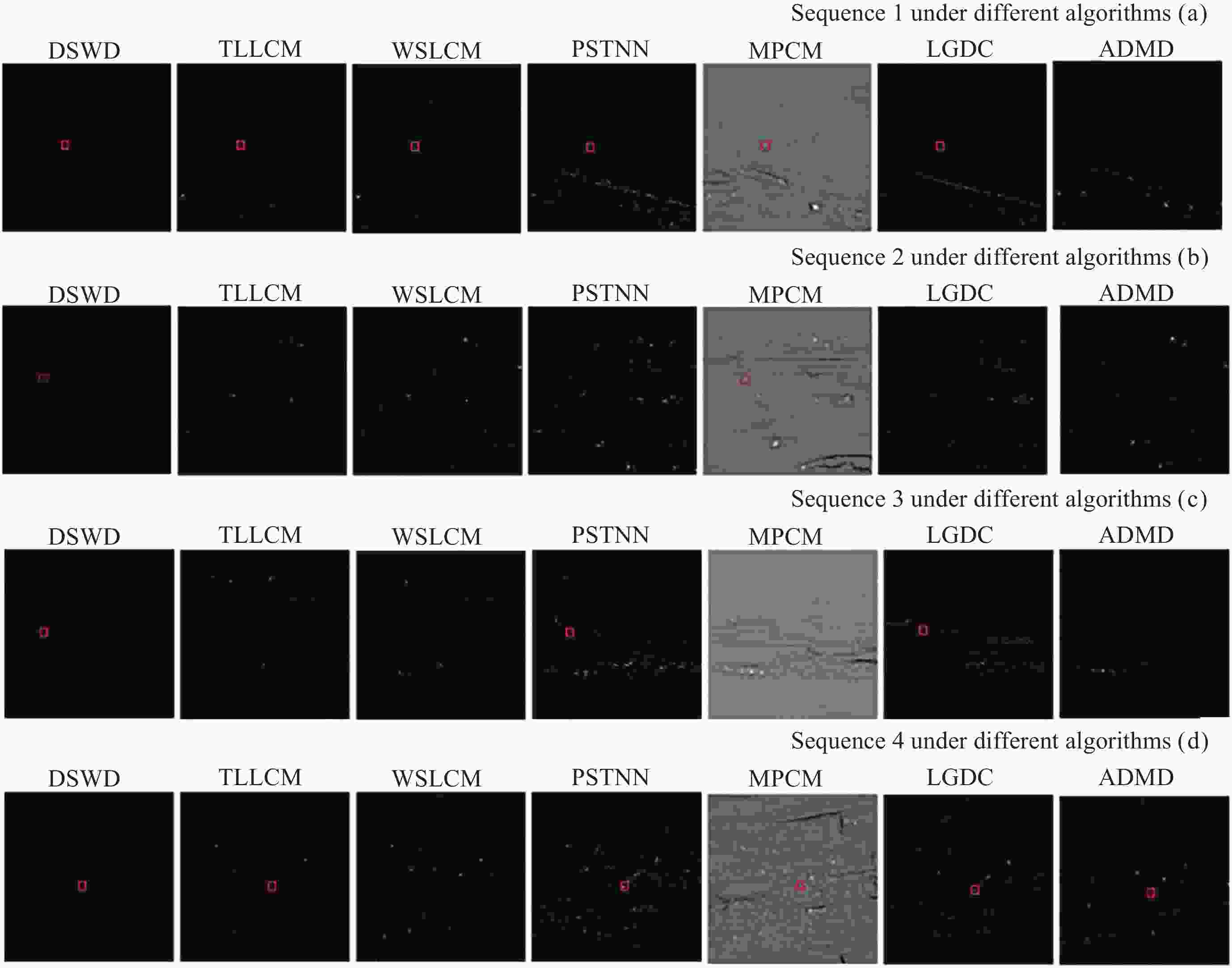 图  6  不同算法在不同序列下的红外弱小目标图像检测结果