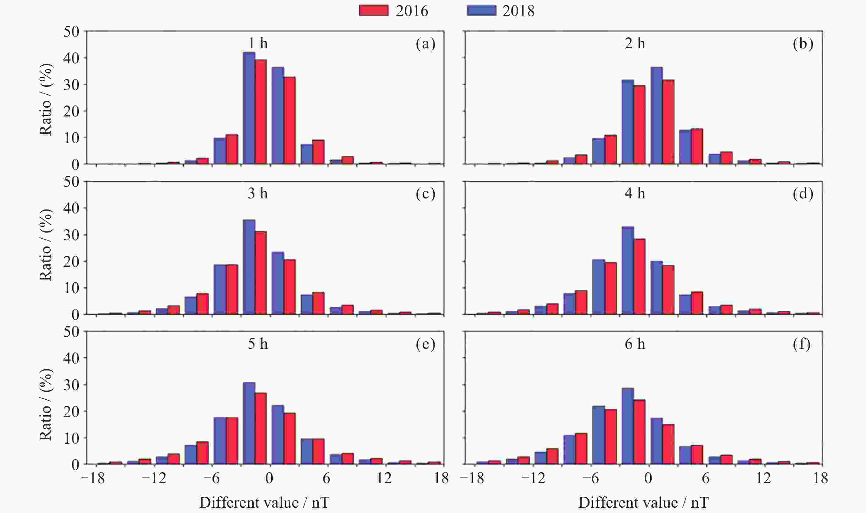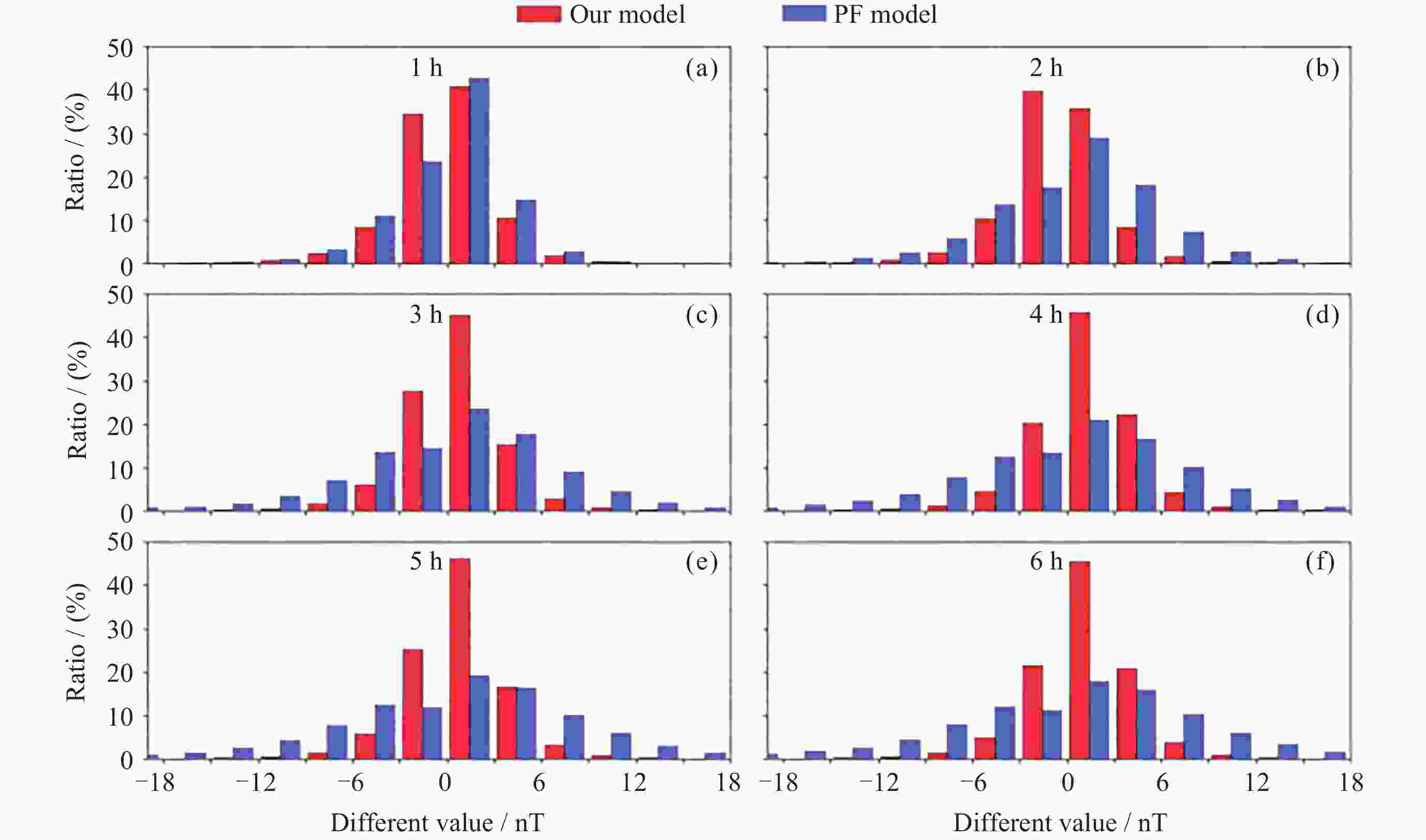 图  7  地磁平静期本文模型与持续预报模型1~6 h差值统计分布对比