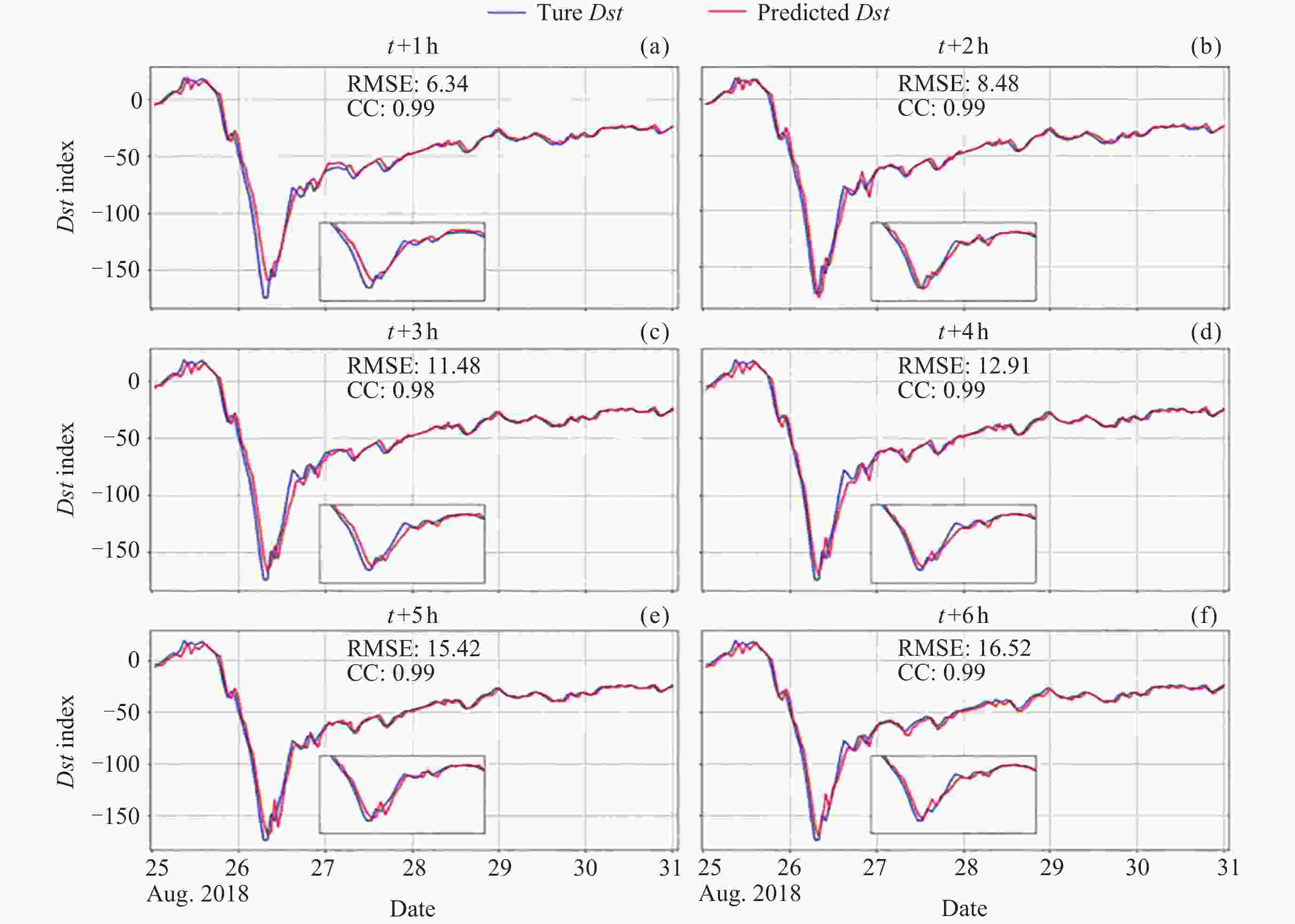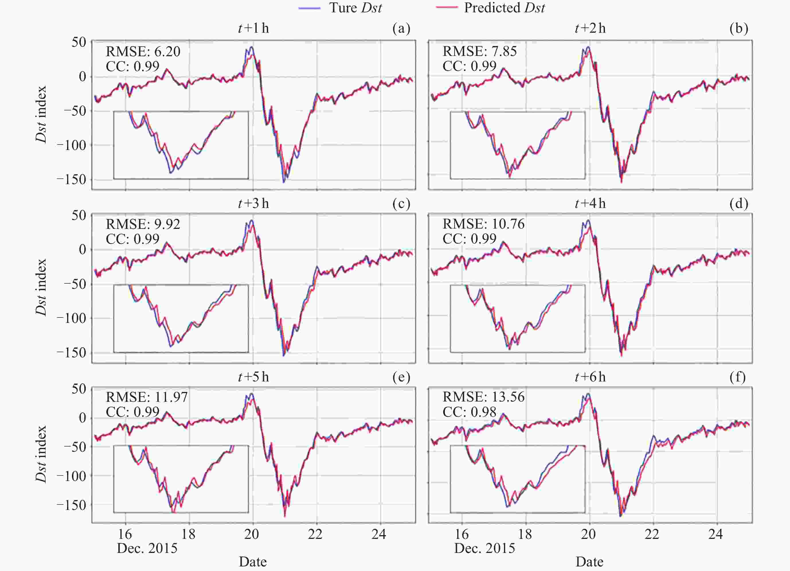Figure  5.  Comparison of the predicted Dst index of 1~6 h forecasts for large magnetic storms