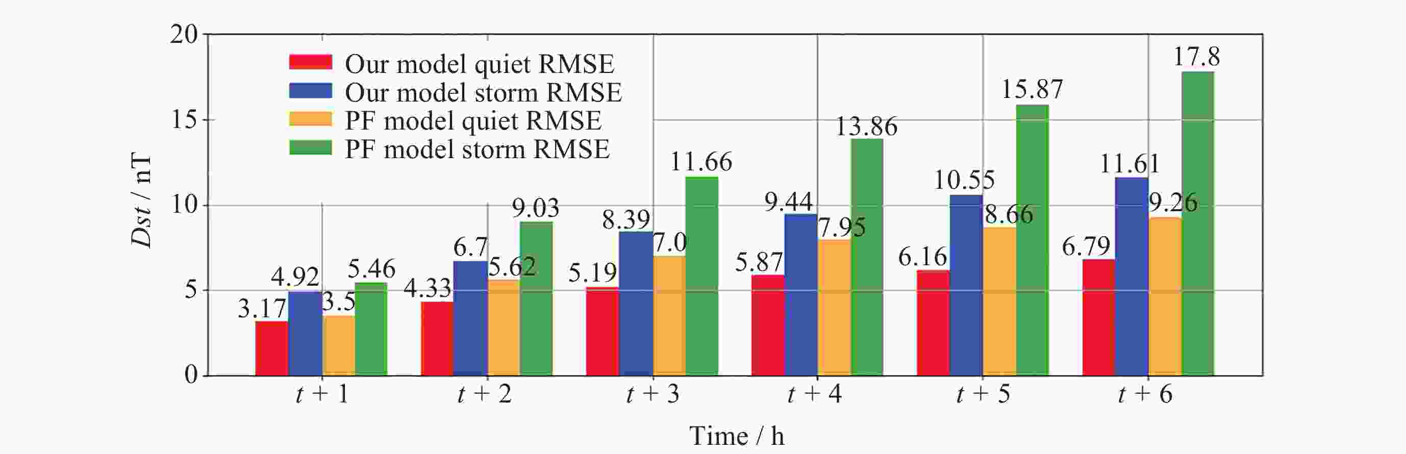 Figure  9.  RMSE of our model and persistence forecasting model during quiet periods and storm periods