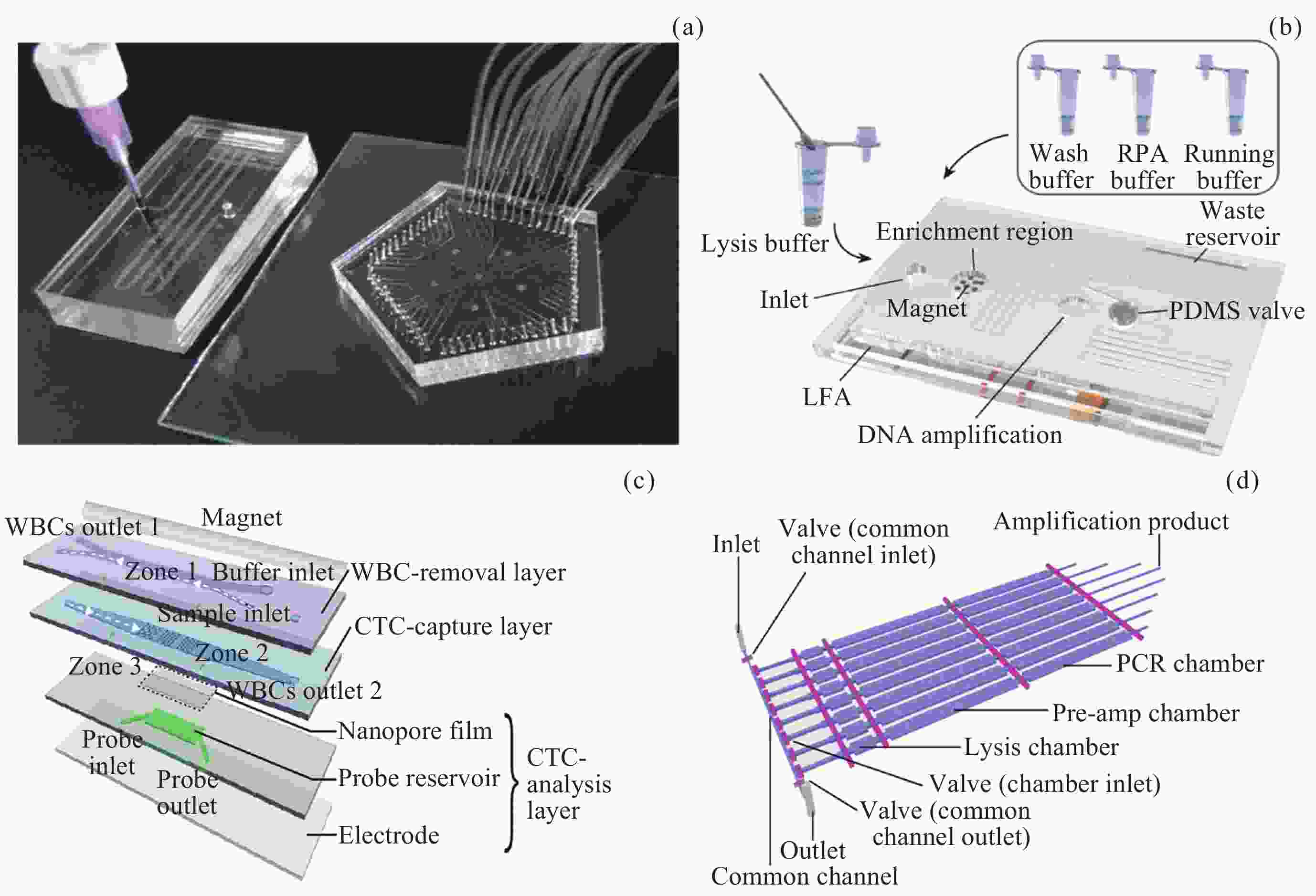 Figure  2.  In vitro detection and diagnostic chip. (a) Microfluidic system integrated with airborne bacterial capture enrichment chip and immunoassay chip. (b) Squeeze-driven hoses and the integrated microfluidic chip. The hoses contain lysis buffer, wash buffer, RPA buffer, and running buffer respectively. (c) NICHE enables removal of WBCs, capturing CTCs, delivery of DNAT probes into living CTCs through the nanopore-enhanced electrodelivery technique for intracellular mRNA relative quantification, and analysis of CTC behaviors in response to immune cells for immunotherapy response prediction. (d) An integrated microfluidic device designed for single-cell MALBAC reactions, showing fluid channels (purple) and control channels (magenta)
