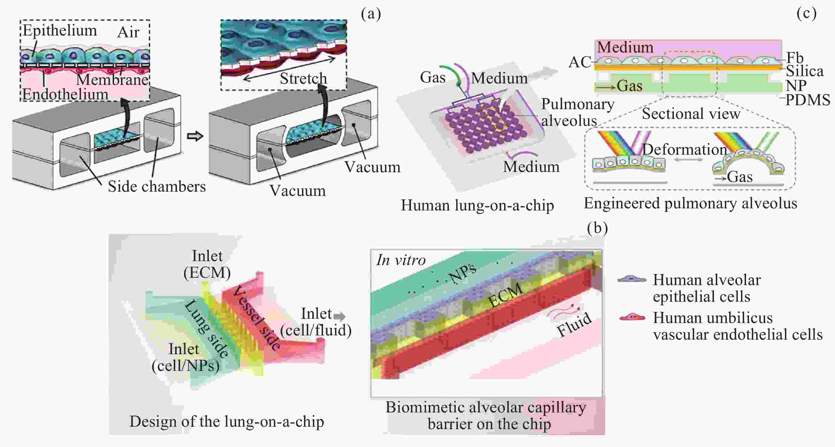 Figure  3.  Lung organ-on-a-chip. (a) Vertical structure lung chip, (b) parallel structural lung chip, (c) bionic 3D lung chip with microphysiological respiration visualization