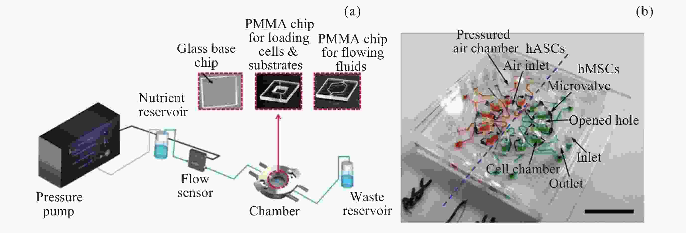 图  4  具有精确控制流量的微流体系统 (a) 与微型细胞芯片(b)