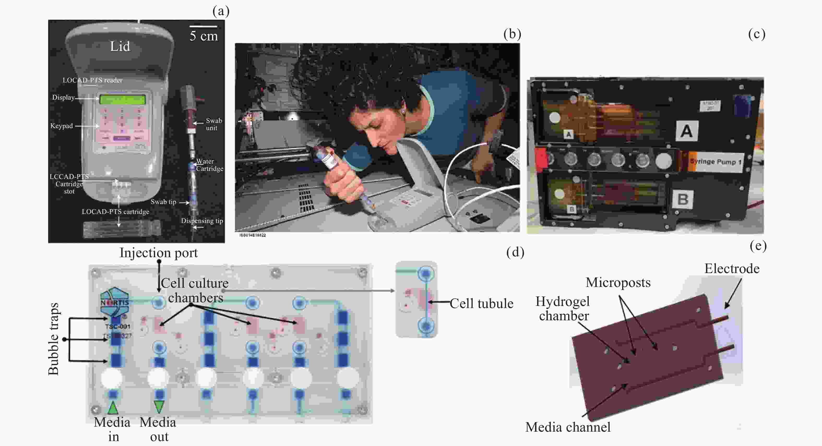 图  5  (a) 芯片实验室便携式检测系统, 由阅读器和拭子系统组成, 用来检测舱内物体表面微生物. (b)远征14/15飞行工程师在空间站上将样本分配到芯片实验室便携式检测系统 (Image courtesy of NASA). (c) 6个Nortis Triplex 芯片集成到KCPP灌注平台. (d) Nortis Triplex芯片. (e)骨骼肌仿生组织芯片