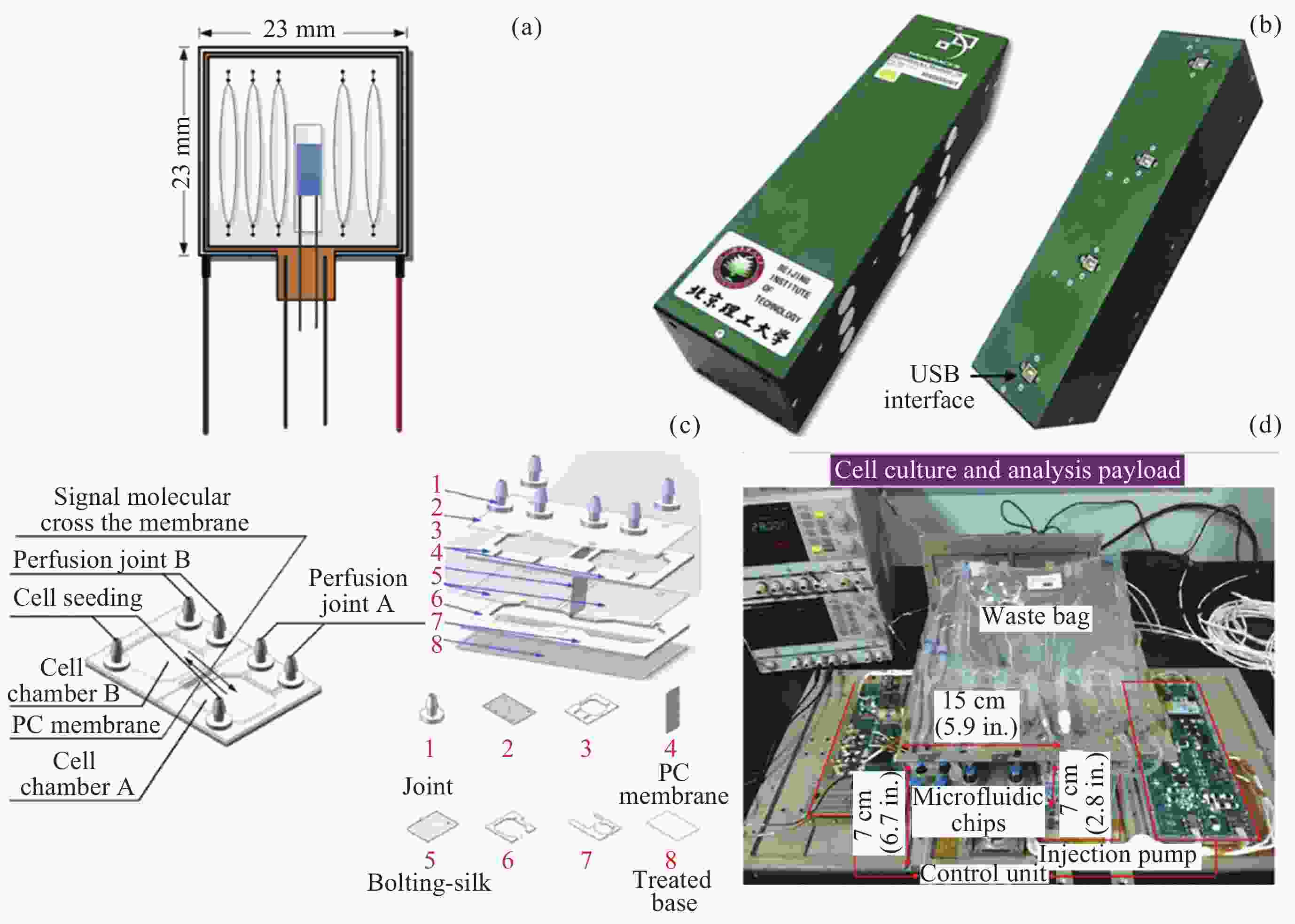 图  6  (a) PCR芯片, (b) 国际空间站实验 IGM-BIT-1 载荷, (c) 细胞共培养微流控芯片, (d) 细胞培养和分析有效载荷
