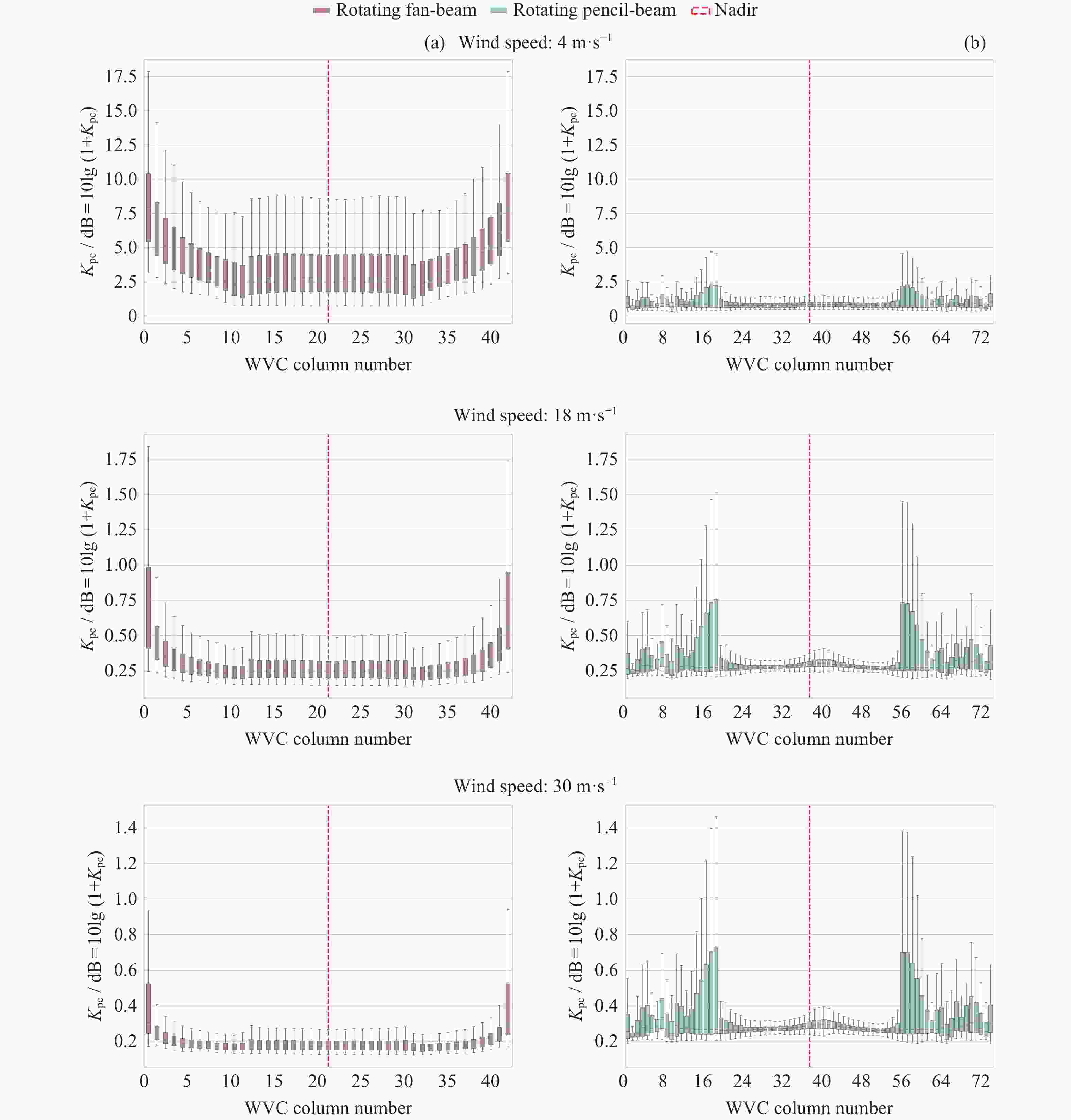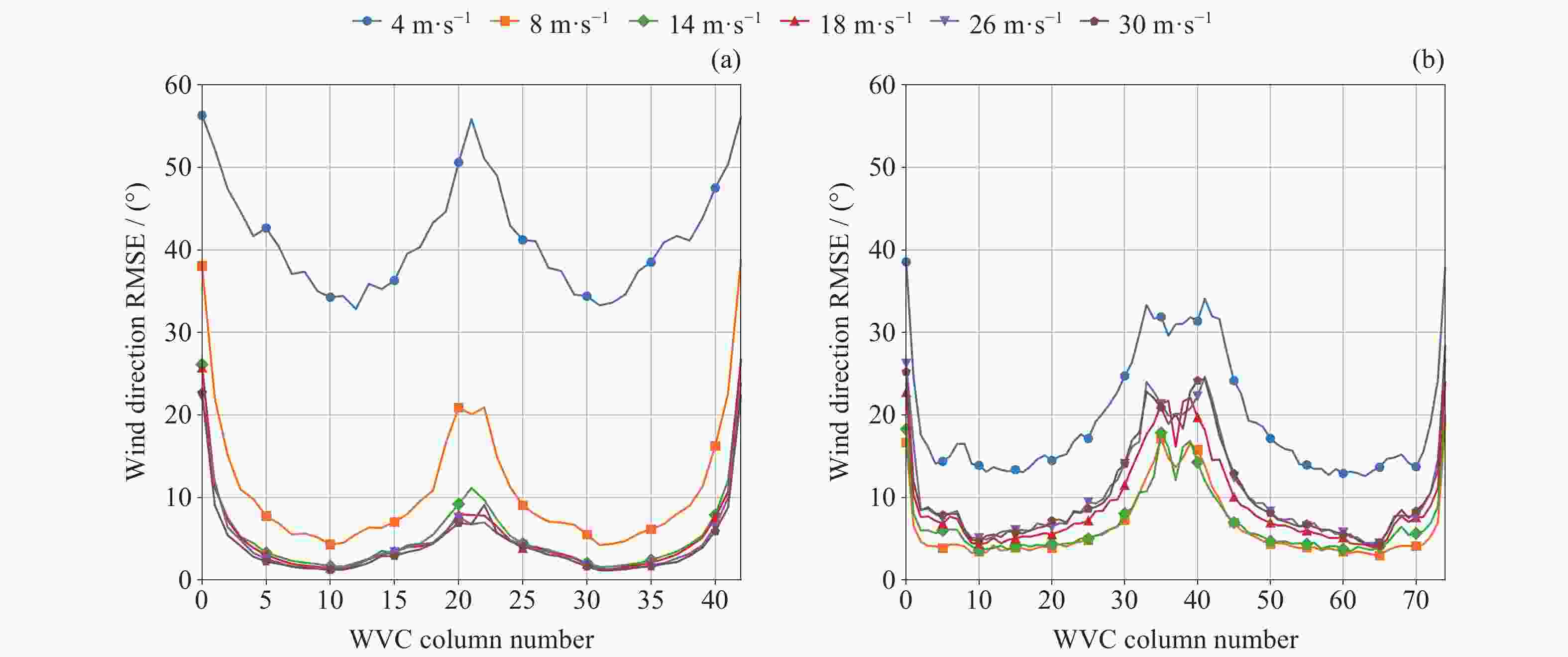 摘要: 高风速风场, 特别是热带气旋风场的散射计观测长期备受关注. 本研究针对我国业务化运行的两种散射计——旋转扇形波束体制散射计和旋转笔形波束体制散射计, 通过系统仿真方法分析其在不同风速条件下的后向散射系数测量精度和风场反演性能, 并评估其对热带气旋的观测能力. 参考现有在轨运行散射计参数得到的实验结果表明, 旋转扇形波束体制散射计各观测视数能够取得更多独立观测样本数, 在20 m·s–1以上高风速风场的后向散射系数测量和风场反演仿真中性能表现更佳. 而旋转笔形波束体制散射计各观测视数拥有更大的归一化信噪比, 在低于20 m·s–1的低风速和中等风速风场观测仿真中性能表现更佳. 研究揭示了两种散射计体制在不同风速区间的性能特点, 对高风速风场反演及热带气旋观测有重要参考意义, 同时, 结论也为后续不同体制散射计设计和信号处理算法改进研究奠定了基础.Abstract: The observation of high speed wind fields, especially tropical cyclone wind fields, has long been an important research subject in scatterometer remote sensing. In this study, we analyzed the backscattering coefficient measurement accuracies and wind retrieval performances of the two scatterometer systems that have been operational in China: the rotating fan-beam system and the rotating pencil-beam system by simulation methods. Simulations at varying wind speed wind fields and tropical cyclone wind fields observations are conducted for both systems. Simulation results obtained with reference to the parameters of existing operational scatterometers show that the rotating fan-beam system demonstrates superior sampling capacity compared to the rotating pencil-beam system, with the vast majority of its observation views gaining a greater number of independent observation samples than 1000, whereas the rotating pencil-beam system has mainly 100~400 independent observation samples for each observation view only. This sampling advantage enables the rotating fan-beam system to achieve better performance in backscattering coefficient measurement and wind field retrieval in the simulations for wind fields with high wind speeds above 20 m·s–1. At the same time, the normalized SNR of each observation view is higher for the rotating pencil-beam system, which is about 300~600 per observation view, compared to 6~14 for the rotating fan-beam system. This SNR superiority enables the rotating pencil-beam system to maintain a more precise observation for wind fields with low and medium wind speeds below 20 m·s–1 in the simulation. This study reveals the performance characteristics of backscattering coefficient measurement and wind field retrieval of different scatterometer systems under various wind speed conditions, which is of reference significance for high speed wind fields retrieval and tropical cyclone wind fields observation. Meanwhile, the conclusions of this study also lay a foundation for subsequent research on the improvement of scatterometer wind field observation accuracy and optimization of signal processing algorithms for different scatterometer systems.