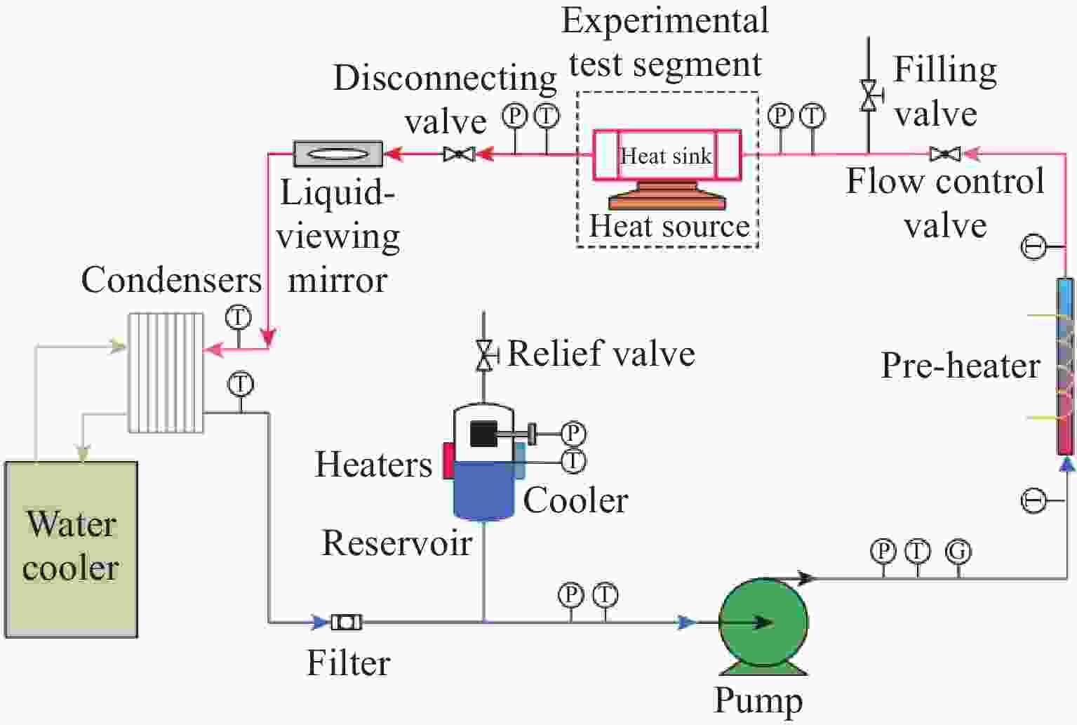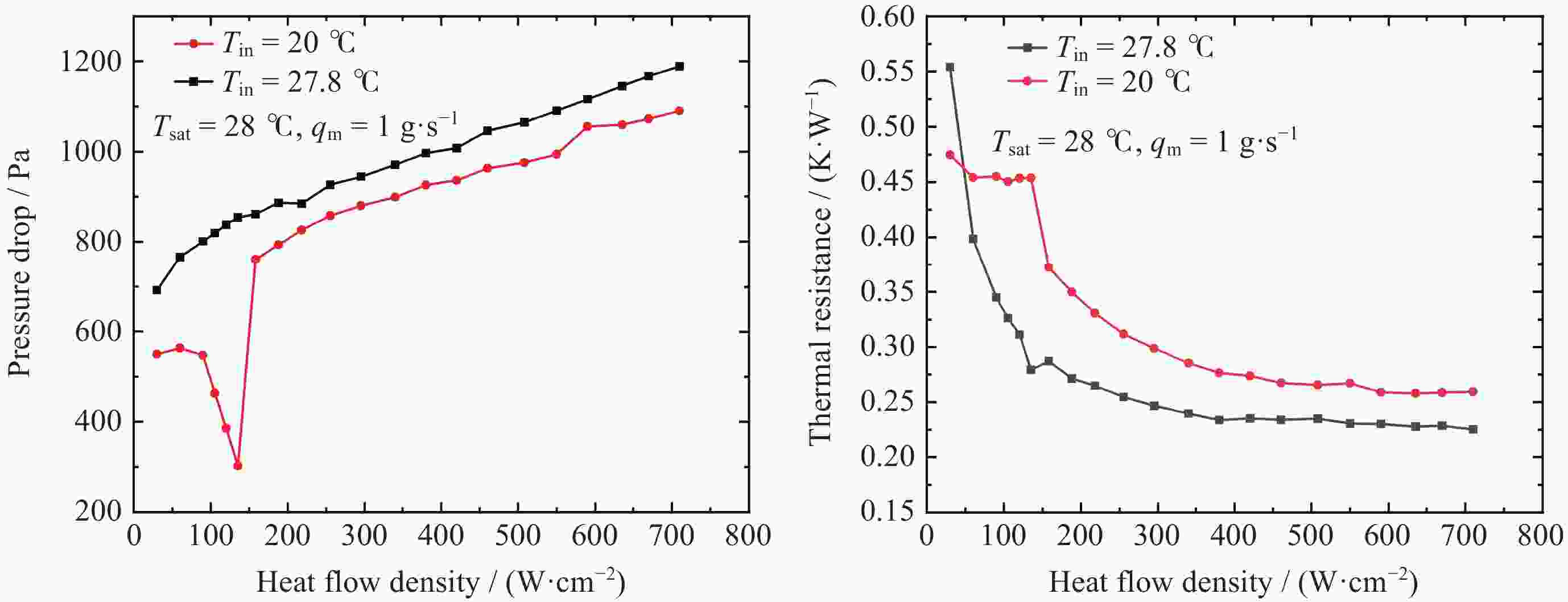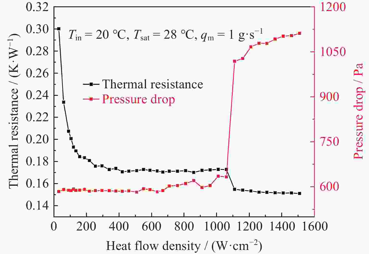 摘要: 微通道散热器是解决高热流密度功率器件的散热难题的有效手段之一, 本文设计并制造了一种适用于高热流散热的金刚石歧管针翅微通道散热器. 利用热测试芯片作为模拟热源, 研究了该散热器在基于氨工质的泵驱两相流回路中的热工性能. 在1510 W·cm–2的局部热流下, 芯片热源表面温度为102.5℃, 热阻为0.151 K·W–1, 压降为1.1 kPa. 研究了进口温度、热流密度、质量流量对散热器热阻和压降的影响, 发现在较高的进口温度条件下散热器的热阻最小. 保持各种工作参数一致, 与铜材质的扩缩流道歧管微通道散热器进行对比, 在710 W·cm–2热流条件下, 金刚石歧管针翅微通道散热器的热阻降低33.32%, 压降降低23.88%.Abstract: A manifold pin-fin microchannel diamond heat sink for high heat flux chips was designed and fabricated. Thermal performance of the heat sink in a pump-driven two-phase ammonia loop was investigated using a thermal test chip as a simulated heat source. Chip surface temperature of 102.5℃ with thermal resistance of 0.151 K·W–1 and pressure drop of 1.1 kPa under localized heat flow of 1510 W·cm–2 were obtained. The effects of inlet temperature, heat flux, and mass flow rate on thermal resistance and pressure drop of the heat sink were investigated, and it was found that the thermal resistance of the heat sink was minimized under higher inlet temperature conditions. Keeping all the other operating parameters consistent, the thermal resistance of the diamond manifold pin-fin microchannel radiator was 33.32% smaller and the pressure drop was 23.88% lower under 710 W·cm–2 heat flow conditions when compared with the expanded and contracted manifold microchannel radiator made of copper.