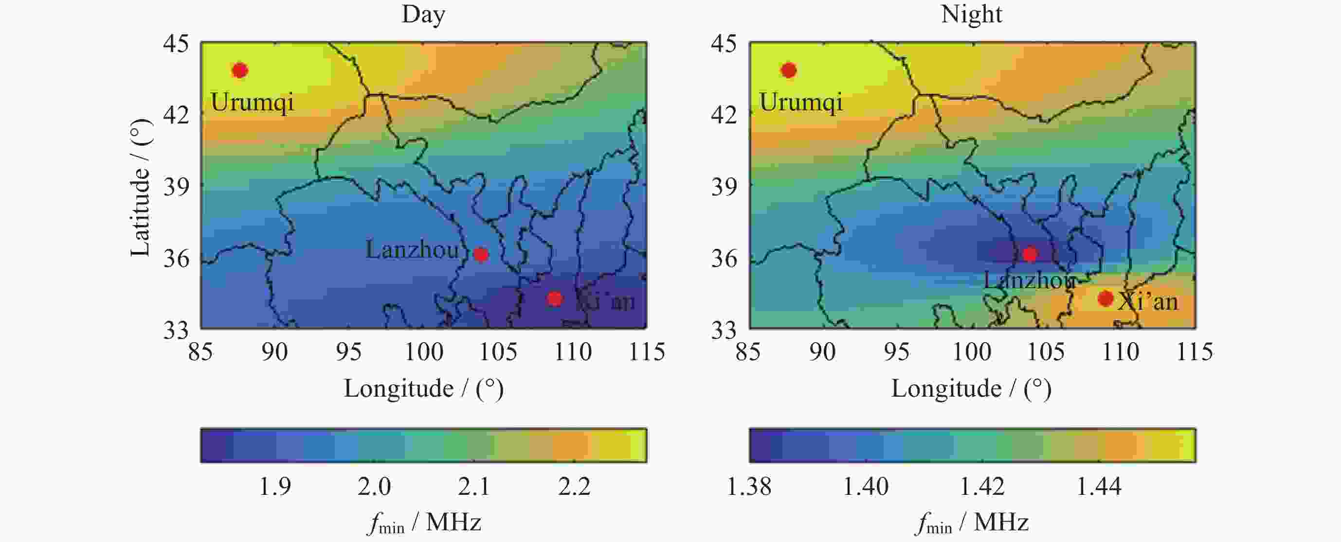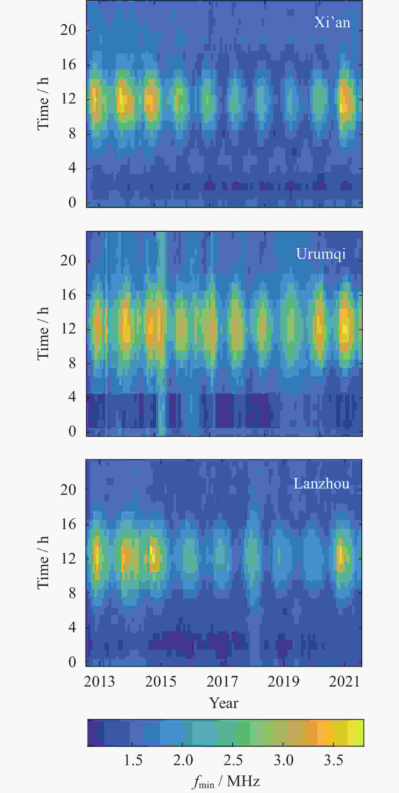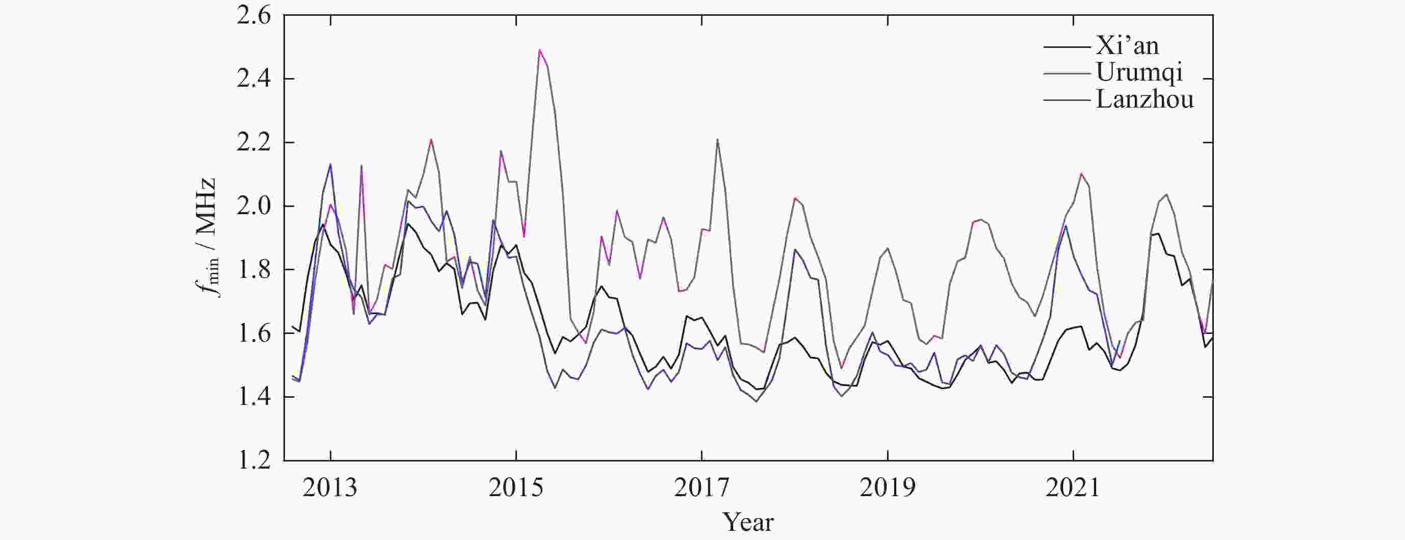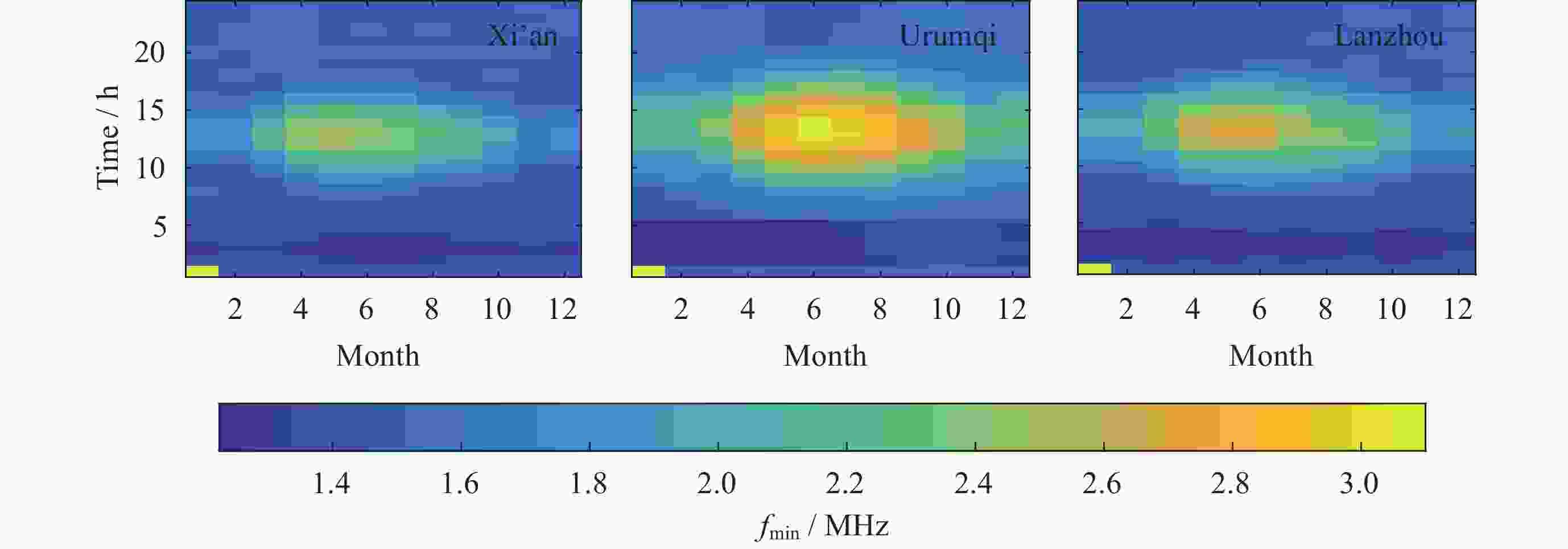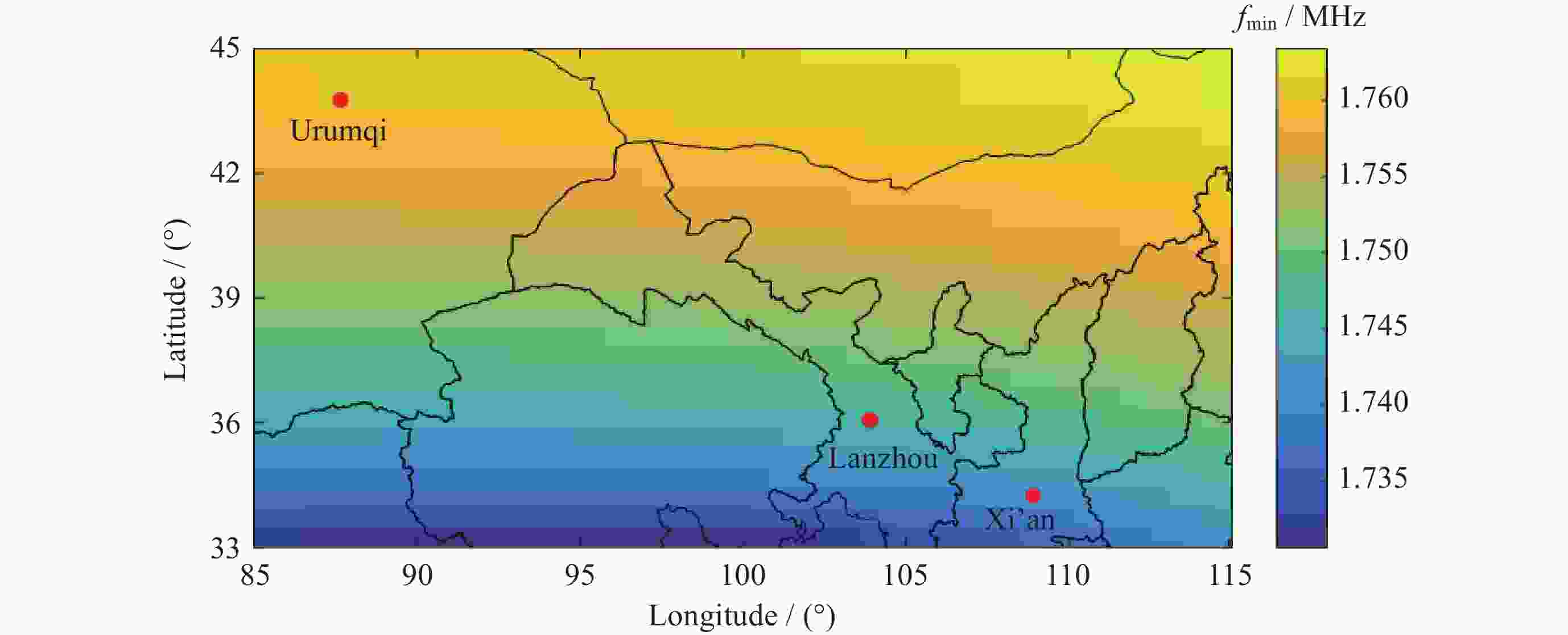 摘要: 电离层fmin是频高图上观测到的回波最低频率, 是电离层垂直探测仪性能的一个重要指标, 也是电离层D区吸收效应研究的重要指标. 本文利用中国电离层垂测站网位于西北走廊地区的西安、乌鲁木齐、兰州三个台站电离层fmin数据, 研究了西北走廊地区电离层吸收的强度特性、空间分布特性、日变化、季节变化及长期变化特性. 开展电离层吸收变化特性研究, 对研究短波通信最低频率选择、天波超视距雷达探测性能评估、甚低频(VLF)远程通信效能预测具有重要应用价值. 同时电离层吸收与D层电子密度关系紧密, 是D层电子密度强弱的重要指标, 开展电离层吸收特性研究, 对于研究D区电离层变化特性, 建立D区电子密度分布模型具有重要科学意义.Abstract: Ionospheric fmin is the lowest echo frequency observed on the frequency height map, which is an important index of the performance of the ionosonde and also an important index for the study of the absorption effect in the ionospheric D region. In this paper, the ionospheric absorption intensity, spatial distribution, diurnal variation, seasonal variation and long-term variation are studied by using ionospheric fmin data from Xi’an, Urumqi and Lanzhou stations of China ionospheric vertical survey network in the Northwest Corridor region. The study of ionospheric absorption variation is of great application value to the selection of the lowest frequency of shortwave communication, the evaluation of detection performance of sky-wave over-the-horizon radar and the prediction of VLF telecommunication efficiency. At the same time, ionospheric absorption is closely related to the electron density of the D layer, which is an important indicator of the intensity of the electron density of the D layer. To study the ionospheric absorption characteristics is of great scientific significance for the study of the ionospheric variation characteristics and the establishment of the electron density distribution model in the D region. The absorption effect of ionospheric region D in the Northwest Corridor mainly occurs in the daytime, with the highest absorption intensity at noon and the weakest in the early morning at night. Meanwhile, the absorption effect of ionospheric region D in the Northwest Corridor has significant seasonal variation characteristics, the strongest in summer and the weakest in other seasons. The ionospheric fmin value of Urumchi at higher latitude is obviously higher than that of Xi’an and Lanzhou at middle latitude, and the absorption effect center has obvious diurnal drift characteristics. The absorption of ionospheric region D in the Northwest Corridor is positively correlated with the intensity of solar activity. In particular, the absorption intensity of ionospheric region D in high solar activity years is significantly higher than that in low solar activity years.