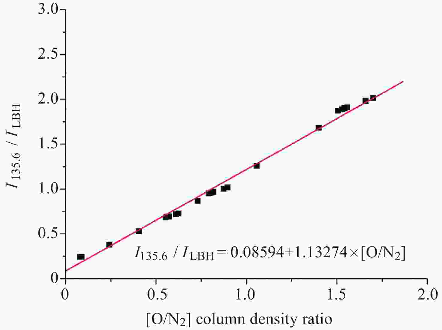 图  3  N2柱密度水平为1017 cm–2、太阳天顶角为0°时模拟IPM 135.6 nm和N2 LBH辐射强度的比值与[O/N2 ]的相关性曲线