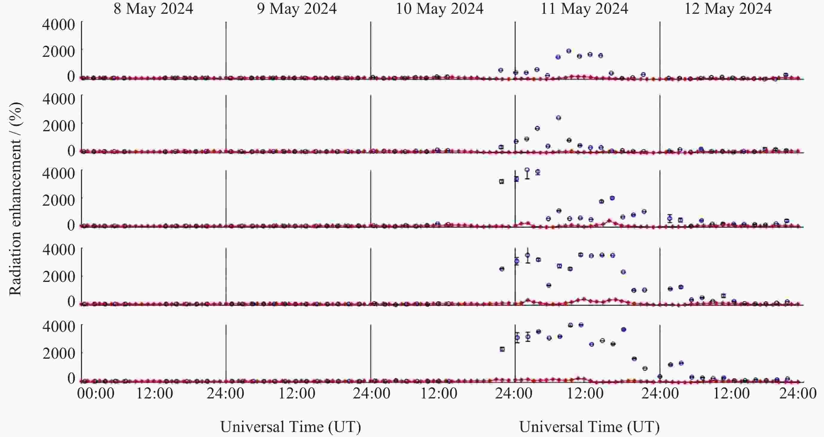 • 摘要: 远紫外气辉探测仪小型电离层光度计IPM随FY-3D卫星于2017年11月15日发射升空, 通过对地测量夜间O+和电子辐射复合产生的135.6 nm辉光辐射、白天光电子碰撞激发产生的OI 135.6 nm 和N2 LBH辉光辐射, 可以反演得到夜间峰值电子密度NmF2、白天大气氧原子与氮气分子的柱密度比O/N2等重要参数. 本文对2024年5月11日特大磁暴事件中IPM的数据响应进行分析, 对白天数据的研究结果表明, 本次磁暴事件过程中, O/N2在各个纬度较磁平静日均是减小的, 可用于解释IGS (International GNESS Service) TEC在各纬度大多呈现的负暴效应. 对夜间数据研究发现,磁暴日夜间135.6 nm辐射强度相对磁平静日呈现各纬度的增大, 增大幅度可达3个数量级, 且从磁暴主相开始一直持续到恢复相, 而对应的TEC数据并没有如此大的增强; 另外, 测量190 nm以上波长辐射贡献的夜间杂散光通道在磁暴日也相应地增强, 而这一波段的辐射机制与电离层并无直接关联.
