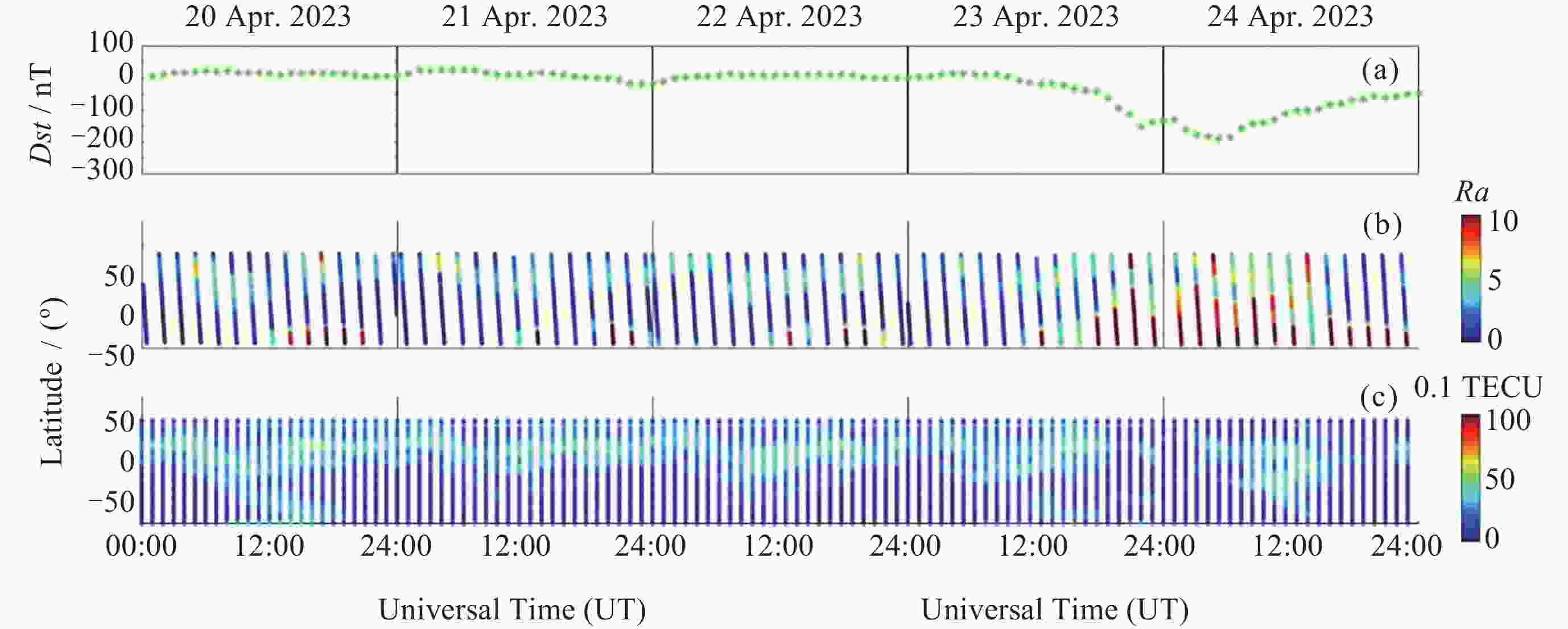 Figure  9.  Distribution of nighttime 135.6 nm channel radiation intensity, IGS TEC and Dst index measured by IPM from 20 to 24 April 2023