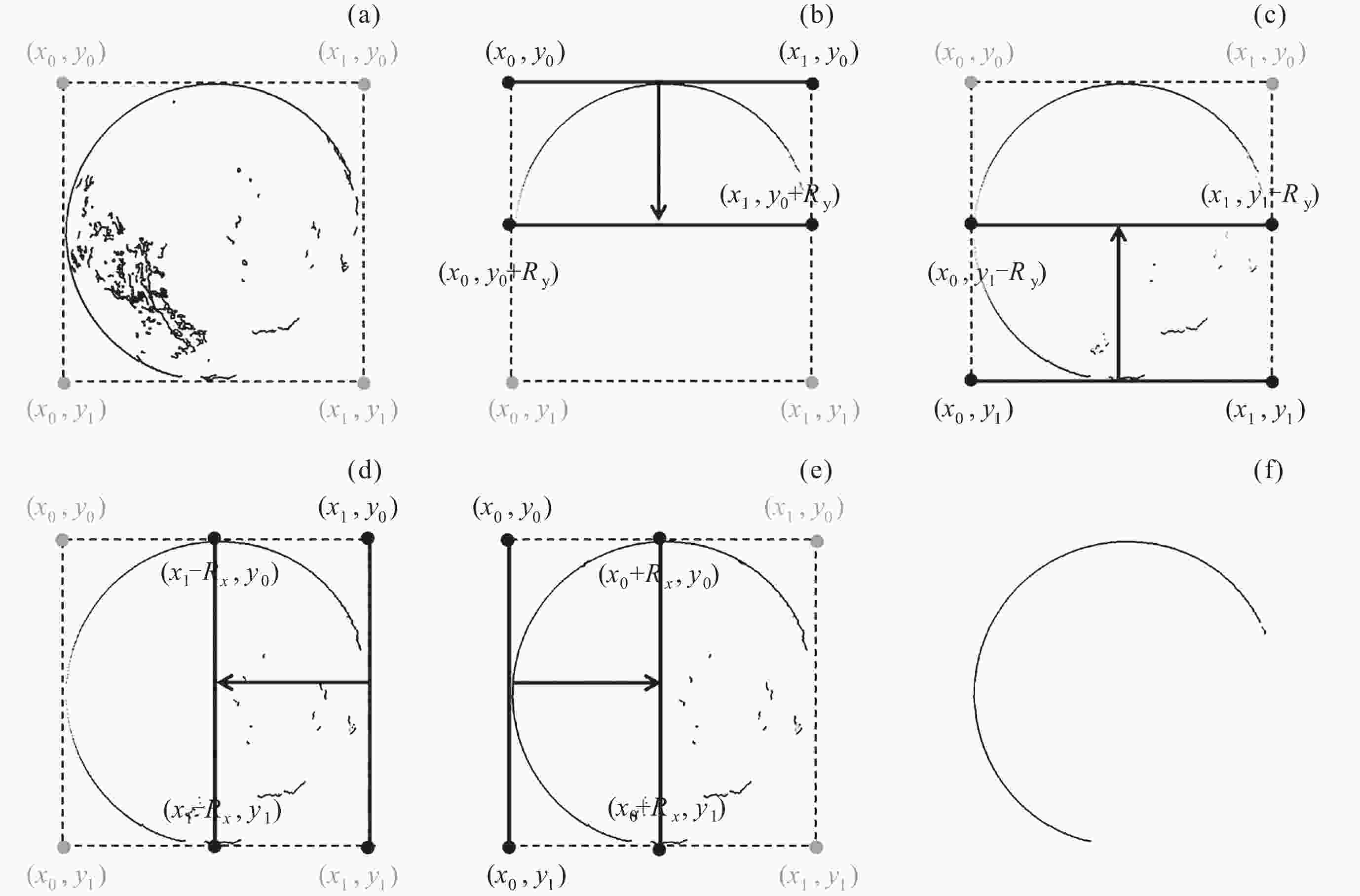 图 4 窗口–边缘检测法的结果. (a) 滤波图像的窗口. (b) Y方向扫描(升序). (c) Y方向扫描(降序).(d) X方向扫描(降序). (e) X方向扫描(升序). (f) 椭圆拟合后的结果