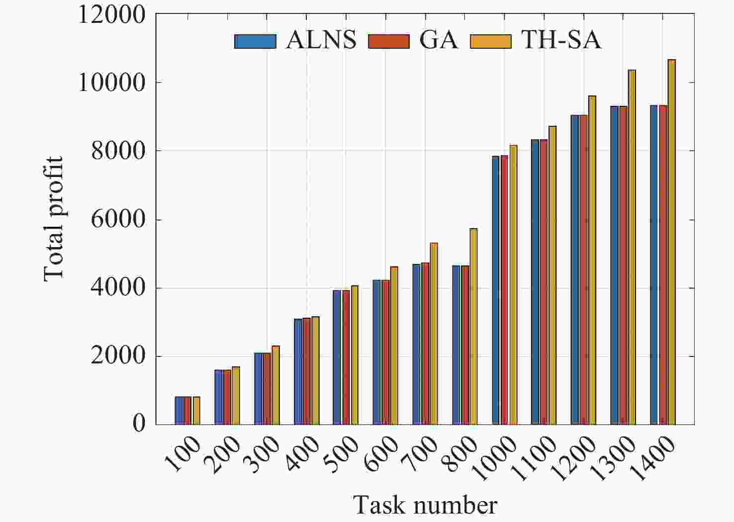 任务集 TH-SA GA ALNS 100 0.1786 0.1715 0.2314 200 0.2907 0.3447 0.4039 300 0.4648 0.4979 0.5386 400 0.7495 0.7929 0.8682 500 0.8572 1.0234 1.0881 600 1.0799 1.3051 1.3983 700 1.2866 1.614 1.7194 800 1.5199 1.8827 1.9788 1000 2.0191 2.8366 2.9503 1100 2.2655 3.2001 3.2477 1200 2.5913 3.5522 3.6606 1300 2.8031 3.8833 3.9863 1400 3.1638 4.6034 4.9579 -
