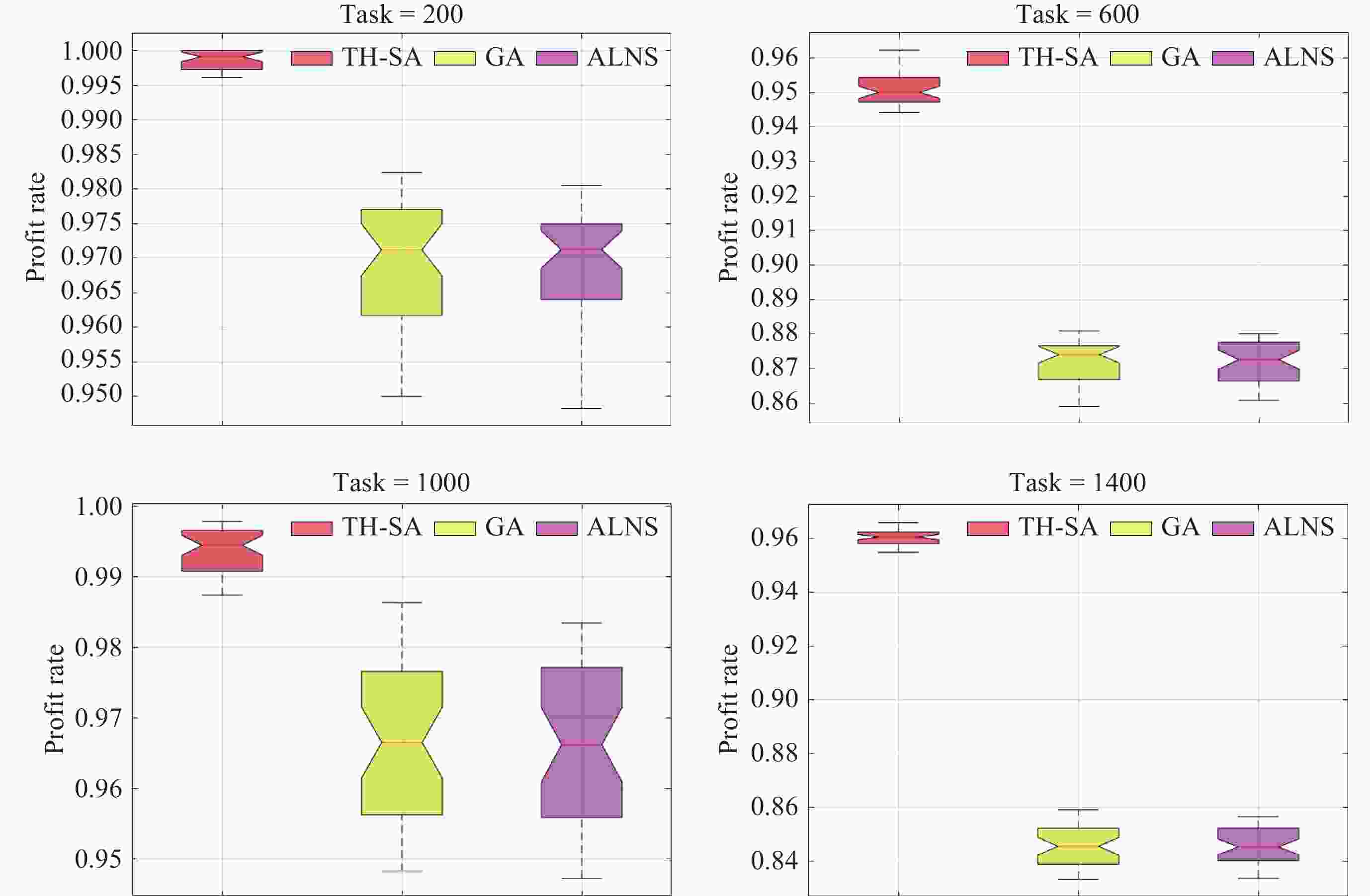 摘要: 近年来, 卫星呈规模化发展且迅速壮大, 对地探测需求随之增长, 面向电磁频谱监测卫星(Electromagnetic Spectrum Monitoring Satellite, ESMS)任务的精细化管控要求越来越高. 卫星任务规划时不考虑动态调整将导致大量时间资源浪费, 因此对任务进行动态调整并分配合适的卫星资源是有效执行监测任务的重要保证. 本文首先构建考虑任务动态调整的任务规划模型, 然后面向任务可调整性设计一种双层混合规划方法(Two-layer Hybrid Scheduling Approach, TH-SA). 该方法第一层采用遗传算法处理不可动态调整的任务序列, 第二层基于启发式规则对可动态调整的任务进行规划. 基于规则的初始化策略和多样化的交叉模式可保证遗传算法的探索和开发效率, 而启发式算法(Heuristic Algorithm, HA)则通过任务调整和资源分配实现可动态调整任务的优化调度. 通过对任务分类处理, 在保证不可动态调整任务完成率的同时, 提升算法对可动态调整任务的规划效率. 仿真实验验证了算法在不同规模任务规划中能保持较高的收益, 有效提升电磁频谱监测卫星资源的应用效益.Abstract: In recent years, there has been a significant and rapid expansion in the satellite field, with a corresponding increase in the demand for Earth observation. This led to a growing need for sophisticated management of Electromagnetic Spectrum Monitoring Satellite (ESMS) missions. Neglecting to incorporate dynamic adjustments in satellite mission planning will lead to a considerable loss of time and resources. Dynamic adjustments to missions and allocation of appropriate satellite resources are crucial for the effective execution of monitoring tasks. This paper begins by developing a mission planning model that incorporates dynamic adjustments. Subsequently, we introduce a Two-layer Hybrid Scheduling Approach (TH-SA) designed for task flexibilty. The approach uses a genetic algorithm in the first layer to deal with non-dynamically adjustable task sequences. The second layer relies on heuristic rules to plan dynamically adjustable tasks. A rule-based initialization strategy and diverse crossover patterns enhance the exploration and exploitation efficiency of the genetic algorithm, while the heuristic algorithm optimizes the scheduling of dynamically adjustable tasks through task reconfiguration and resource allocation. By categorizing and processing tasks, the algorithm enhances the efficiency of planning for dynamically adjustable tasks and ensures the completion rate of those that are not dynamically adjustable. Finally, simulation experiments confirm that the algorithm maintains high performance in task planning of varying scales, demonstrating its effectiveness in improving the performance of Electromagnetic Spectrum Monitoring Satellite task planning.
