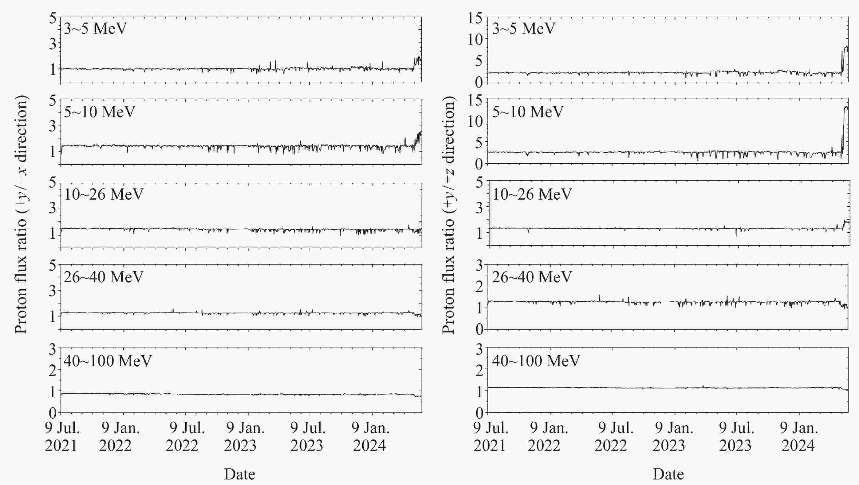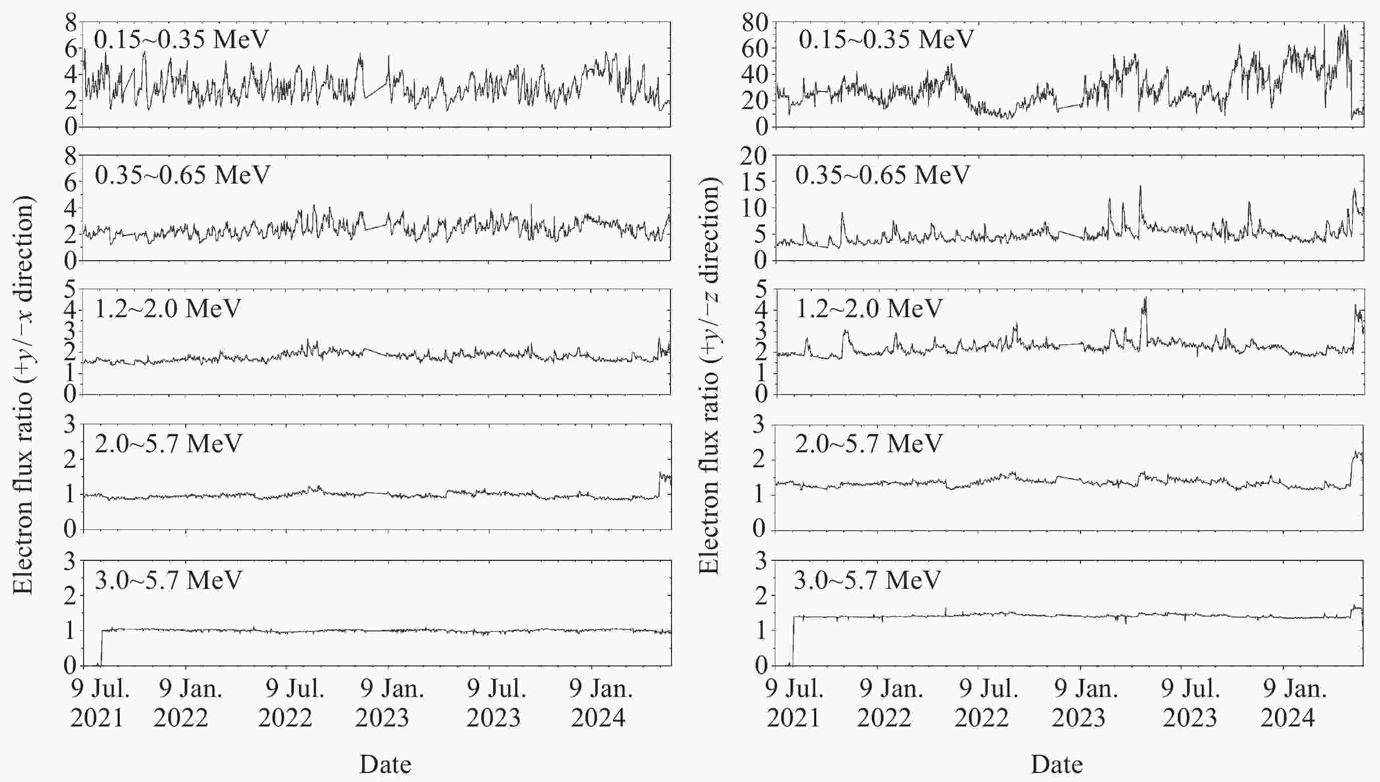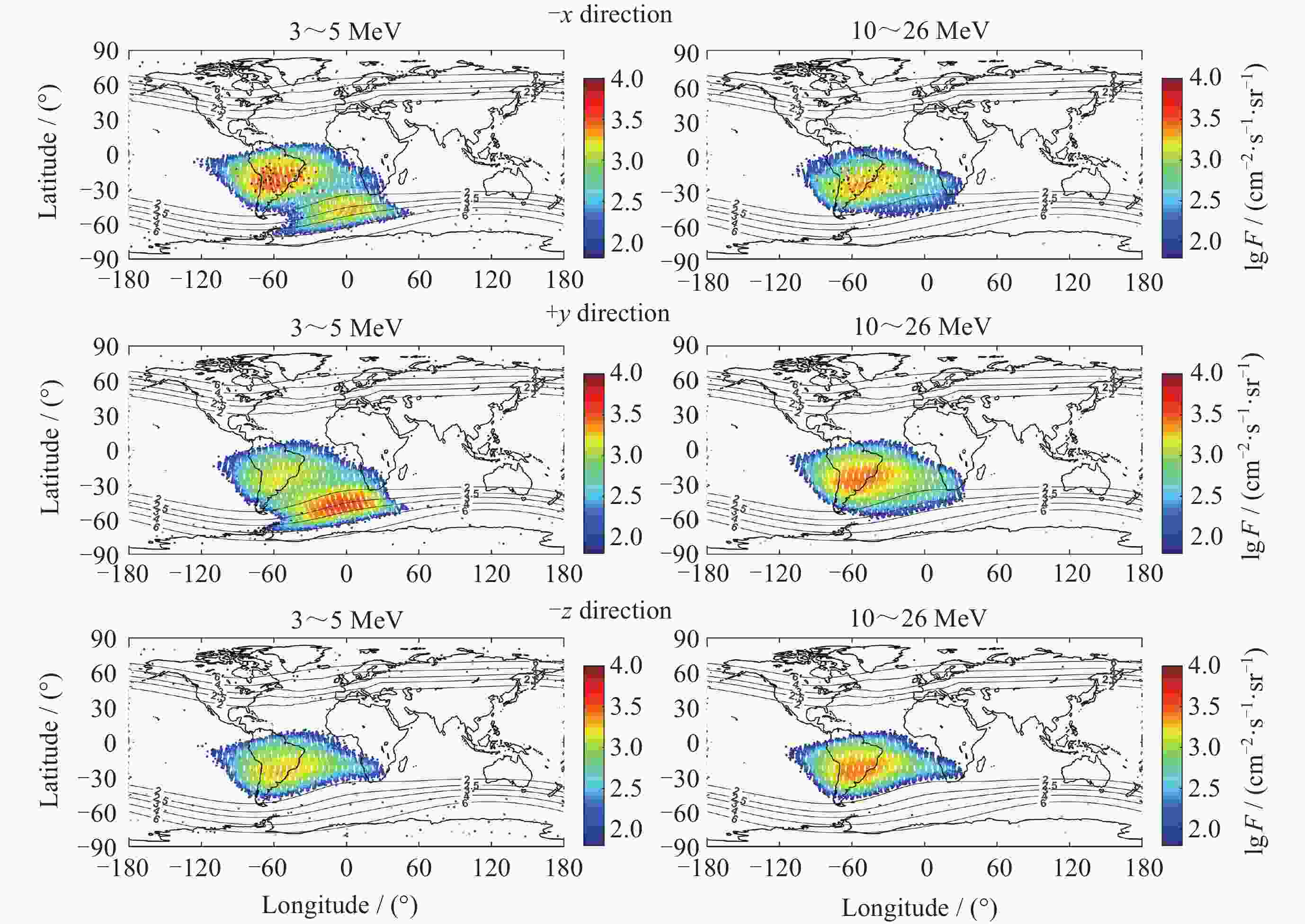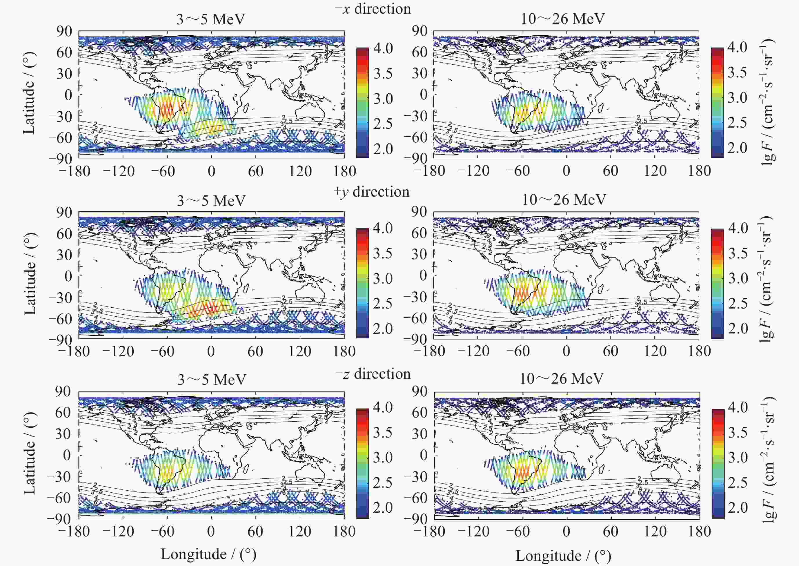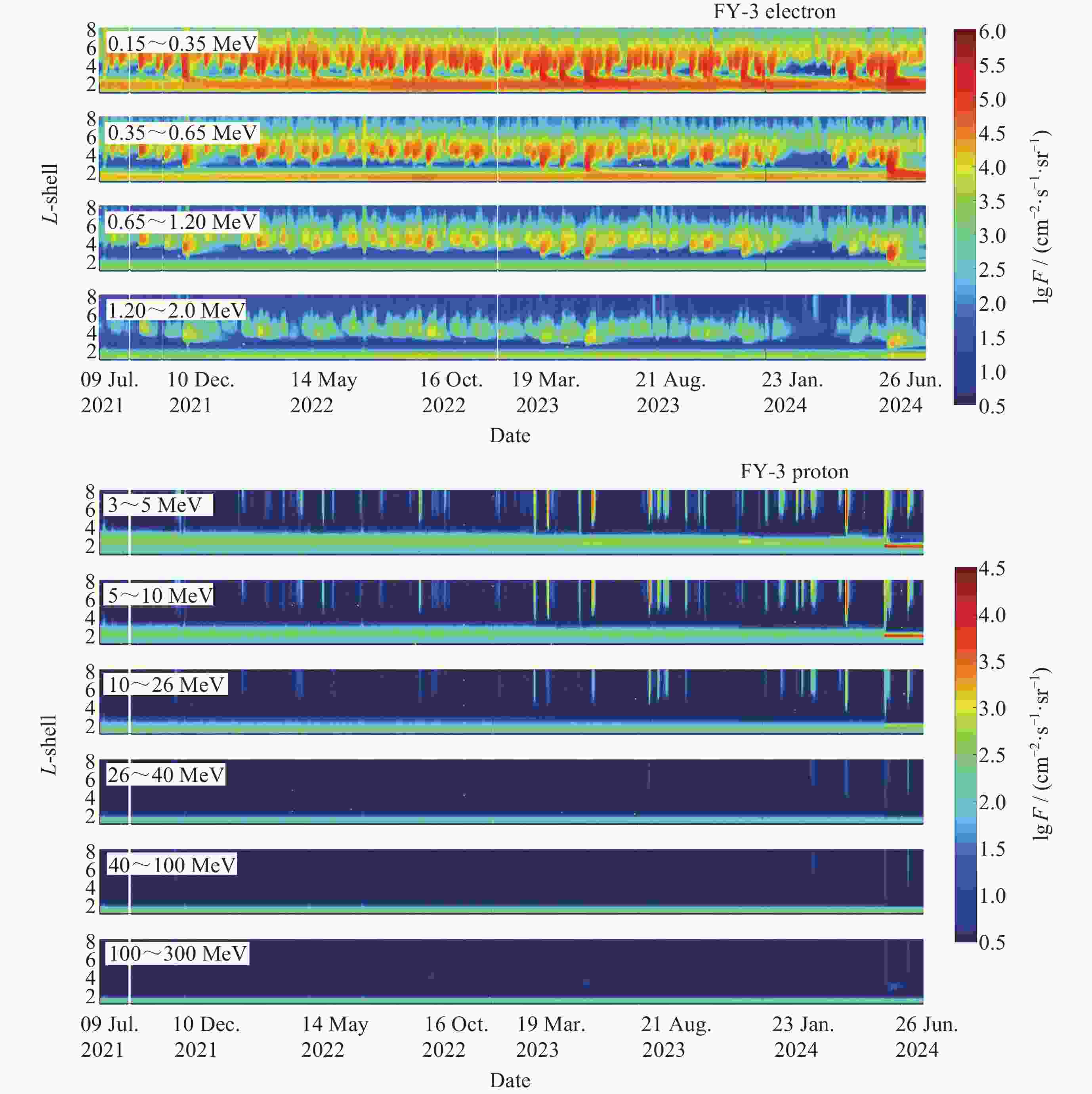 摘要: FY-3E卫星高能粒子探测器开展轨道空间高能电子和高能质子监测, 可获取卫星本体三个方向(–z朝天向、–x飞行反方向和+y垂直轨道面方向) 0.15~5.7 MeV的高能电子和 3~300 MeV的高能质子数据. 通过分析高能粒子探测器2021年7月至2024年5月高能质子、高能电子探测数据, 得到卫星本体三个方向高能质子和高能电子空间分布区域及长时间演化结果. 研究表明, 能量越低, 分布范围越大, 结构越复杂, 其中较低能量的电子在南北高纬度上呈现出多条带结构; 电子通量强度+y方向的最高, 动态变化最为显著, –z方向反之. 质子则在三个方向上的差异相对较小; 2024年5月的极强地磁暴显著影响到电子和质子的空间分布和通量强度. 数据结果表明, FY-3E高能粒子探测器能够对卫星轨道空间高能粒子动态做出灵敏响应, 探测数据不仅可以支持开展轨道环境评估、航天器辐射防护设计以及星上设备安全布局等, 还有助于辐射带的动态及极端事件研究的深入开展.Abstract: FY-3E satellite is one of the Fengyun-3 polar orbit meteorological satellite series and also the first morning dusk orbit meteorological satellite in China. The satellite orbits at an altitude of about 830 kilometers with an inclination angle of 98.75°. The high-energy particle detector mounted on the satellite is used to monitor the charged particle radiation environment, which can provide 0.15 MeV to 5.7 MeV high-energy electron and 3 MeV to 300 MeV proton flux data in three directions of the satellite body (–z skyward direction, –x flight reverse direction, and +y vertical orbital plane direction). The data of high-energy protons and electrons monitored by the detector from July 2021 to May 2024 are analyzed, and the spatial distribution and long-term evolution results are obtained in the three directions as follows. The lower the energy, the larger the distribution range, and the more complex the structure, especially for energy electrons, which exhibit multiple stripes at both high latitudes of north and south. Among the three directions, the flux intensity of electrons in the +y direction is the highest, and the –z direction is the smallest. The difference of protons in the three directions is relatively small. The +y direction electrons are most significantly affected by environmental disturbances. The extremely strong geomagnetic storm in May 2024 significantly affects the spatial distribution and flux intensity of both electrons and protons. The data results indicate that the high-energy particle detector can respond sensitively to the dynamics of high-energy particles in space. The measured data can not only support the assessment of orbital environment, serve for the design of spacecraft radiation protection and the secure layout of satellite equipment, but also can help to further understand the dynamic physics process of charged particles in radiation belts during disturbances, especially under the influence of extreme events.
