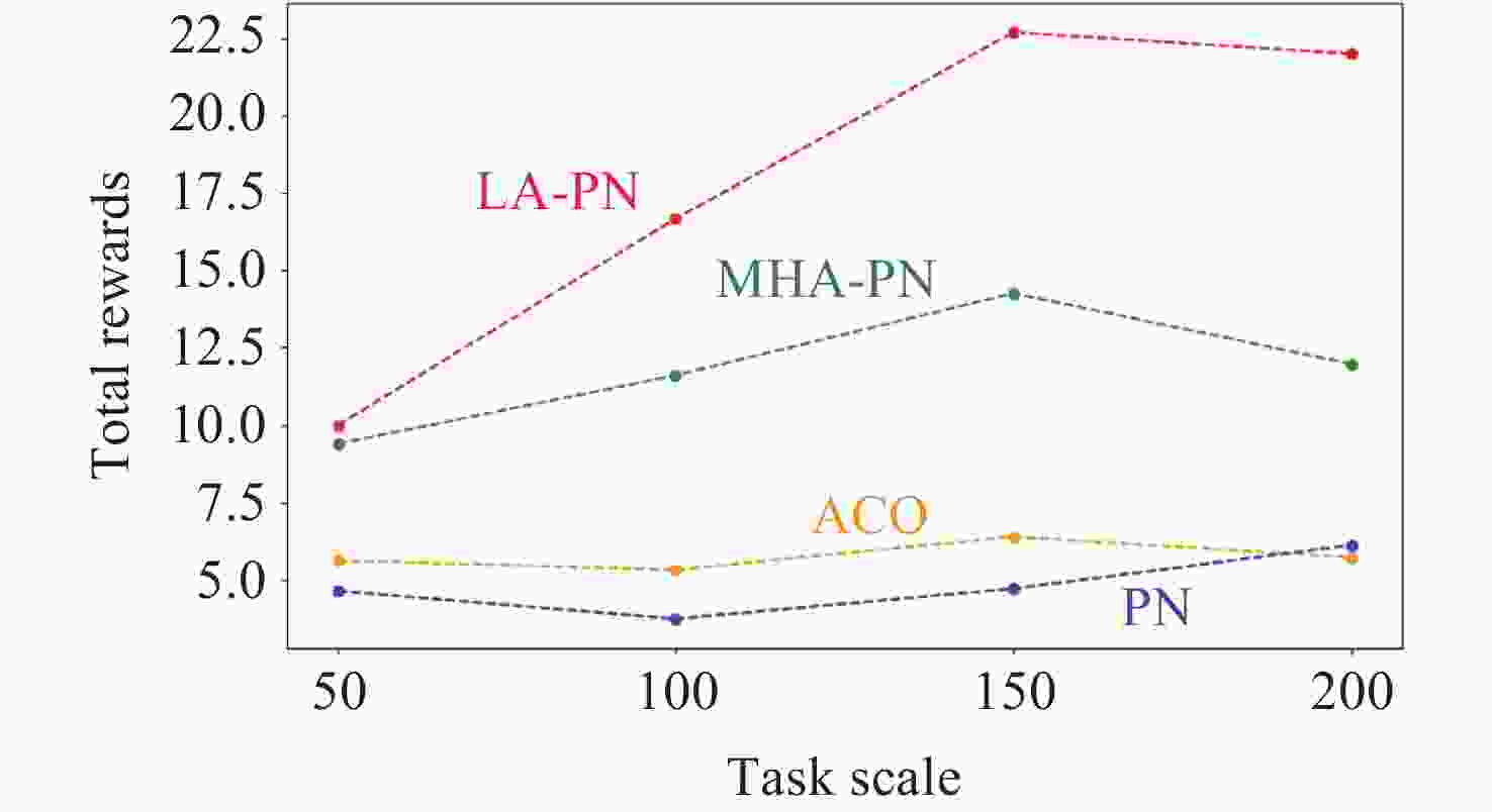 摘要: 以巡天设备每天将探测到数以万计的变源天体以及对变源天体的观测需求增长为背景, 形成了由高频动态到达的机遇目标(ToO)及其后随观测任务组成的长序列任务规划问题. 该问题具有观测事件随机性、数据获取高时效性、可选择性多和约束复杂的特点, 常被视为NP (非确定性多项式)难题, 因此获取监督学习的标签数据不易. 而针对采用无监督学习的深度强化学习(DRL)方法求解长序列任务规划问题时, 卫星作为智能体难以快速收敛至全局最优策略. 为此本文借鉴局部注意力(LA)机制的思想对指针网络(PN)进行改进, 提出局部注意力指针网络(LA-PN)算法. 该算法通过引入时间窗口的方式, 使模型专注于对当前决策有重要影响的序列部分, 减少了无效探索. 通过仿真结果对比分析, 验证算法的收益性、实时性和泛化性.Abstract: Based on the background where sky survey equipment detects tens of thousands of variable sources daily and the demand for observing these variable sources increases, a long-sequence task planning problem is formed. This problem comprises dynamically arriving high-frequency Targets of Opportunity (ToO) and their subsequent follow-up observation tasks. This type of problem is classified as an NP hard problem due to the randomness of observation events, strong timeliness of data acquisition, high selectivity of decision paths, and the coupling effect of complex constraints such as Earth occlusion and observation time windows. Traditional supervised learning methods are difficult to apply due to the difficulty in obtaining high-quality labeled data, while Deep Reinforcement Learning (DRL) combines the perceptual ability of deep learning with the sequential decision optimization mechanism of reinforcement learning to construct end-to-end autonomous decision-making agents, demonstrating the universal advantage of handling complex planning problems. This article is based on the DRL framework and constructs a Markov Decision Process (MDP) model for long sequence task planning problems. State space encoding, action space encoding, and reward functions are defined in the task planning problem to guide reinforcement learning algorithms to converge towards optimizing the target set. However, classical DRL methods have significant limitations in unsupervised learning mode - when faced with long sequence dynamic task flows, agents have difficulty quickly converging to the global optimal strategy due to the large exploration space, and lack sensitivity to local key tasks. Therefore, this paper improves the Pointer Network (PN) by drawing on the concept of the Local Attention (LA) mechanism, proposing the Local Attention Pointer Network (LA-PN) algorithm. This algorithm innovatively introduces a sliding time window constraint on the attention range, allowing the model to dynamically focus on task subsequences related to the current decision, and filter high-value targets through local context awareness to reduce redundant computation. By comparing and analyzing simulation results, verify the profitability, real-time performance, and generalization of the algorithm.