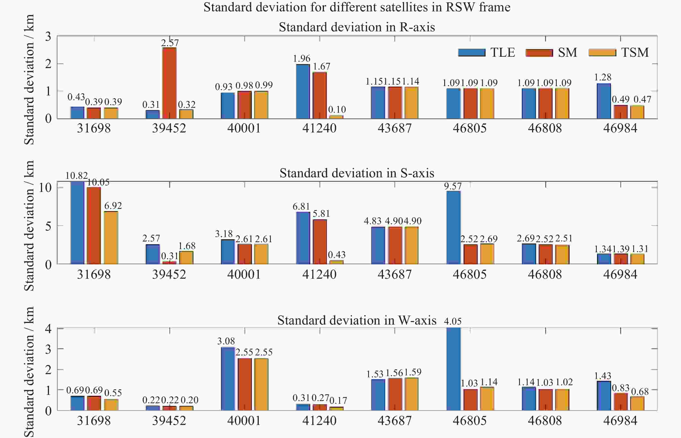 算法 $ {B}' $ $ e $ $ i $ /(°) $ {\varOmega} $ /(°) $ \omega $ /(°) $ M $ /(°) $ n $ /(r·d–1) 定轨结果时刻数据 TLE 7.5814×10–6 2.147×10–4 97.4459 10.8697 17.0107 77.2867 15.19153825 21365.87937972 SM 3.1545×10–5 1.950×10–4 97.4458 10.8702 17.5800 76.7078 15.19155608 21365.87937972 TSM 3.1551×10–5 1.950×10–4 97.4458 10.8701 16.5589 77.1212 15.19155551 21365.87835189 注 $ {B}' $表示弹道系数, $ e $ 表示偏心率, $ i $表示轨道倾角, $ {\varOmega} $表示升交点赤经, $ \omega $表示平近点角, $ M $表示近地点角距, $ n $表示平运动. 表 4 卫星轨道预报标准差