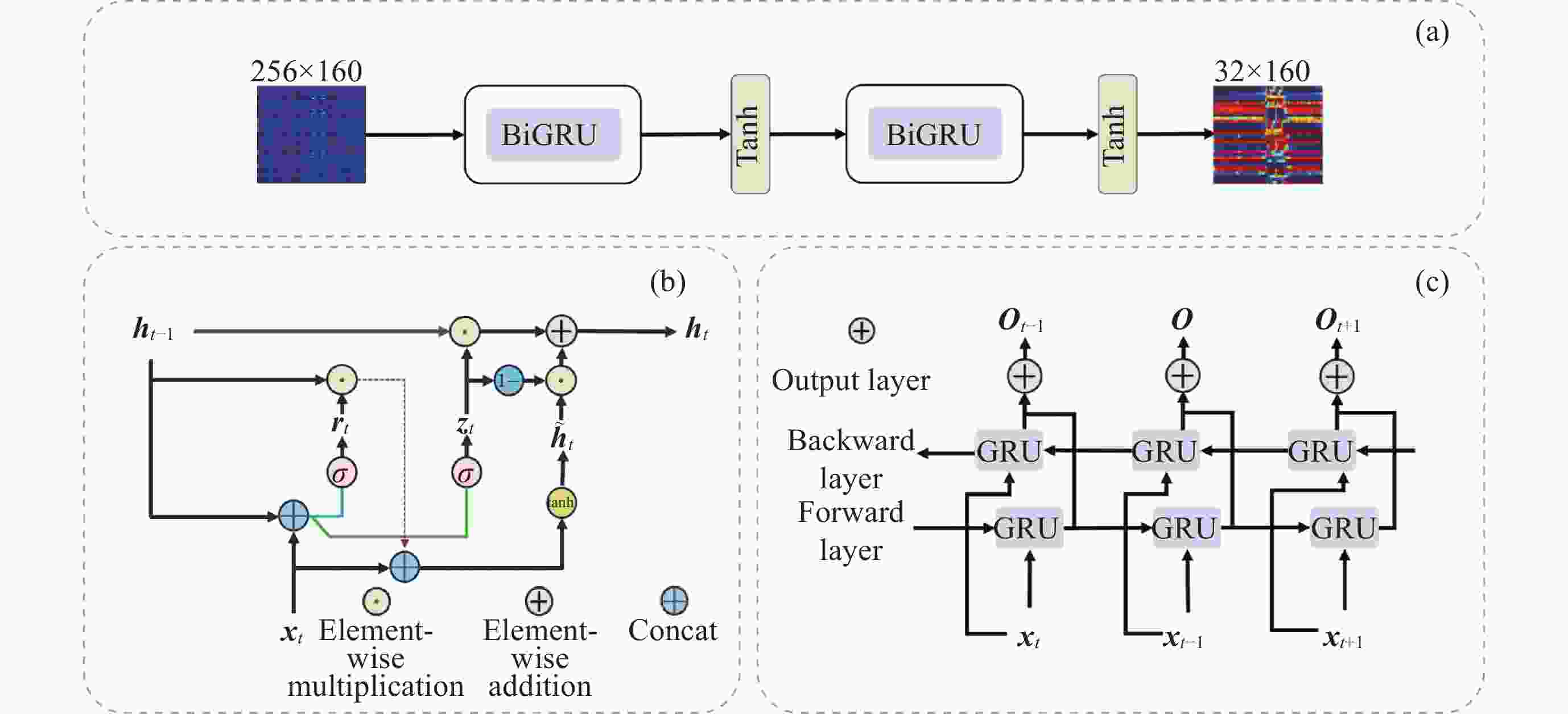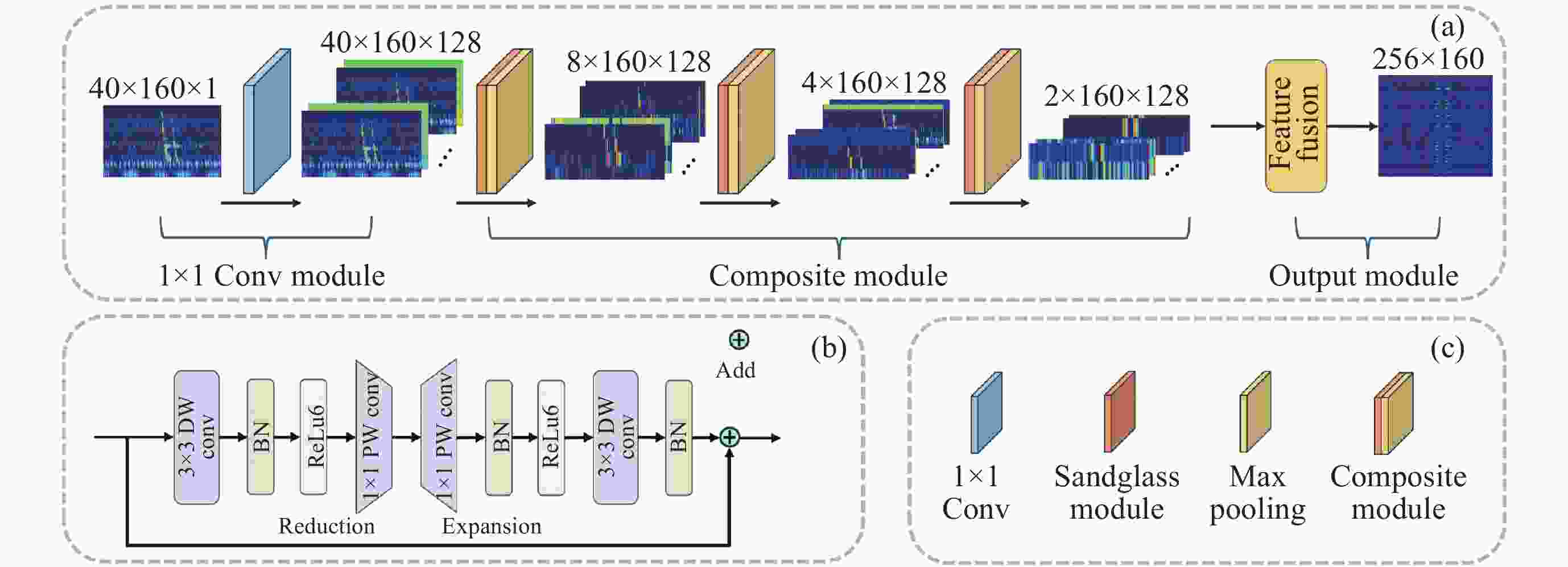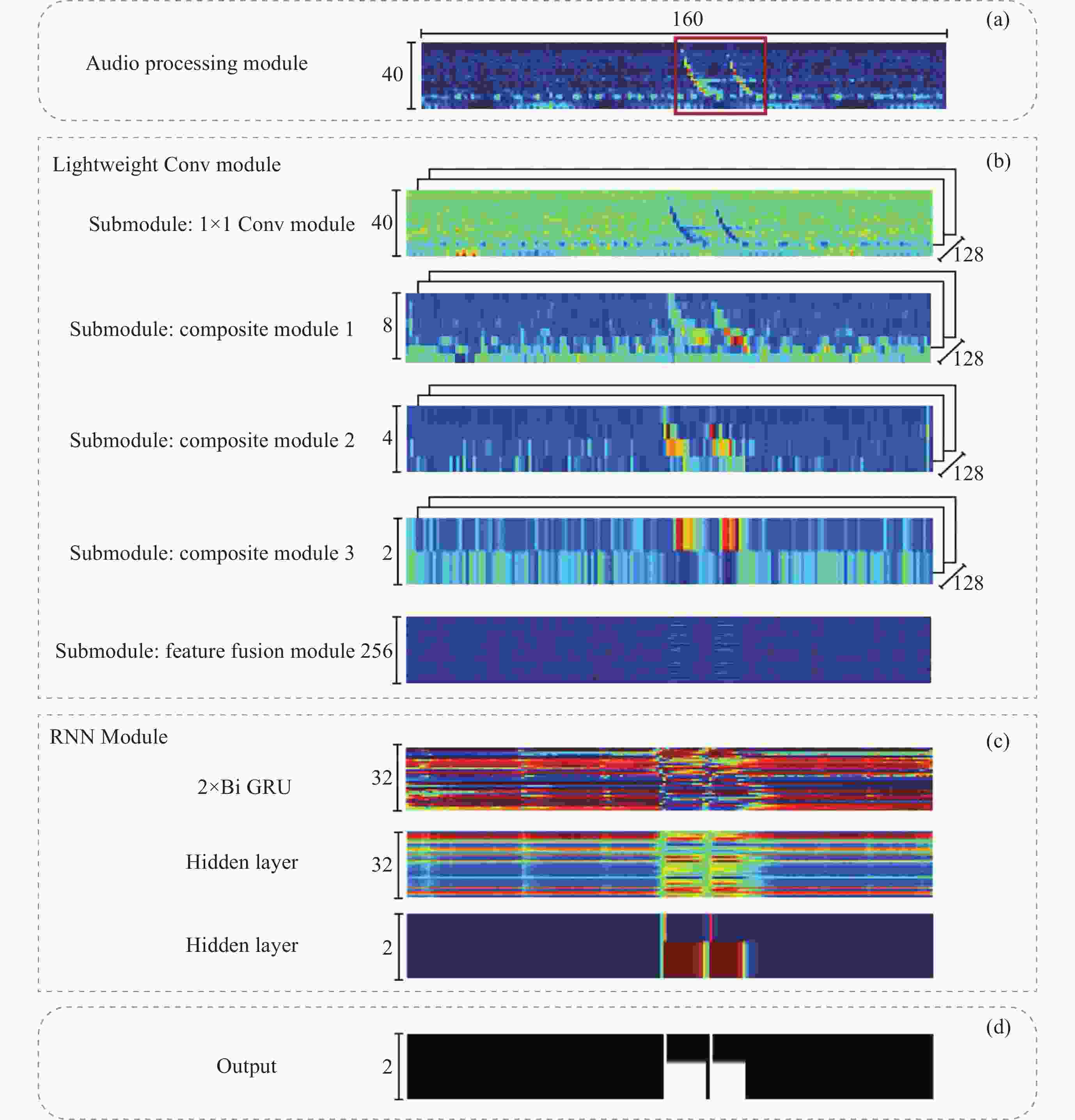 图 9 各模块输出的特征. (a)音频处理模块, (b)轻量化卷积模块, (c)循环神经网络模块, (d)输出模块. 图中数字表示相应特征图的维度