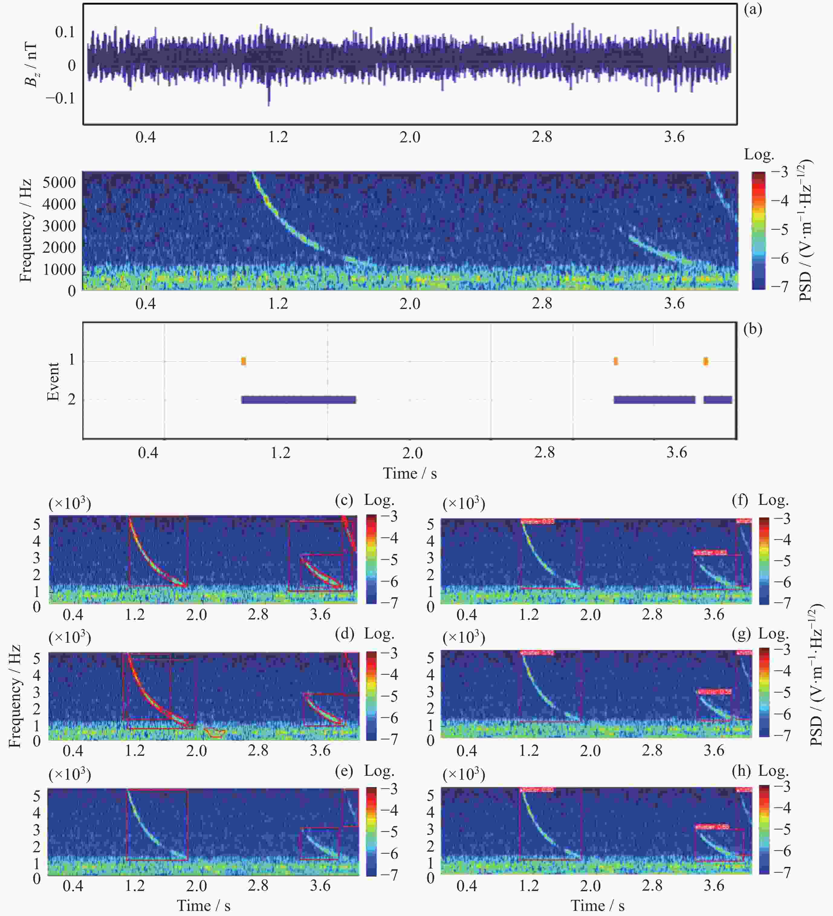 图 6 不同模型检测哨声波的效果. (a)原始波形与时频图, (b) WhisNet, (c) Mask R-CNN, (d) Mask scoring R-CNN, (e) YOLOv5-Upgraded, (f) YOLOv8s, (g) YOLOv8m, (h) YOLOv8l